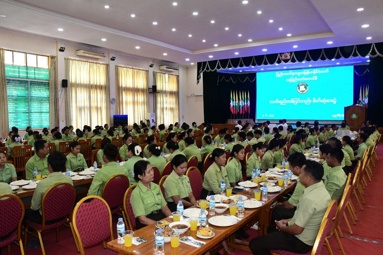ဦးစွာ နေပြည်တော်ကောင်စီဥက္ကဋ္ဌဦးသန်းထွန်းဦးက နေပြည်တော်ကောင်စီရုံးဝန်ထမ်းများမှ လုပ်ငန်းတာဝန်များအပေါ် တာဝန်ကျေပွန်စွာ စည်းကမ်းရှိရှိ၊ သစ္စာရှိရှိ လုပ်ဆောင်နေမှုများကို အသိအမှတ်ပြုအလေးထားပါကြောင်း၊ လုပ်ငန်းများဆောင်ရွက်ရာတွင် မိသားစုစိတ်ဓာတ်ဖြင့် ညီညီညွတ်ညွတ်ဆောင်ရွက်ကြရန်လိုကြောင်း၊ နိုင်ငံတော်နှင့် နေပြည်တော်ဘက်စုံဖွံ့ဖြိုးတိုးတက်ရေးအတွက် ပေးအပ်သည့်တာဝန်များကို ကျေပွန်စွာထမ်းဆောင်ရင်း တွေ့ကြုံရမည့် စိန်ခေါ်မှုများ၊ အခက်အခဲများကို စုပေါင်းအားဖြင့် ကျော်လွှားနိုင်အောင် ကြိုစားဆောင်ရွက်ရန်လိုကြောင်း၊ တာဝန်ထမ်းဆောင်နေသည့် ဝန်ထမ်းများအချင်းချင်း ချစ်ကြည်ရင်းနီးမှုပိုမိုရရှိစေရန်နှင့် နွေးထွေးသည့်ဆက်ဆံရေးများ ရှိစေရန်အတွက်ဖြစ်ကြောင်း၊ ဝန်ထမ်းများအနေဖြင့် တာဝန်ထမ်းဆောင်ရာတွင် ထုတ်ပြန်ထားသည့် ဥပဒေ၊ နည်းဥပဒေ၊ အမိန့်၊ ညွှန်ကြားချက်များ၊ လုပ်ထုံးလုပ်နည်းများနှင့်အညီ စနစ်တကျဆောက်ရွက်ကြရန်လိုကြောင်း၊ အမျိုးသားရေးရည်မှန်းချက်နှစ်ရပ်ဖြစ်သည့် တိုင်းပြည်သာယာဝပြောရေးနှင့် စားရေရိက္ခာဖူလုံရေးအတွက် ဝန်ထမ်းများအနေဖြင့် မိမိတို့အား ပေးအပ်သည့်တာဝန်များကို ကျေပွန်အောင် ထမ်းဆောင်သွားကြရန်လိုကြောင်း ပြောကြားခဲ့သည်။ ယင်းနောက် တက်ရောက်လာကြသည့် နေပြည်တော်ကောင်စီဝင်များ၊ နေပြည်တော်ကောင်စီရုံးဝန်ထမ်းများနှင့်အတူ နေ့လယ်စာအတူတကွ သုံးဆောင်ခဲ့သည်။