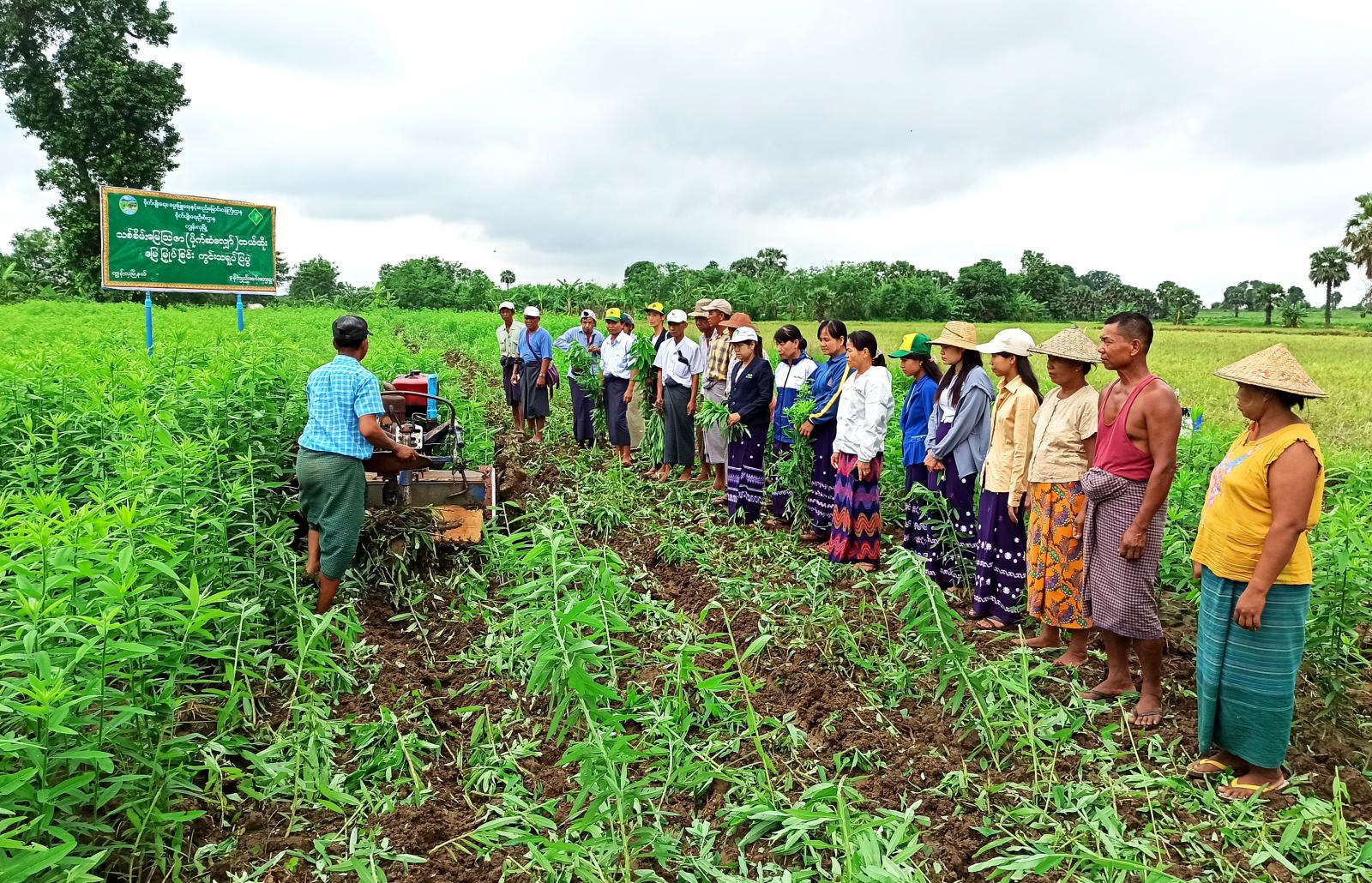 ဦးစွာ ကန့်ဘလူခရိုင် စိုက်ပျိုးရေးဦးစီးဌာန၊ ဦးစီးမှူး ဒေါ်လှကြိုင်နှင့် တာဝန်ရှိသူတို့က သစ်စိမ်းမြေဩဇာ (ပိုက်ဆံလျှော်) စိုက်ပျိုးပြီး ထယ်ထိုးမြှပ်နှံရမည့် အသင့်တော်ဆုံး အချိန်ကာလနှင့် ရရှိနိုင်သောအကျိုးကျေးဇူးများကို ရှင်းလင်းသည်။