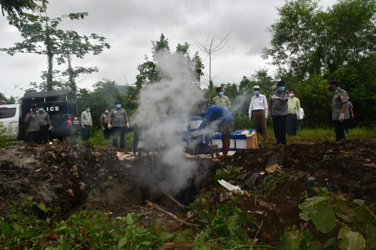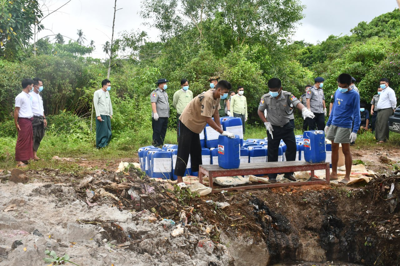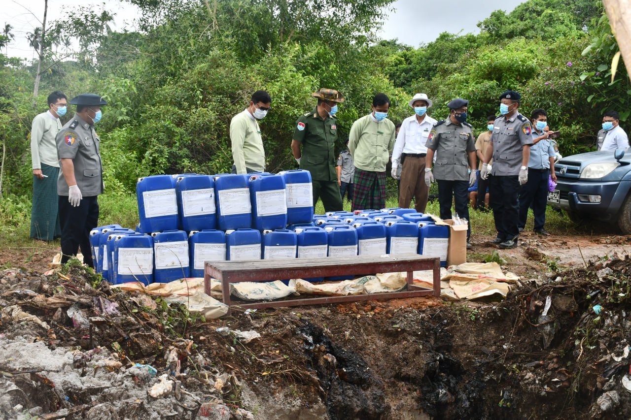တနင်္သာရီတိုင်းဒေသကြီး၊ ကော့သောင်းခရိုင်၊ ကော့သောင်းမြို့နယ်၊ ကော့သောင်းမြို့မ ရဲစခန်း မယ(ပ)၇၇/၂၀၂၄ အမှုမှ သက်သေခံပစ္စည်း Sulphuric Acid ၁,၇၅၀ ကီလိုဂရမ်ခန့်အား မြေကျင်းတူး၍ ဒေသတွင်းမြေမြှုပ်ဖျက်ဆီးခြင်းကို ယမန်နေ့နံနက်ပိုင်းက ကော့သောင်းမြို့နယ်၊ ဆယ်မိုင်ကျေးရွာအုပ်စုရှိ မြို့နယ်စည်ပင်သာယာရေးအဖွဲ့မှ အမှိုက်စွန့်ပစ်သည့်နေရာအနီးတွင် လုပ်ထုံးလုပ်နည်းများနှင့်အညီ ဆောင်ရွက်ခဲ့ကြသည်။