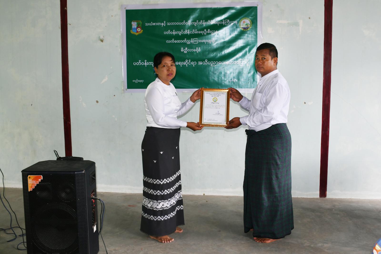ဆက်လက်၍ ၂၀၂၄-၂၀၂၅ ဘဏ္ဍာနှစ်တွင်ကျင်းပပြုလုပ်ခဲ့သည့် ပတ်ဝန်းကျင်စီမံခန့်ခွဲမှု ကောင်းမွန်သော ကျေးရွာစီမံကိန်းပြိုင်ပွဲတွင် ဂုဏ်ပြုဆုရရှိခဲ့သည့် မယ်ဇလီအိုင့်ကျေးရွာအား ဆုလက်မှတ်ကို ပေးအပ်ချီးမြှင့်ရာ ကျေးရွာအုပ်စုအုပ်ချုပ်ရေးမှူး ဦးအောင်နိုင်ထွေးက လက်ခံရယူခဲ့ကြောင်း၊ ပလတ်စတစ်အန္တရာယ်ကာကွယ်ရေးအတွက် ပြန်လည်ဆွေးနွေးနိုင်သည့် ကျေးရွာပြည်သူများကိုလည်း အမှတ်တရလက်ဆောင်များ ပေးအပ်ခဲ့ကြောင်း သိရသည်။