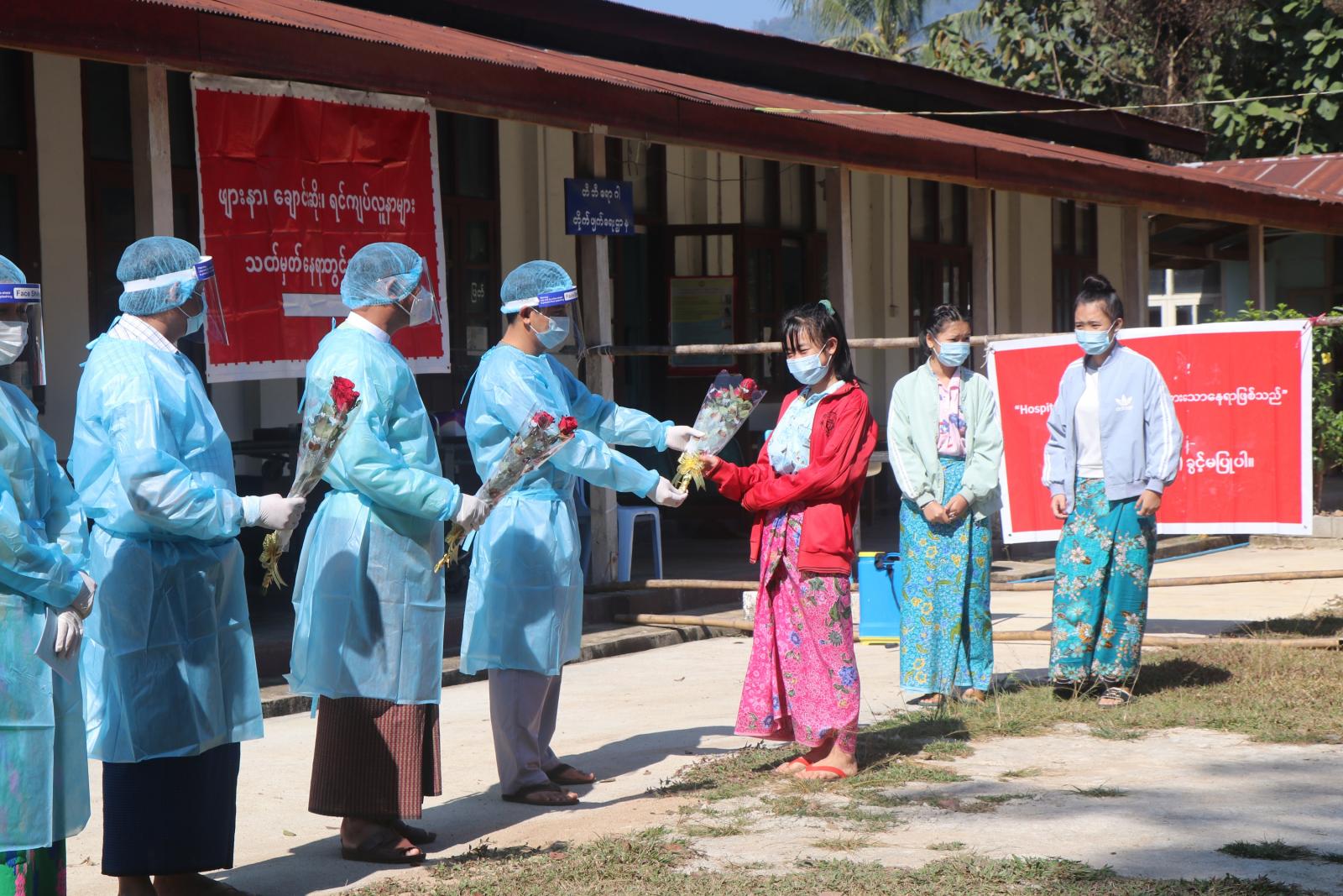 ထိုသို့ ကိုဗစ်-၁၉အတည်ပြုလူနာ ၃ ဦးဆေးရုံဆင်းရာသို့ မြို့နယ်ကိုဗစ်-၁၉ရောဂါ ကာကွယ်၊ ထိန်းချုပ်၊ ကုသရေးကော်မတီ ဥက္ကဋ္ဌ ဦးသက်လွင်၊ အတွင်းရေးမှူး မြို့နယ်ပြည်သူ့ကျန်းမာရေးဦးစီးဌာနမှ ဒေါက်တာကျော်မျိုးဇော်နှင့် သွားဘက်ဆိုင်ရာဆရာဝန် ဒေါက်တာသိန်းဦးတို့က အမှတ်တရ ပန်းစည်းများ ပေးပြီး အားပေးစကားများပြောကြားခဲ့သည်။ ထို့နောက် လက်ထောက်ဆရာဝန် ဒေါက်တာ စုစုလှိုင်က ဆေးရုံဆင်းလက်မှတ်များကိုပေးအပ်ခဲ့သည်။ ယင်းနောက် မြန်မာနိုင်ငံကျန်းမာရေးမှူးအသင်းမှ မြို့နယ် စီမံချက်ညှိနှိုင်းရေးမှူး ဦးမျိုးကိုက တစ်ဦးလျှင် ထောက်ပံ့ငွေ ကျပ်၄သောင်းကိုပေးအပ်ခဲ့သည်။