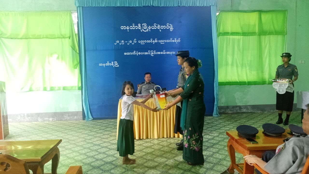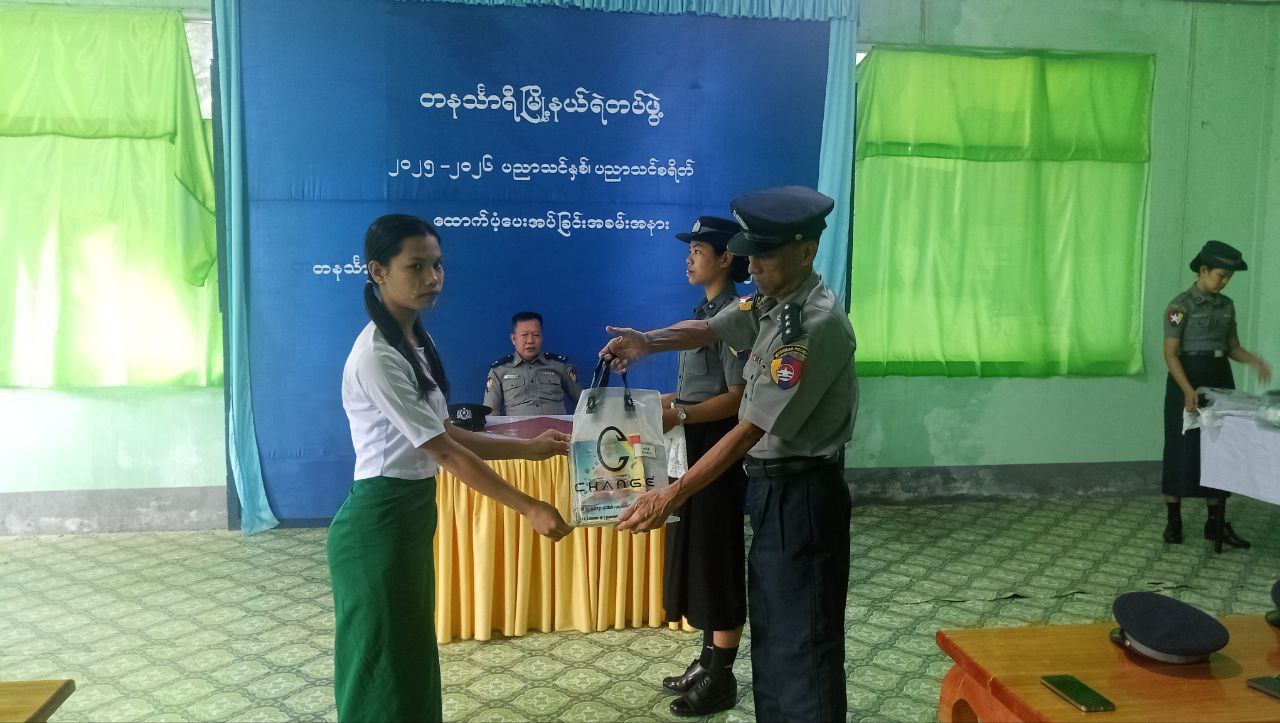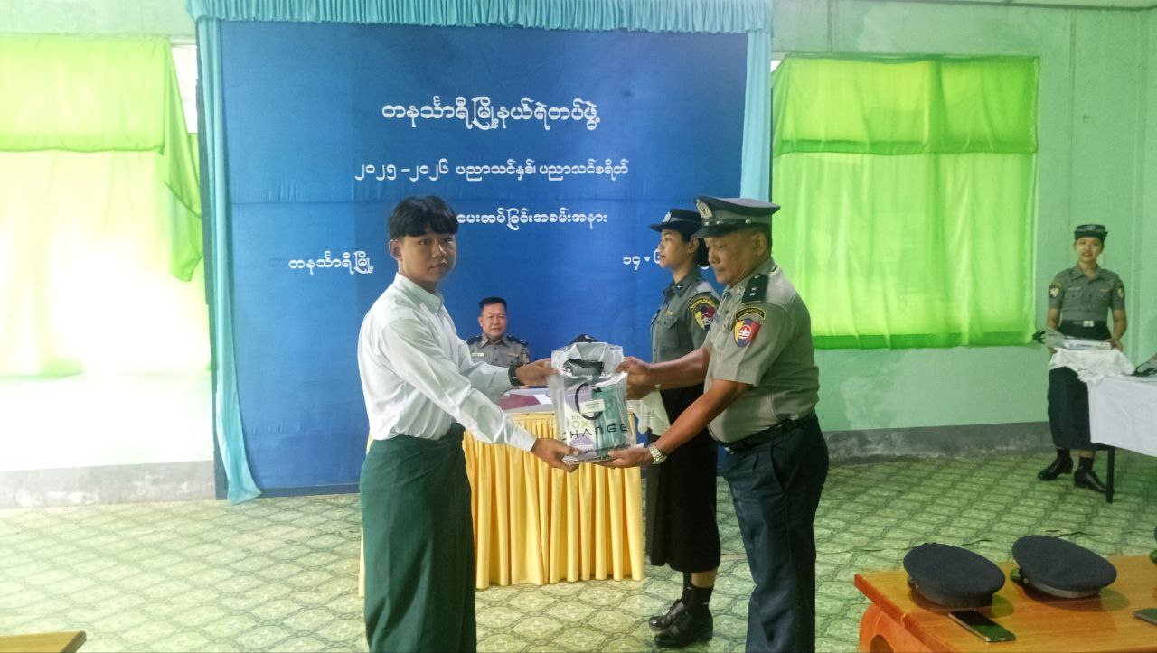 တနင်္သာရီတိုင်းဒေသကြီး၊ တနင်္သာရီမြို့နယ် ရဲတပ်ဖွဲ့မှူးရုံးမှ မြို့နယ်ရဲတပ်ဖွဲ့ မိသားစုဝင် ကျောင်းသူ/သား(၂၈)ဦးတို့အား ၂၀၂၅-၂၀၂၆ ပညာသင်နှစ်အတွက် ပညာသင်စရိတ်ချီးမြှင့်ငွေ၊ စာရေးကိရိယာနှင့် ကျောင်းသုံးဗလာစာအုပ်များ ပေးအပ်ပွဲအခမ်းအနားကို ယမန်နေ့ နံနက် ၉ နာရီအချိန်က တနင်္သာရီမြို့မရဲစခန်း အစည်းအဝေးခန်းမအတွင်း ကျင်းပရာ အခမ်းအနားသို့ မြို့နယ်ရဲတပ်ဖွဲ့မှူး ယာယီရဲမှူး မင်းအောင်နှင့် အရာရှိများ/အခြားအဆင့် တပ်ဖွဲ့ဝင်များနှင့် ရဲတပ်ဖွဲ့ မိသားစုဝင်များ၊ တပ်ဖွဲ့ဝင်မိသားစုကျောင်းသူ/သားများ တက်ရောက်ခဲ့ကြောင်း သိရသည်။
