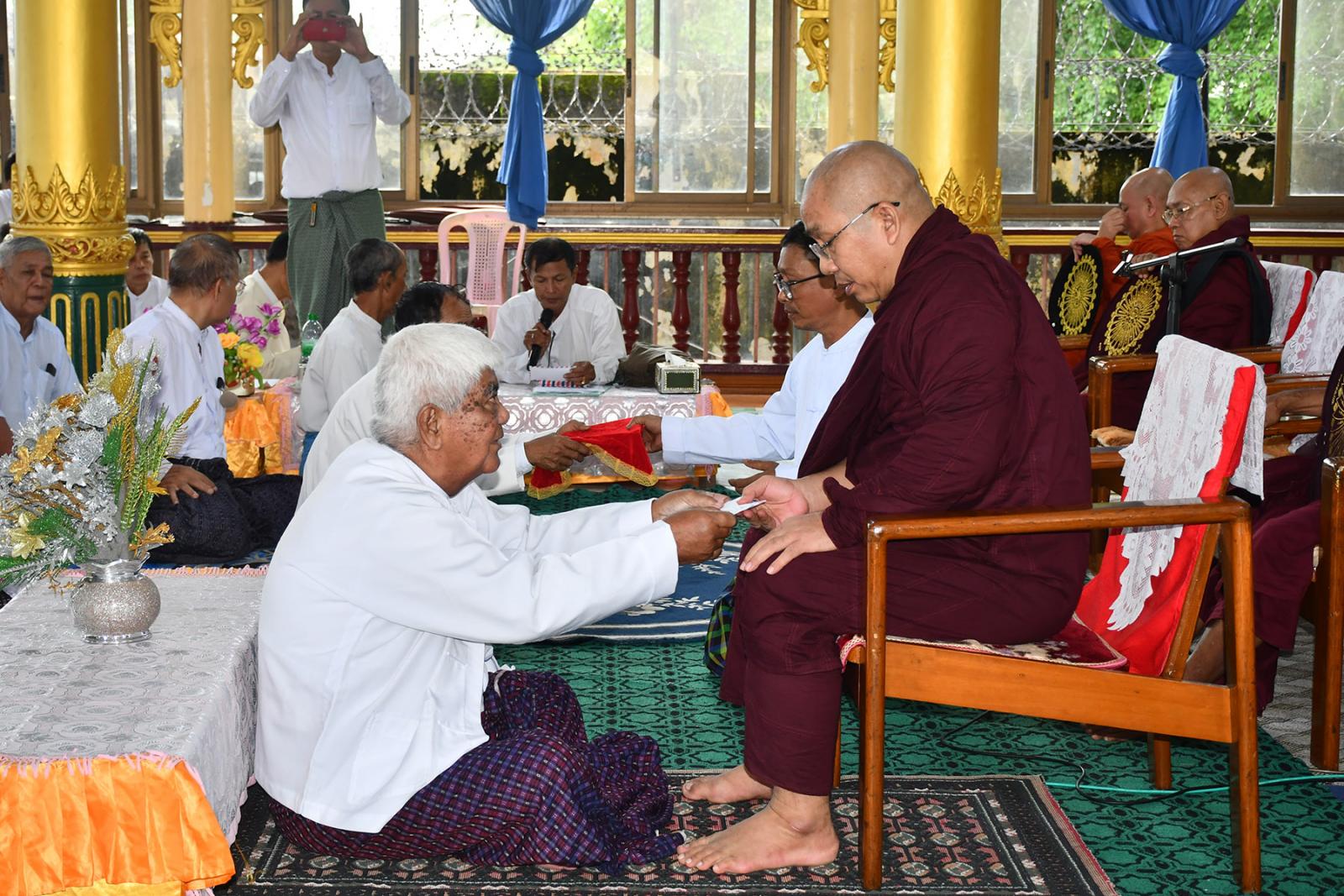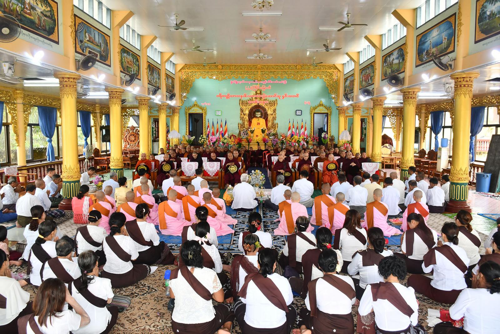 ဆုနှင်းသဘင်ကို ဆရာတော်၊ သံဃာတော်များ၊ သီလရှင်များ၊ ဘဏ္ဍာတော်ထိန်းဂေါပကအဖွဲ့ဝင်များနှင့် ဧည့်ပရိတ်သတ်များက နမောတဿ သုံးကြိမ်ရွတ်ဆို ဘုရားကန်တော့၍ ဖွင့်လှစ်ခဲ့ကြပြီး နိုင်ငံတော်ဩဝါဒါစရိယ အဘိဓဇမဟာရဌဂုရု ဘဒ္ဒန္တလာသန လှည်းဘီးပရိယတ္တိစာသင်တိုက်ဆရာတော်ထံမှ ဧည့်ပရိတ်သတ်များက ငါးပါးသီလခံယူဆောက် တည်ကြသည်။