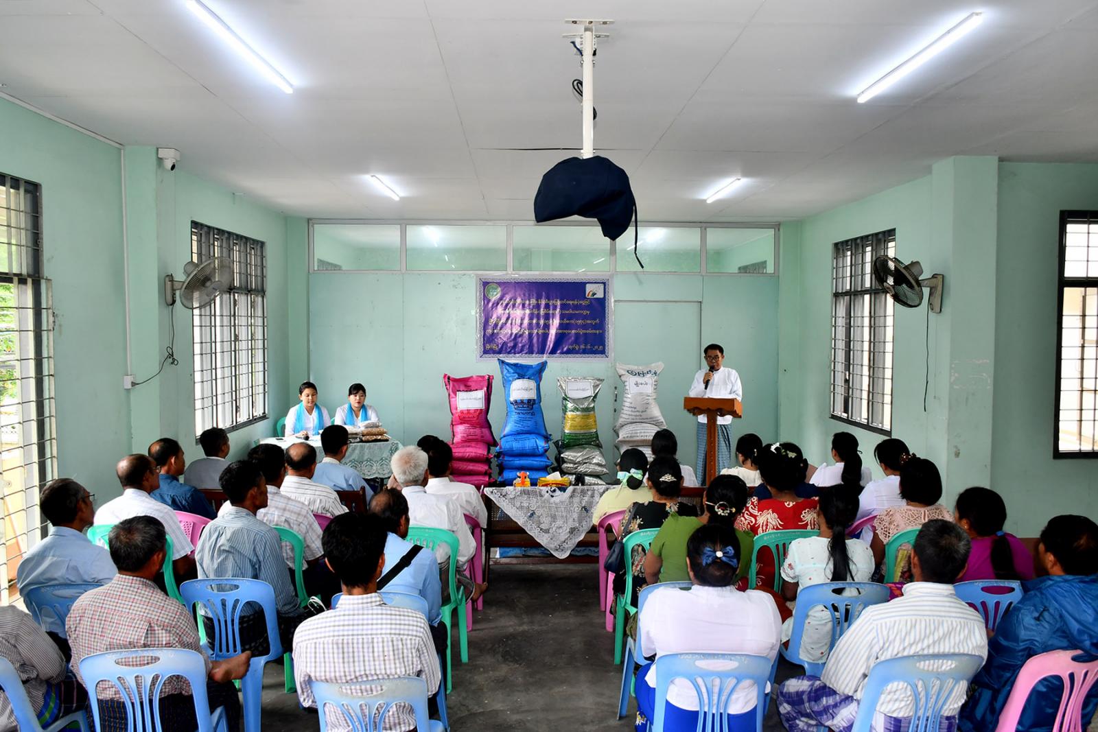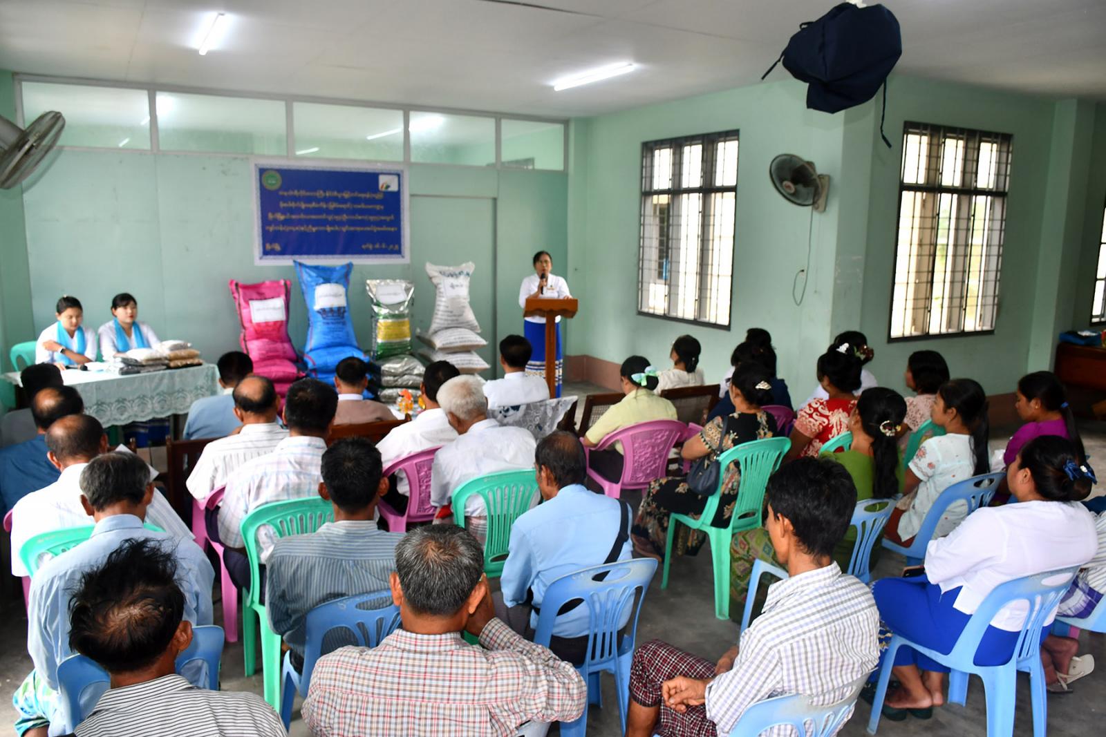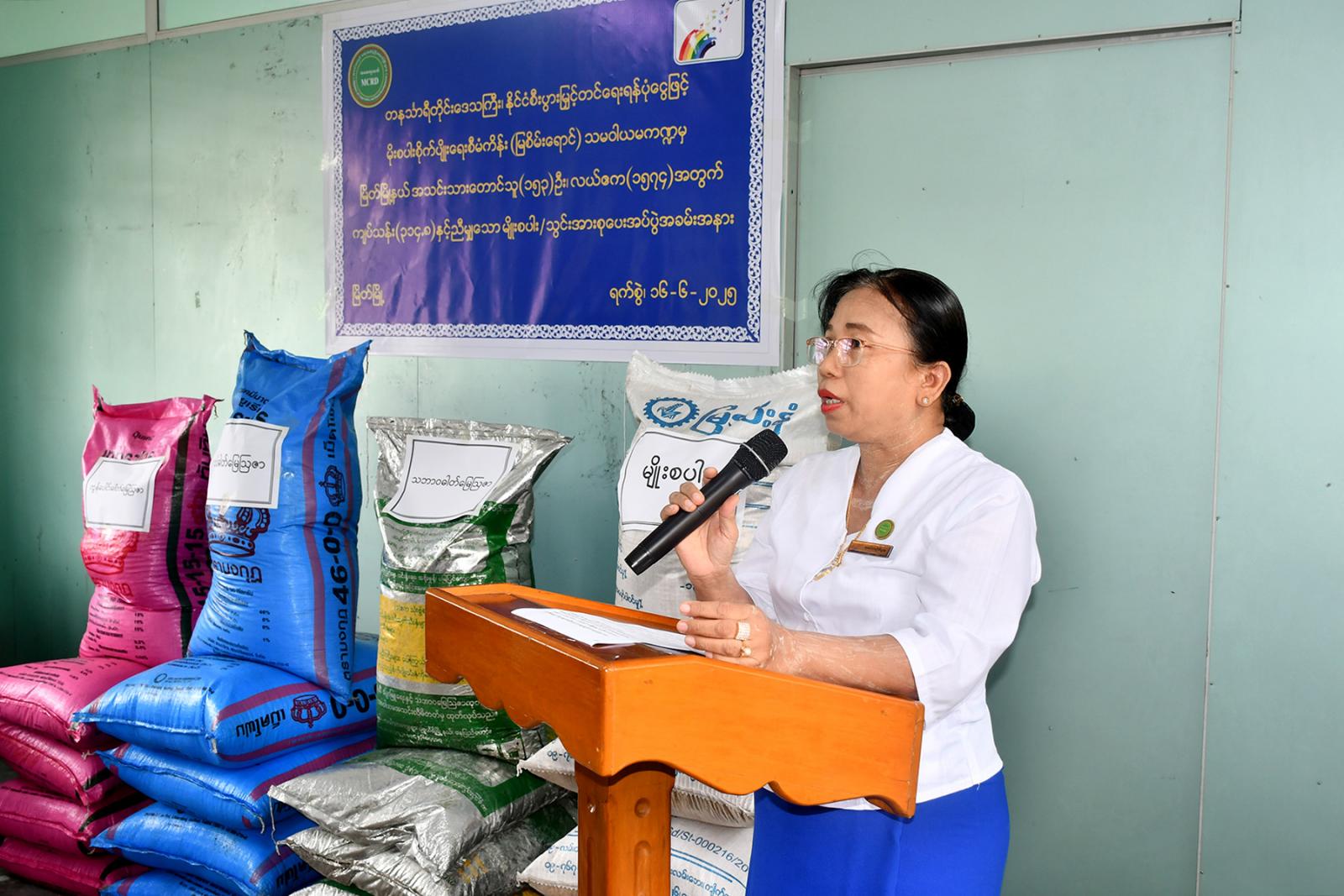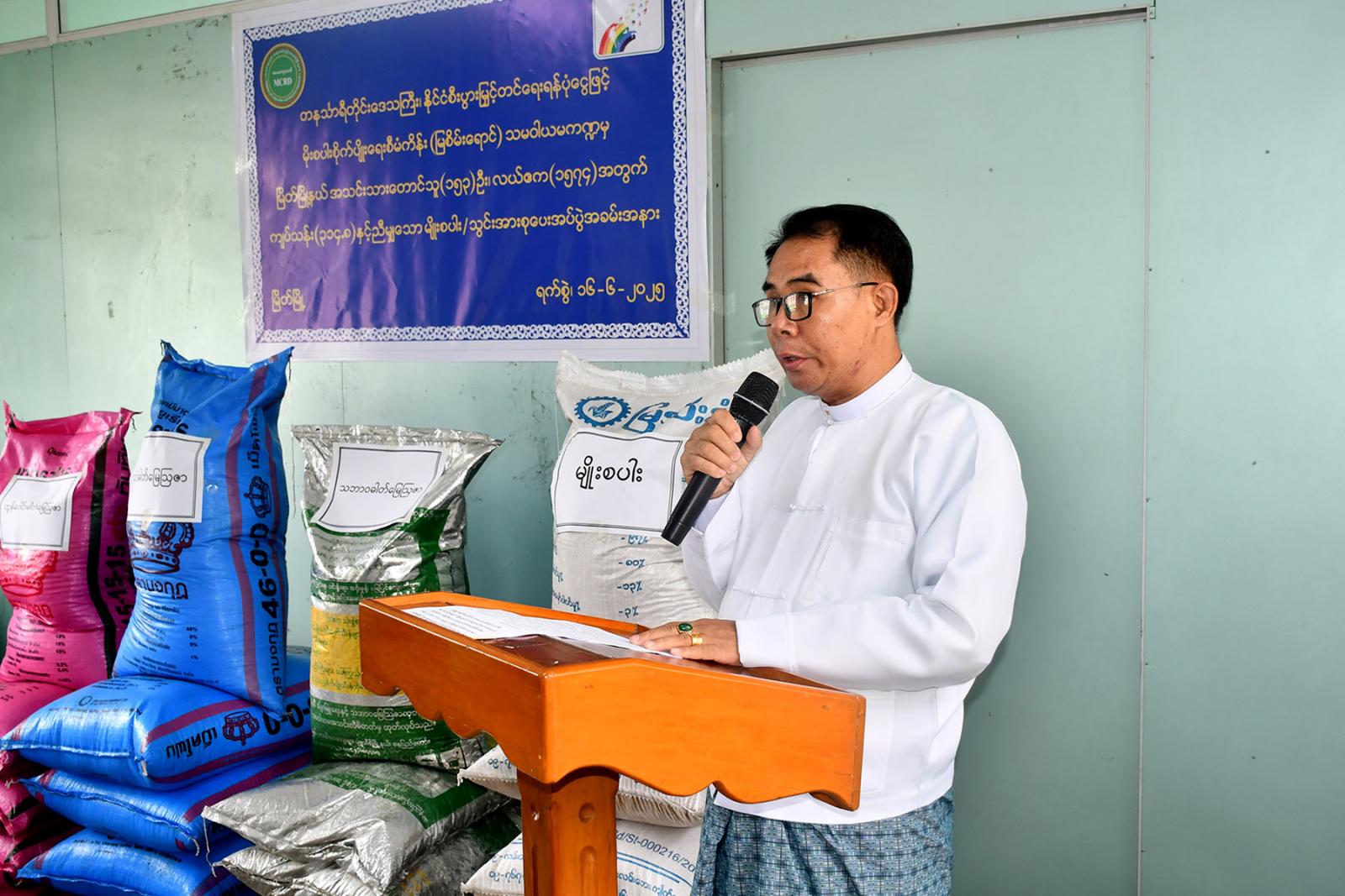 မျိုးစပါး၊ သွင်းအားစုပေးအပ်ပွဲ၌ မြို့နယ်စီမံအုပ်ချုပ်ရေးအဖွဲ့ အဖွဲ့ဝင် ဦးသောင်းအေးက အမှာစကား ပြောကြားပြီး မြို့နယ်သမဝါယမဦးစီးဌာန ဦးစီးအရာရှိ ဒေါ်စမ်းစမ်းမိုးက မျိုးစပါးသွင်းအားစုများပေးအပ်ရခြင်းနှင့်ပတ်သက်၍ ရှင်းလင်းပြောကြားသည်။ ထို့နောက် မြို့နယ်သမဝါယမအသင်းစု ဒု-ဥက္ကဋ္ဌ ဦးထွန်းမင်က သမဝါယမအသင်းသား၊ တောင်သူများ၏ မိုးစပါးစိုက်ပျိုးဆောင်ရွက်နေမှု အခြေအနေများကို ရှင်းလင်းတင်ပြသည်။