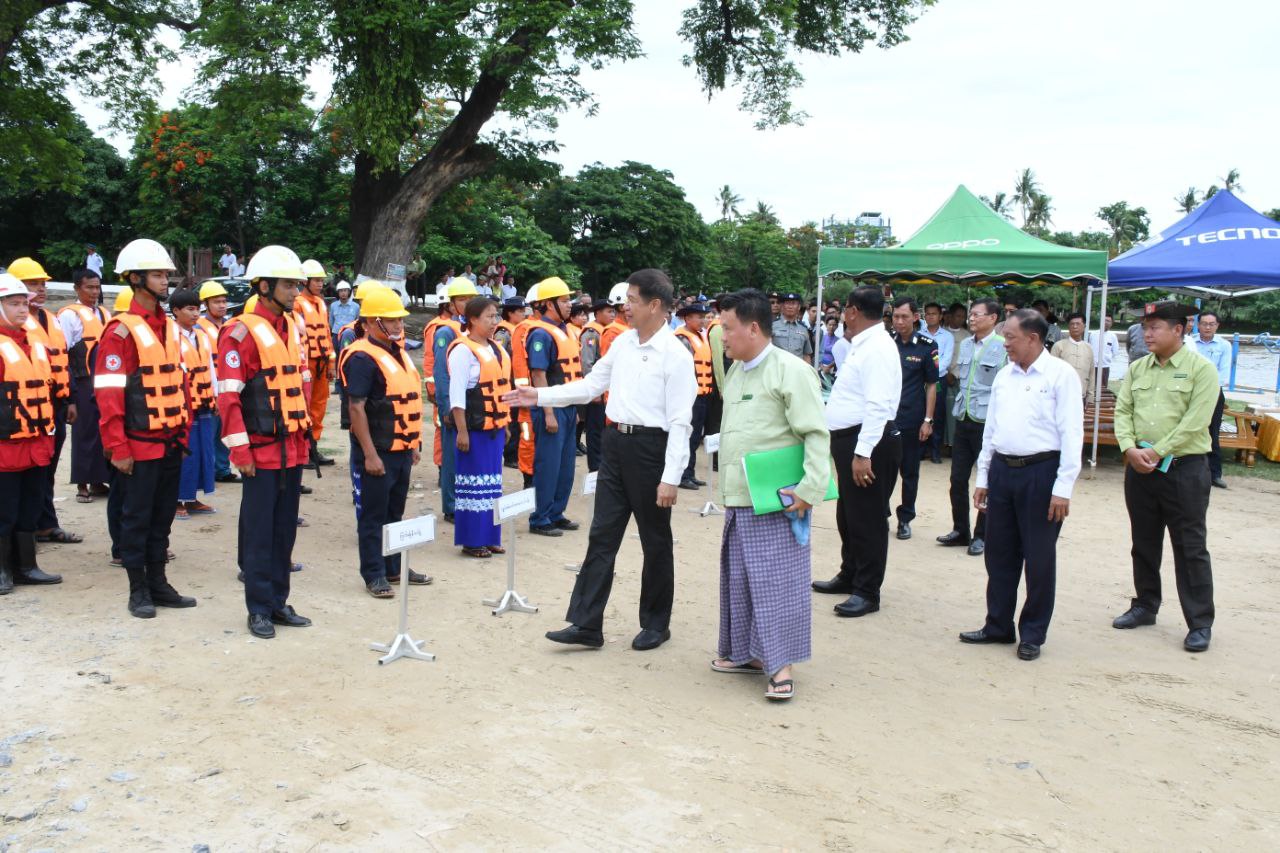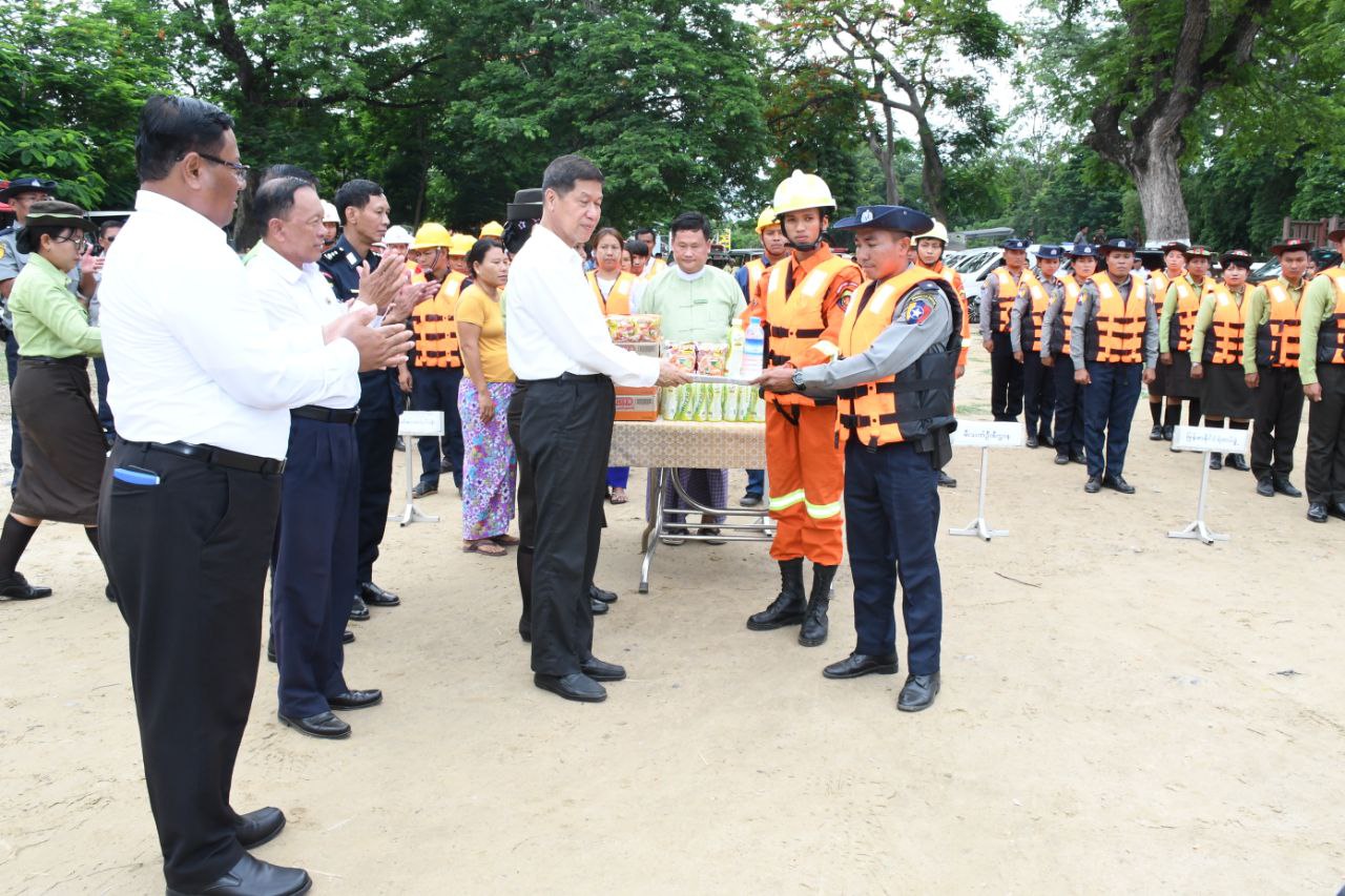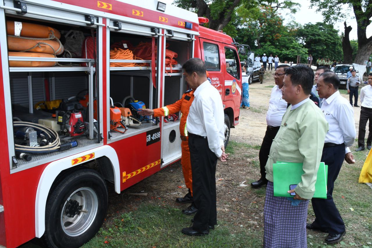 ထို့နောက် မန္တလေးတိုင်းဒေသကြီးအစိုးရအဖွဲ့ဝန်ကြီးချုပ် ဦးမျိုးအောင်နှင့် အစိုးရအဖွဲ့ဝန်ကြီးများက ရှာဖွေကယ်ဆယ်ရေးလုပ်ငန်းသုံးပစ္စည်းများ၊ စက်ယန္တရားများ ခင်းကျင်းပြသထားမှုများအားကြည့်ရှု အားပေးခဲ့ပြီး ကယ်ဆယ်ရေးသရုပ်ပြတပ်ဖွဲ့ဝင်များအား ဂုဏ်ပြုချီးမြှင့်ငွေနှင့် စားသောက်ဖွယ်ရာများ ပေးအပ်ခဲ့ကြောင်းနှင့် ရေဘေးအန္တရာယ်သဏ္ဍာန်တူသရုပ်ပြ ပြည်သူများအား အသုံးအဆောင်ပစ္စည်းများ ပေးအပ်ခဲ့ကြောင်း သိရသည်။