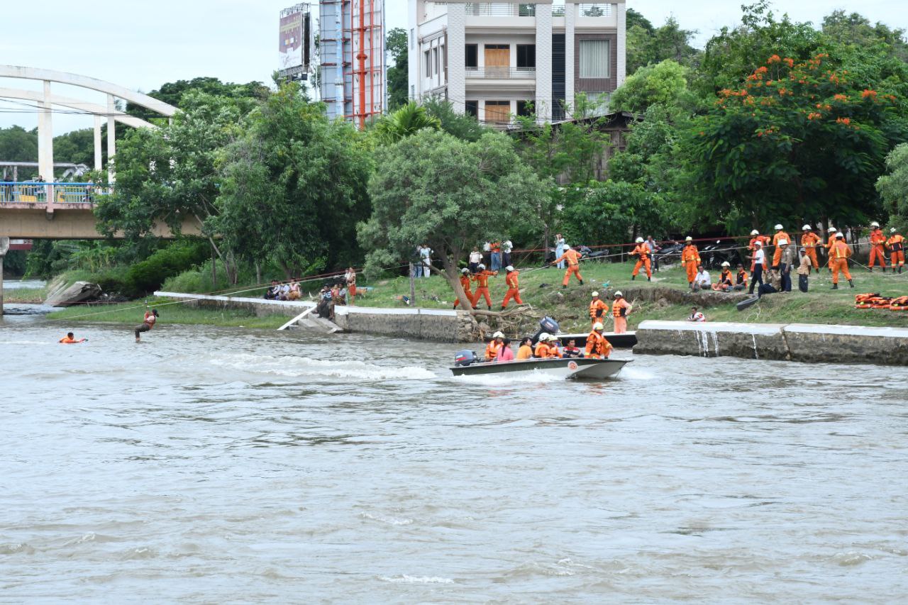 အဆိုပါ ရေဘေးအန္တရာယ်သဏ္ဍာန်တူ ဇာတ်တိုက်လေ့ကျင့်ခြင်းအခမ်းအနားကို မန္တလေးတိုင်းဒေသကြီးအစိုးရအဖွဲ့ ဝန်ကြီးချုပ်ဦးမျိုးအောင်နှင့် အစိုးရအဖွဲ့ဝန်ကြီးများ၊ ခရိုင်စီမံအုပ်ချုပ်ရေးအဖွဲ့ဥက္ကဋ္ဌ ဦးကောင်းမြတ်နိုင်နှင့်အဖွဲ့ဝင်များ၊ ဌာနဆိုင်ရာများ၊ လူမှုရေးအသင်းအဖွဲ့များနှင့် ပြည်သူများ တက်ရောက်ခဲ့ပြီး ခရိုင်မီးသတ်ဦးစီးဌာနမှ လက်ထောက်ညွှန်ကြားရေးမှူး ဦးစောလွင်အေးမှ ဦးဆောင်ကာ ရေးဘေးအန္တရာယ်ကျရောက်သည့်အခါ အလျှင်အမြန်တုံ့ပြန်ဆောင်ရွက်နိုင်ရေး Hand Speaker အသုံးပြု၍ သတိပေးနှိုးဆော်ခြင်း၊ ရေဘေးသင့်သူများအား ဘေးလွတ်ရာသို့ ရွှေ့ပြောင်းခြင်း၊ ပိတ်မိနေသူများအား ဘေးလွတ်ရာနေရာသို့ ကယ်ဆယ်ခြင်းများ လေ့ကျင့်ဆောင်ရွက်ခဲ့ကြောင်းသိရသည်။