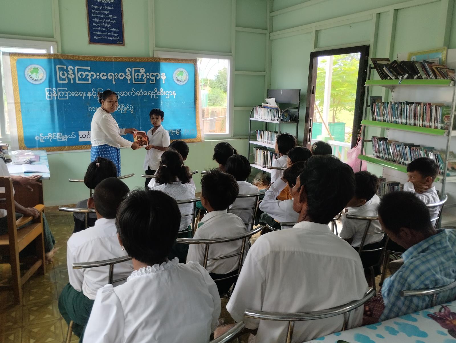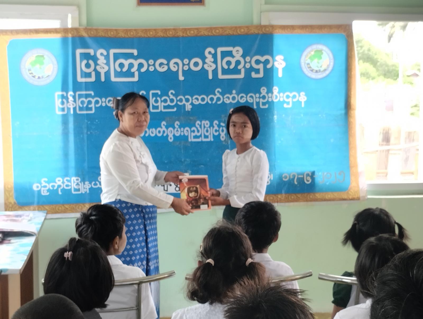ယင်းနောက်ဆုရရှိသော ပြိုင်ပွဲဝင် ကျောင်းသား/သူများအား မြို့နယ်ဦးစီးမှူးနှင့် တာဝန်ရှိသူများက ကျောင်းသုံးဗလာစာအုပ်၊ ခဲတံဘူး၊ ရောင်စုံခဲတံနှင့် ဆေးရောင်ခြယ်စာအုပ်များ ပေးအပ်ချီးမြှင့်ခဲ့ ကြောင်းသိရှိရပြီး တက်ရောက်လာသော စာကြည့်တိုက်ကော်မတီဝင်များနှင့် ကျောင်းသား/သူများက အသိပညာပေး နံရံကပ်စာစောင်များကို စိတ်ပါဝင်စားစွာ လေ့လာကြည့်ရှုခဲ့ကြကြောင်း သိရသည်။