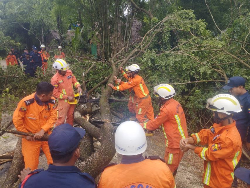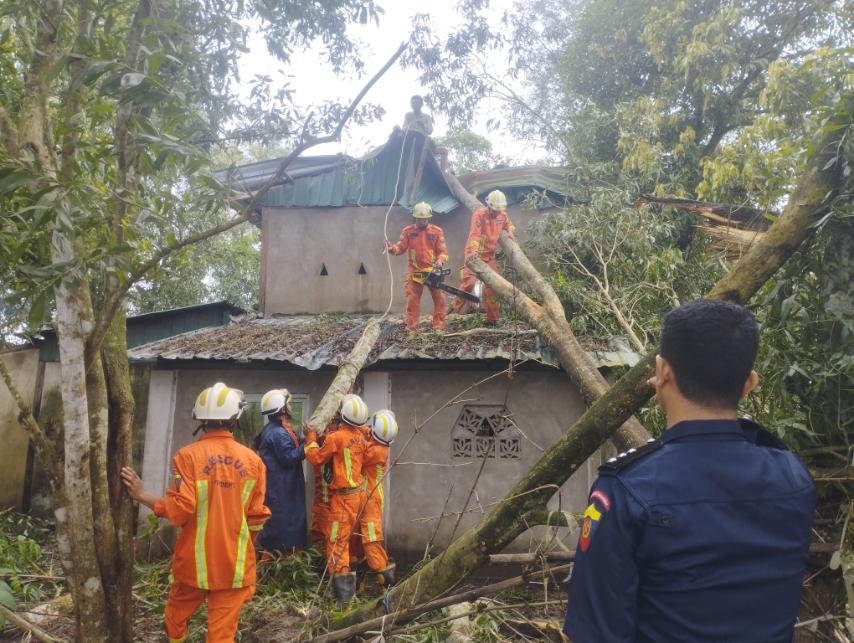 ဖြစ်ပွားရာနေရာသို့ မြို့နယ်မီးသတ်ဦးစီးမှူးရုံးမှ မြို့နယ်မီးသတ်ဦးစီးမှူး ဦးဇော်ချစ်ထက် ဦးဆောင်၍ သန္ဓေမီးသတ်တပ်ဖွဲ့ဝင် ၈ ဦး၊ အရန်မီးသတ်တပ်ဖွဲ့ဝင် ၂၀ ဦးတို့က အမိုးလန်ပျက်စီးသော နေအိမ် ၆ လုံးမှ မိသားစုဝင်များအား ရှာဖွေကယ်ဆယ်၍ ဘေးလွတ်ရာသို့ ရွှေ့ပြောင်းပေးခြင်း၊ နေအိမ်တစ်လုံးပြိုကျနေမှုအား ဖယ်ရှားရှင်းလင်းခြင်းနှင့် ပိုင်ရှင်ဦးအောင်မင်းစိန်၏ (၂၀x၃၀)ပေ သွပ်မိုး၊ အုတ်ကာ၊ ကွန်ကရစ်ခင်းနေအိမ်ခေါင်မိုးပေါ်သို့ လုံးပတ် ၂ ပေ၊ အမြင့် ၆၀ ပေရှိ လဲကျနေသည့် မလေးရှားပိတောက်ပင်အား ဖယ်ရှားရှင်းလင်းခြင်းလုပ်ငန်းများ ဆောင်ရွက်ခဲ့သည်။