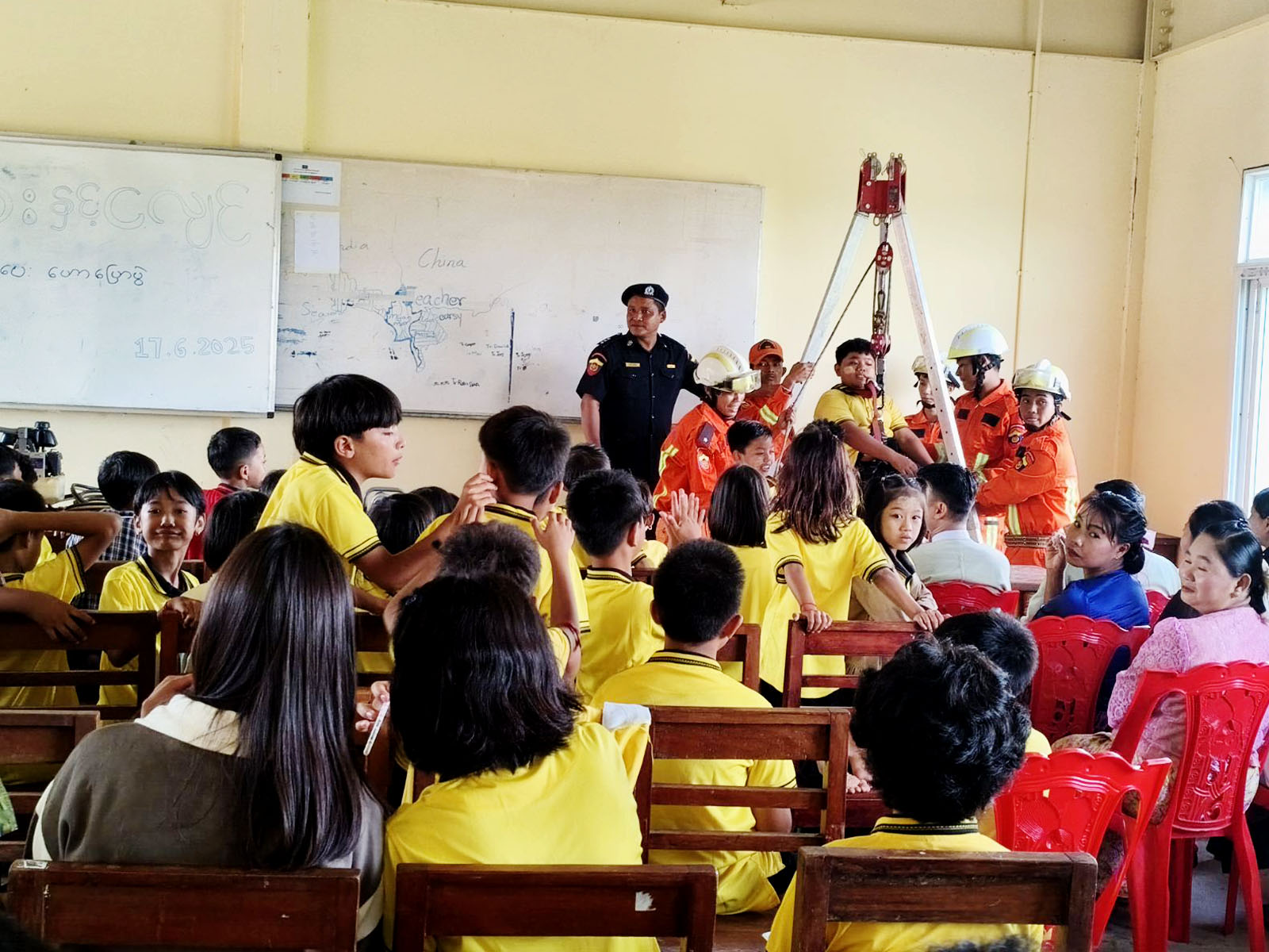 အဆိုပါ ဇာတ်တိုက်လေ့ကျင့်ခြင်းနှင့် အသိပညာပေးခြင်းများ ဆောင်ရွက်ရာတွင် မီးသတ်ဦးစီးဌာနမှ မြို့နယ်ဦးစီးအရာရှိ ဦးသန်းမြင့်နှင့် ဝန်ထမ်းများက၊ IPS-2 (International Private School -2) ကိုယ်ပိုင် အထက်တန်းကျောင်းမှ ကျောင်းတာဝန်ခံနှင့် ဆရာ/ဆရာမများ၊ ကျောင်းသား၊ ကျောင်းသူများ စုစုပေါင်း (၁၆၀)ဦးတို့အား ကျောင်းခန်းမဆောင်တွင်တွေ့ဆုံ၍ ရေဘေး၊ ငလျင်ဘေးနှင့် အခြားဘေးအန္တရာယ်များ တွေ့ကြုံလာပါက အရေးပေါ်တုံ့ပြန်ရေးဆိုင်ရာလုပ်ငန်းများဖြစ်သည့် ကူညီ/ကယ်ဆယ်ရေးဆိုင်ရာ ခေတ်မီနည်းစနစ်များ၊ နည်းပညာသုံး စက်ကရိယာပစ္စည်းများ ကိုင်တွယ်အသုံးပြုပုံနှင့် ပြည်သူများ အနေဖြင့် အရေးပေါ်အခြေအနေ တွေ့ကြုံလာရပါက မည်သို့ပူးပေါင်းဆောင်ရွက်သင့်သည်များကို လက်တွေ့သရုပ်ပြရှင်းလင်းခြင်း၊ မီးဘေးလုံခြုံရေးနှင့်ပတ်သက်၍ အသိပညာပေးခြင်းများ ဆောင်ရွက်ကြပြီး၊ ကျောင်းသား/ကျောင်းသူလေးများနှင့်အတူ ကူညီကယ်ဆယ်ရေးလုပ်ငန်းများကို၊ လက်တွေ့ ဇာတ်တိုက်လေ့ကျင့်ခြင်းများ ဆောင်ရွက်ကြသည်။