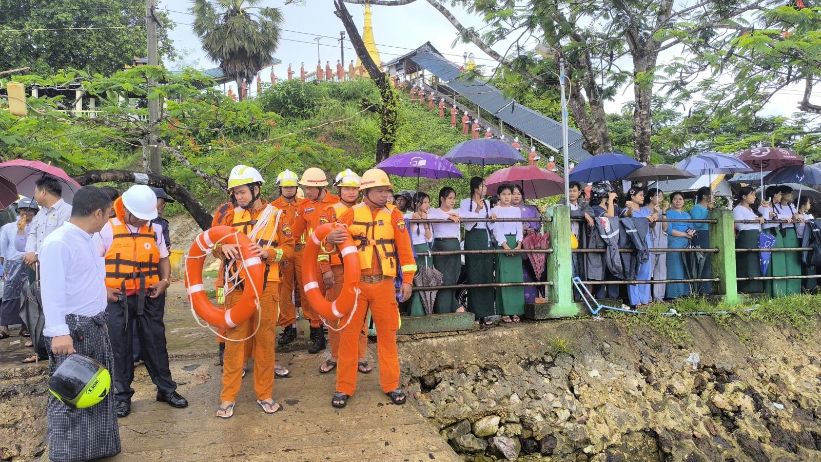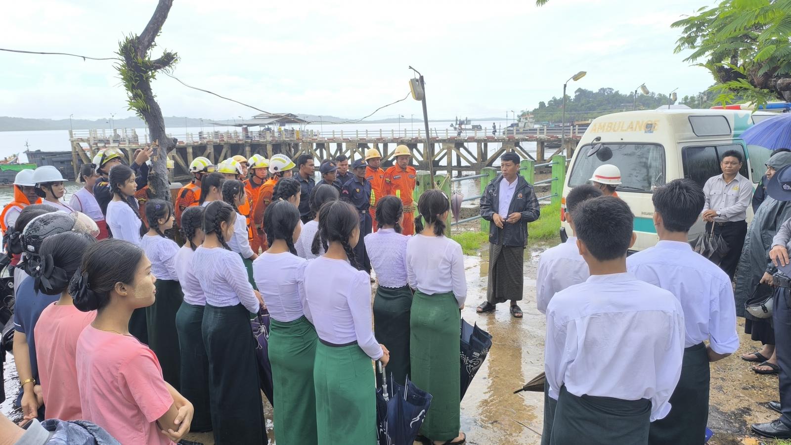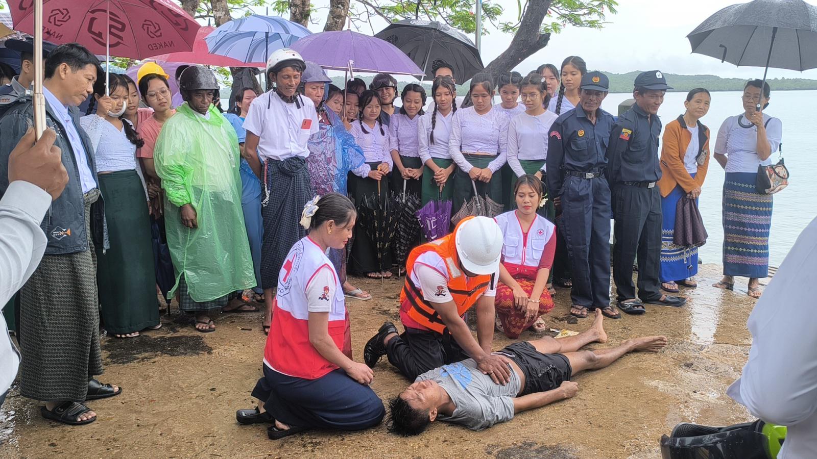 ဇာတ်တိုက်လေ့ကျင့် သရုပ်ပြရာတွင် ပထမဦးစွာ မြို့အဝင် ဆိပ်ခံတံတားအရှေ့ ရေပြင်အတွင်း စက်လှေတစ်စီး တိမ်းမှောက်နေကြောင်း ပြည်သူတစ်ဦးမှ သတင်းပေးပို့သည်နှင့် မြို့နယ်မီးသတ်ဦးစီးဌာနမှူး ဦးတင်ထွန်းနိုင် ဦးဆောင်သော ရှာဖွေကယ်ဆယ်ရေးတပ်ဖွဲ့သည် မိတ်ဖက်အဖွဲ့အစည်းများအား အကြောင်းကြားပြီး ရှာဖွေကယ်ဆယ်ရေးရေယာဉ်များဖြင့် အခင်းဖြစ်ပွားရာနေရာသို့ သွားရောက်ကာရေနစ်မြှုပ်နေသူများအား ရှာဖွေကယ်ဆယ်၍ အသက်ကယ်လှေများ ပေါ်တွင် ရှေးဦးပြုစုခြင်းအသက်ရှူအား ကူနည်းပြုလုပ်ပေးရင်း ကမ်းနားသို့ သယ်ဆောင်လာကြသည်။