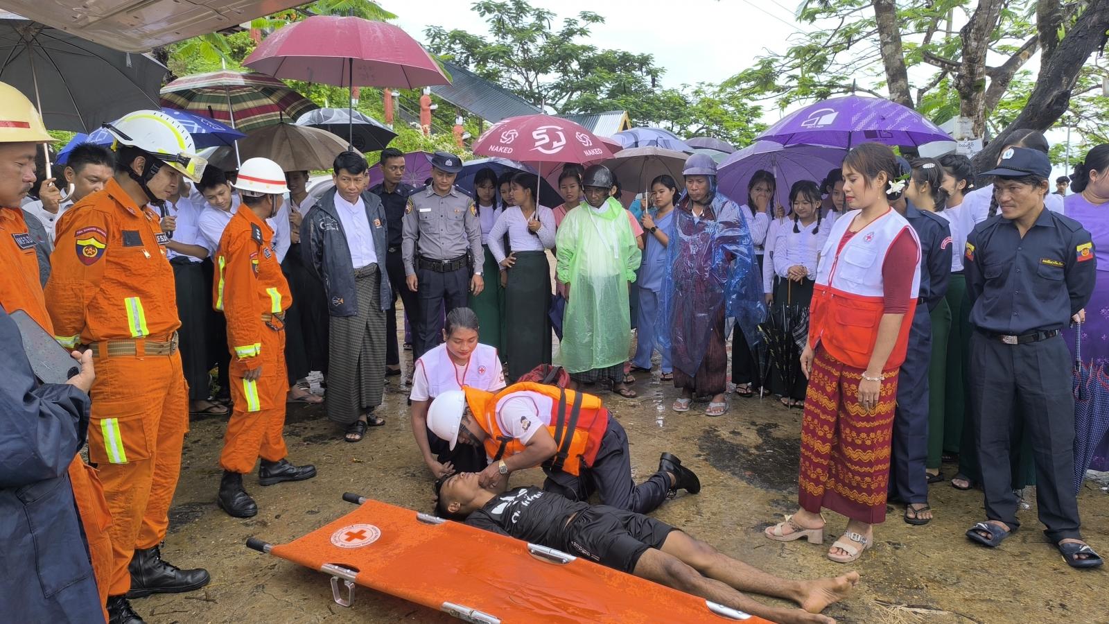 ထို့နောက် တံတားတွင် လူနာအား မြေပြင်အသက်ကယ်အဖွဲ့မှ လက်ခံရယူပြီး ရှေးဦးပြုစုခြင်းကို ဆက်လက်ဆောင်ရွက်ပြီး လူနာတင်ယာဉ်များဖြင့် ဆေးရုံသို့ ပို့ဆောင်ခြင်းများ ဆောင်ရွက်ခဲ့ ကြပြီး ဇာတ်တိုက်လေ့ကျင့်ခြင်းကို မြို့နယ်မီးသတ်ဦးစီးဌာနမှ ရှာဖွေကယ်ဆယ်ရေးတပ်ဖွဲ့ဝင်များ၊ သန္ဓေ+အရန် မီးသတ်တပ်ဖွဲ့ဝင်များ၊ ကြက်ခြေနီတပ်ဖွဲ့ဝင်များ၊ လူမှုရေးအသင်းအဖွဲ့ဝင်များ၊ ရဲတပ်ဖွဲ့ဝင်များက ရှာဖွေကယ်ဆယ်ရေးယာဉ် (၁) စီး၊ လူနာတင်ယာဉ် (၁) စီး၊ အုပ်ချုပ်မှုယာဉ် (၁) စီးတို့ဖြင့် ဇာတ်တိုက်လေ့ကျင့်ဆောင်ရွက်ခဲ့ကြသည်။