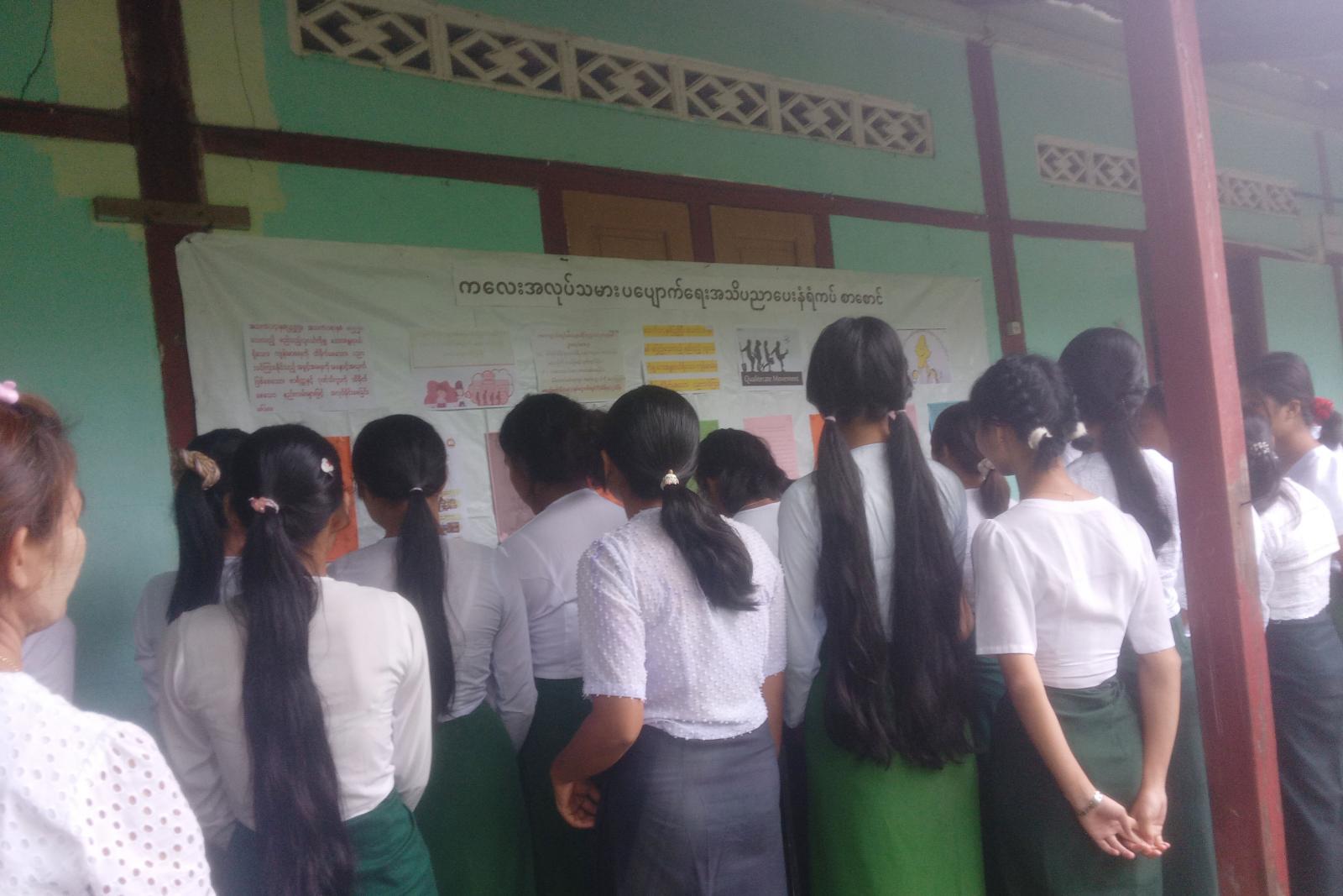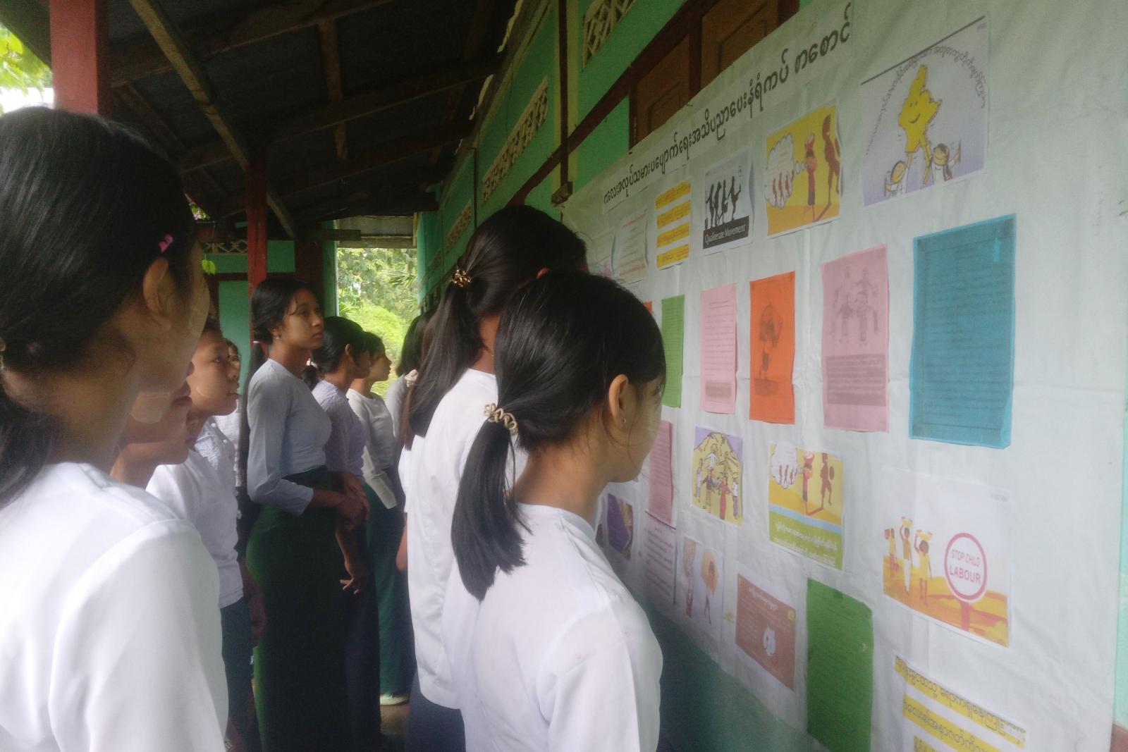 ထို့နောက် ကလေးအလုပ်သမားပပျောက်ရေးဆိုင်ရာ အသိပညာပေးနံရံကပ်ဘုတ်များနှင့် စာအုပ်/စာစောင်များခင်းကျင်းပြသရာ ကျောင်းသား/သူများက စိတ်ဝင်တစ်စားလေ့လာကြည့်ရှုခဲ့ကြောင်း သိရသည်။
