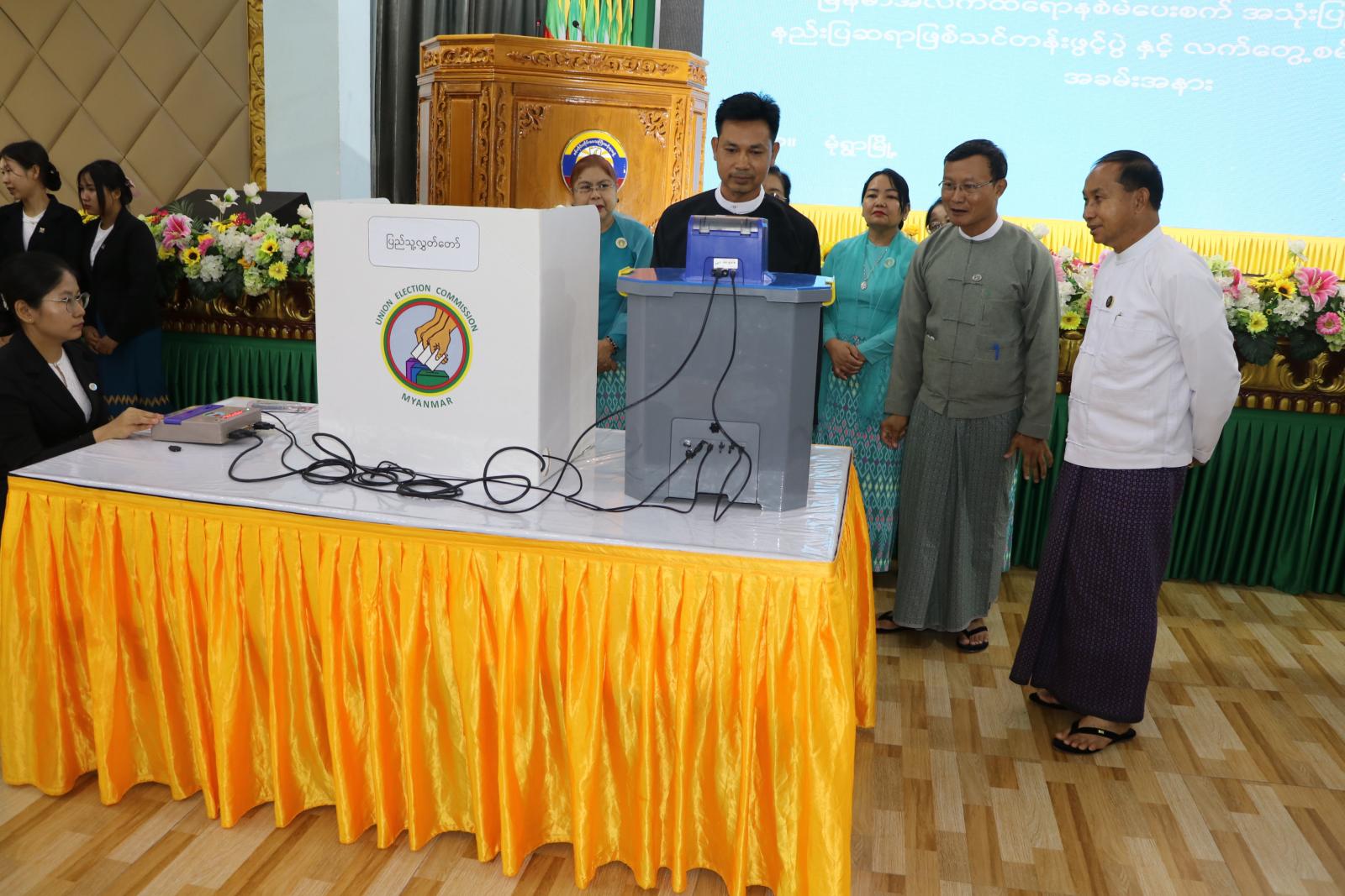 ဆက်လက်၍ တိုင်းဒေသကြီး ဝန်ကြီးချုပ်နှင့်ဇနီး၊ တိုင်းဒေသကြီး တရားသူကြီးချုပ်နှင့်ဇနီး၊ တိုင်းဒေသကြီး အစိုးရအဖွဲ့ဝင်များနှင့်ဇနီးများ၊ အခမ်းအနားသို့ တက်ရောက်လာသူများက မြန်မာအီလက်ထရောနစ် မဲပေးစက်ဖြင့် လက်တွေ့စမ်းသပ်မဲပေးခဲ့ကြောင်း သိရသည်။