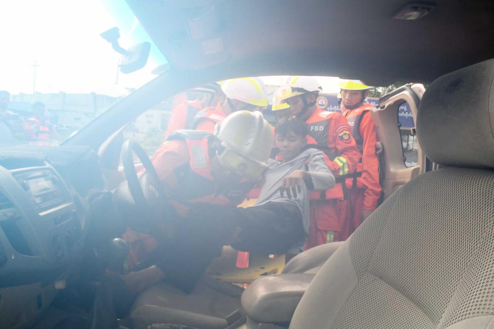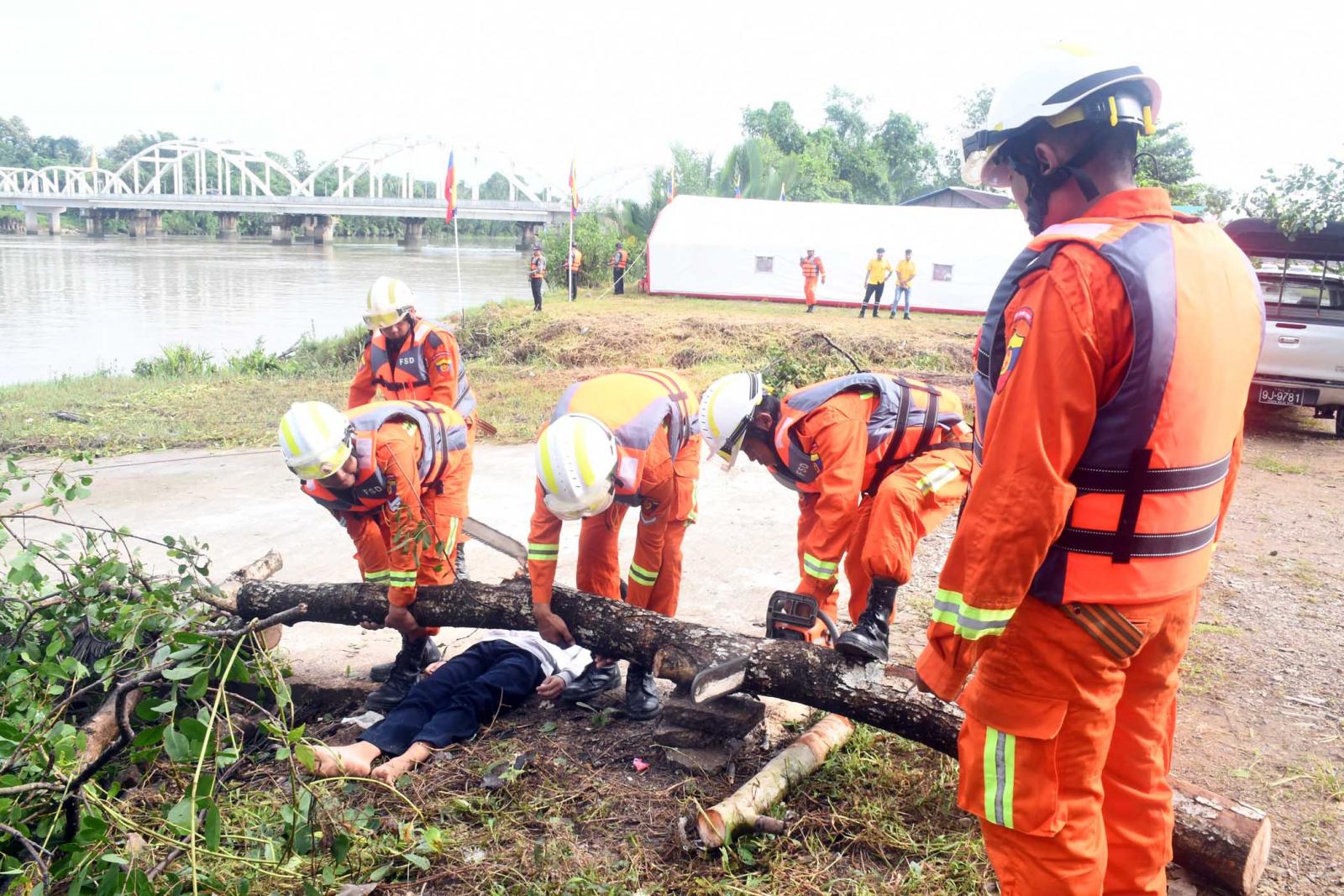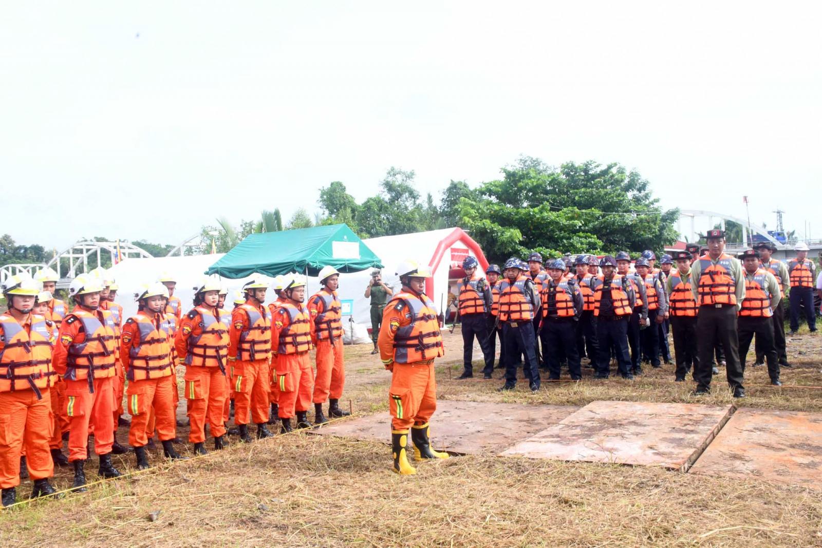 ထို့သို့ ဇာတ်တိုက်လေ့ကျင့်ခြင်းတွင်ပူးပေါင်းအဖွဲ့များက မုန်တိုင်းဘေးအန္တရာယ်ဖြစ်ပွားနိုင်သည့် ကမ်းရိုးတန်းတစ်လျှောက်နှင့် ရပ်ကွက်၊ ကျေးရွာများအတွင်းနေထိုင်သည့် ပြည်သူများအား အသံချဲ့စက်ဖြင့် နှိုးဆော်သတိပေးခြင်း၊ လက်ကမ်းစာစောင်များ ဖြန့်ဝေခြင်းတို့အား သရုပ်ပြသခြင်း၊ မုန်တိုင်းနှင့် မုန်တိုင်းဒီရေဘေးအန္တရာယ်ရှိသောနေရာများရှိ ပြည်သူများကို ဘေးအန္တရာယ်ကင်းလွတ်ရာနေရာသို့ ရွှေ့ပြောင်းသယ်ဆောင်ခြင်း၊ လေပြင်းတိုက်ခတ်မှုကြောင့် သစ်ကိုင်းများကျိုးကျခြင်း၊ နေအိမ်များပေါ်သို့ သစ်ပင်များ လဲကျခြင်းတို့အား ဖြတ်တောက်ရှင်းလင်းခြင်း၊ လဲကျနေသည့် သစ်ပင်များ၏အောက်တွင် ပိတ်မိနေသူများအား ရှာဖွေကယ်ဆယ်ရေးတပ်ဖွဲ့မှ Chain Saw အသုံးပြု ဖြတ်တောက်ဖယ်ရှားကယ်ထုတ်ခြင်း၊ မုန်တိုင်းဒဏ်ကြောင့် ပြိုပျက်သွားသော အဆောက်အဦ၏ အုတ်နံရံအတွင်း ပိတ်မိနေသူများအားရှာဖွေ ကယ်ဆယ်ရေးသုံးပစ္စည်းများ အသုံးပြု၍ကယ်ထုတ်ခြင်း၊ သစ်ပင်လဲကျပိတ်မိနေသော မော်တော်ယာဉ်ပေါ်မှ ပိတ်မိနေသူအား Hydraulic Cutter အသုံးပြု၍ မော်တော်ယာဉ်၏ပြင်ပသို့ ကယ်ထုတ်ခြင်း၊ ရေကြီးရေလျှံမှုကြောင့် မြစ်အတွင်း စက်လှေတိမ်းမှောက် ကာ ရေနစ်နေသူများနှင့် ရေတွင်မျောပါလာသူများအား ကယ်ဆယ်ခြင်း၊ Intelligence Life Buoy အသုံးပြု၍ကယ်ဆယ်ခြင်း၊ ကျန်းမာရေးစောင့်ရှောက်မှုပေးခြင်း၊ ဒဏ်ရာရရှိသူများအနက် အရေးပေါ် လူနာ၊ အရေးကြီးလူနာ၊ သာမန်လူနာများခွဲခြား၍ ရှေးဦးသူနာပြုစုခြင်းနှင့်ဆေးရုံသို့ ပို့ဆောင်ခြင်း၊ ကျန်ရှိ/ပျောက်ဆုံးပြည်သူများရှိ/မရှိကို စာရင်းကောက်ယူ စိစစ်ဆောင်ရွက်ခြင်းစသည့်တို့ကို အချိန်တို အတွင်း အလျှင်အမြန်ပြီးစီးရန်ဇာတ်တိုက် လေ့ကျင့်ကြသည်။