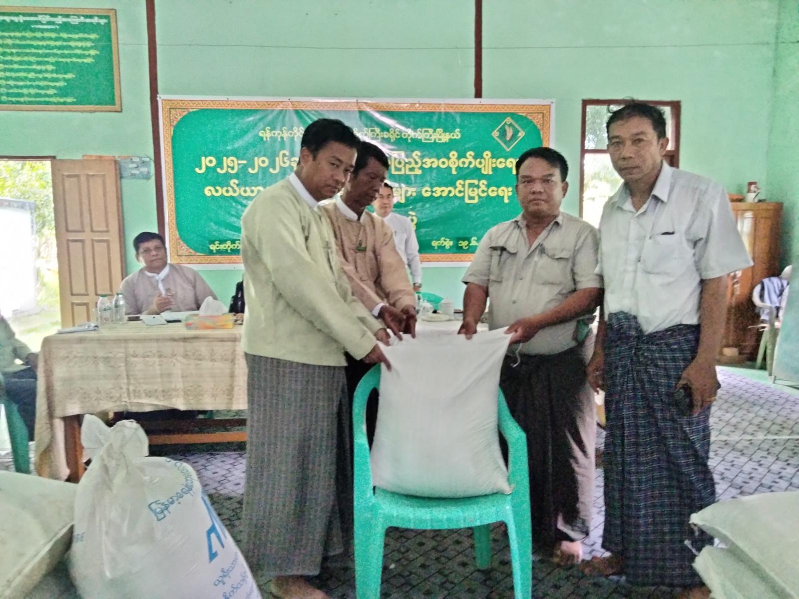ထို့နောက် ခရိုင်စိုက်ပျိုးမှုကြီးကြပ်ရေးကော်မတီဥက္ကဋ္ဌ ဦးသူအောင်နှင့် တာဝန်ရှိသူများက အောင်နိုင်တိုးမျိုးစပါးပြန့်ပွားရေးအတွက် စိုက်ပျိုးသူတောင်သူ ၃ ဦးကို မျိုးစေ့များထောက်ပံ့ပေးအပ်ခဲ့ကြောင်း သိရသည်။