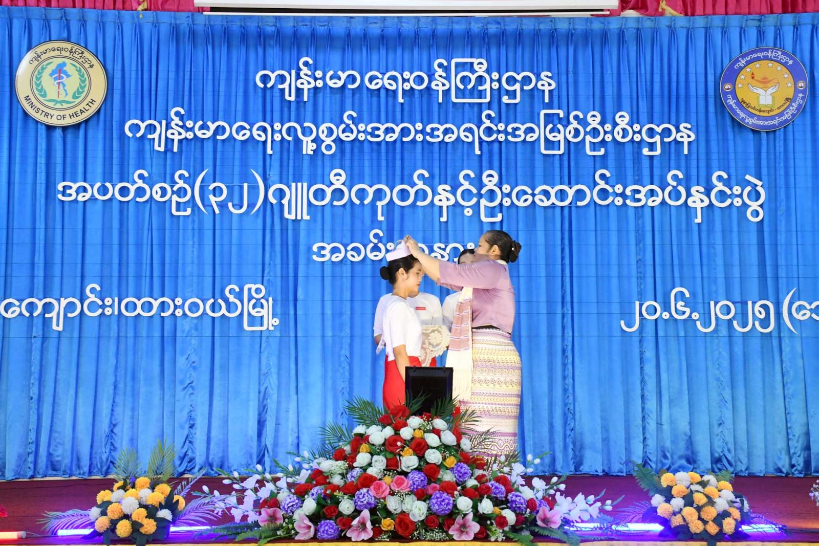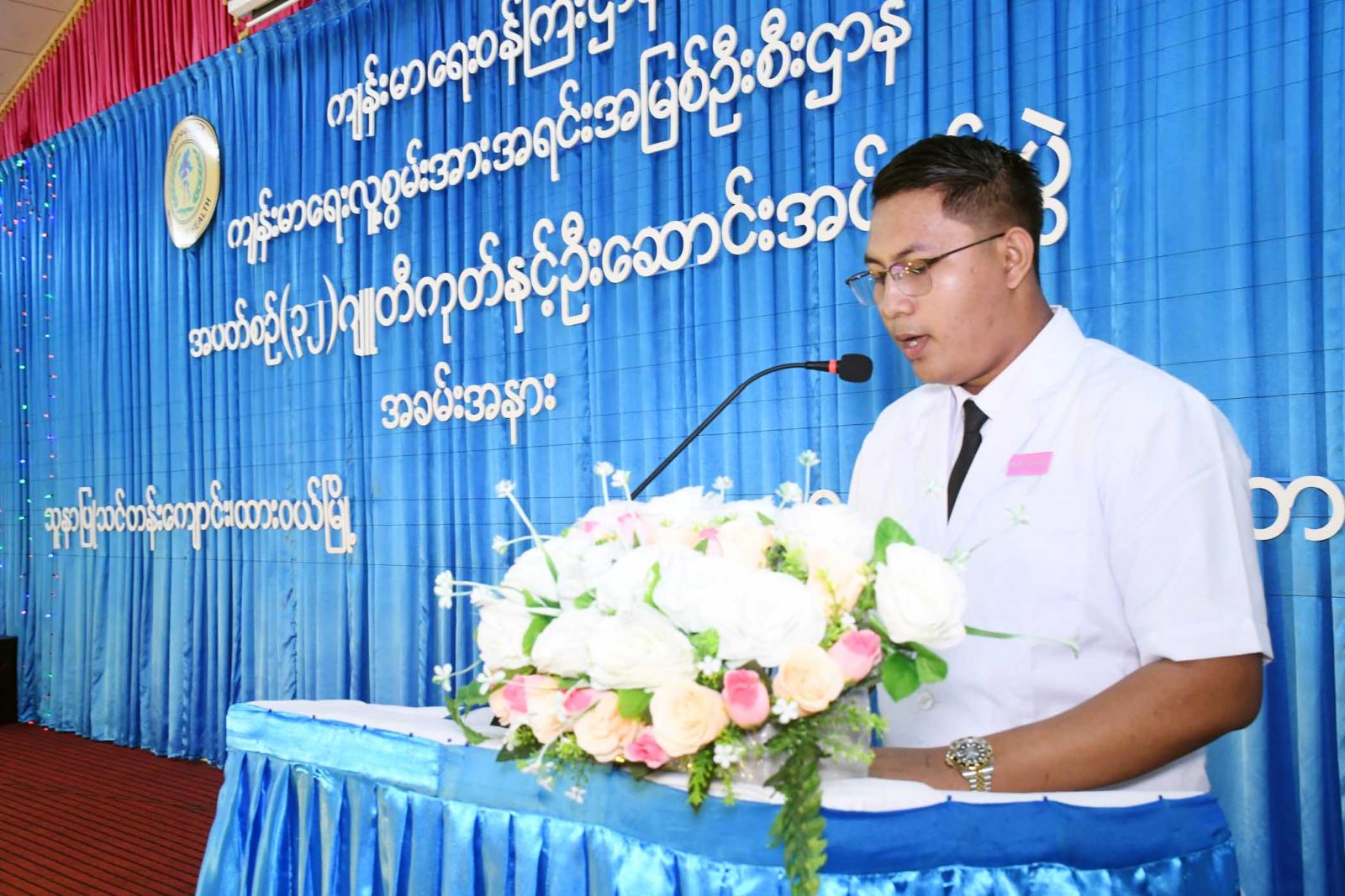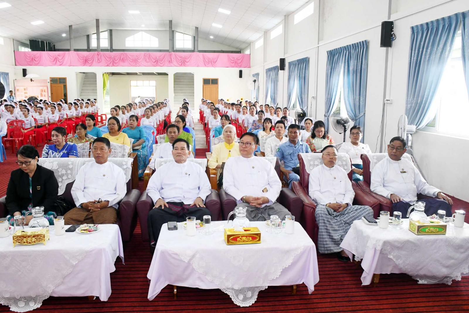 အခမ်းအနားတွင် တိုင်းဒေသကြီးဝန်ကြီးချုပ် ဦးမြတ်ကိုက မြန်မာနိုင်ငံတွင် ကျန်းမာရေးစောင့်ရှောက်မှုပေးရာ၌ အလွန်အရေးပါသော သူနာပြုဆရာ/ဆရာမများအဖြစ် မွေးထုတ်မည့် သူနာပြုဆရာ/ဆရာမ လောင်းလျာများအတွက် အရေးကြီးလှသည့် ဂုဏ်ယူဖွယ်အခမ်းအနားတစ်ခုလည်းဖြစ်ကြောင်း၊ သူနာပြုဆိုသည် ကျန်းမာရေးကဏ္ဍတွင် များစွာအရေးပါသော လုပ်ငန်းတစ်ရပ်ဖြစ်ကြောင်း၊ ကရုဏာကြီးမားပြီး ကိုယ်ကျိုးစွန့်အနစ်နာခံတတ်ခြင်း၊ စိတ်ထားမွန်မြတ်ခြင်း၊ အပင်ပန်းဆင်းရဲခံနိုင်ခြင်း စသည့်အင်္ဂါရပ်များနှင့် ထူးကဲစွာပြည့်စုံသူများသာ ထမ်းဆောင်နိုင်သည့် တာဝန်မျိုးဖြစ်ကြောင်း၊ သူနာပြုနှင့် သားဖွားပညာရေးကိုလည်း ဒီပလိုမာသင်တန်းမှ သူနာပြုသိပ္ပံဘွဲ့၊ သူနာပြုမဟာသိပ္ပံ ဘွဲ့လွန်သင်တန်းများ၊ သူနာပြုပါရဂူဘွဲ့လွန်သင်တန်းများကို ပြည်တွင်းရော ပြည်ပမှာပါ လေ့လာသင်ယူနိုင်ကြောင်း၊ သင်ကြားရေးအပိုင်းမှာ နိုင်ငံတော်၏ ကျန်းမာရေးစောင့်ရှောက်မှု လိုအပ်ချက်နှင့်အညီ အရည်အသွေးပြည့်ဝသည့် သူနာပြုသားဖွားများ မွေးထုတ်ပေးနိုင်ရေးသည် အရေးကြီးကြောင်း၊ နိုင်ငံတော်က အရည်အသွေးပြည့်မီသော ကျန်းမာရေးစောင့်ရှောက်မှုနှင့် အဆင့်အတန်းမြင့်မားစေရေး ဆောင်ရွက်ရာတွင် ပြည်သူများအားထားရသည့် အရည်အချင်းရှိသော ဘက်စုံတော်သည့် သူနာပြုကောင်းများ လေ့ကျင့်မွေးထုတ်ပေးရမှာဖြစ်ကြောင်း၊ မိမိတို့၏ အသက်မွေးဝမ်းကြောင်းအတတ်ပညာရပ်ဖြစ်သော သူနာပြုပညာရပ်ကိုမွန်မြတ်သော လုပ်ငန်းအဖြစ် ရေရှည်တိုးတက်အောင်မြင်စေရန်အတွက် အထူးအလေးထား ကြိုးစားဆောင်ရွက်ကြပါရန်နှင့် ဖလော့ရင့်နိုက်တင်ဂေးကဲ့သို့ သူနာပြုများစွာ ပေါ်ထွန်းလာစေလိုပါကြောင်း ပြောကြားသည်။