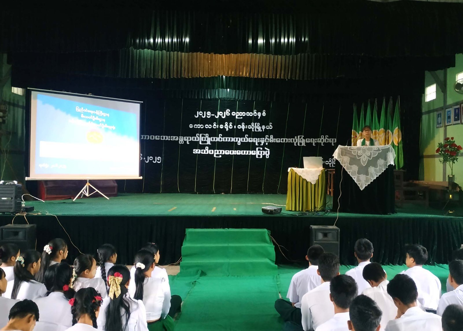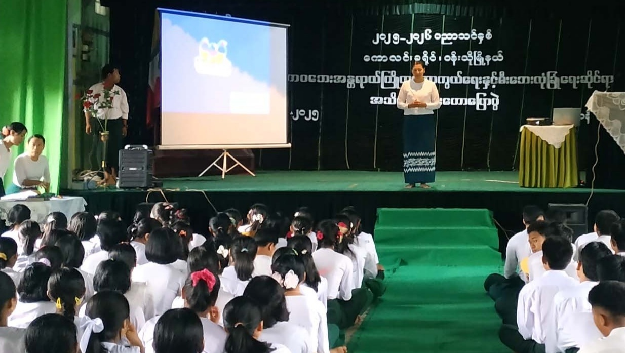 အဆိုပါ အသိပညာပေးဟောပြောပွဲတွင် မြို့နယ်ပညာရေးမှူး ဒေါ်ချိုချိုမြင့်က ကြိုတင်ကာကွယ်သဘာ၀ဘေးအန္တရာယ်ခေါင်းစဥ်ဖြင့်လည်းကောင်း၊ ပြန်ကြား ရေးနှင့်ပြည်သူ့ဆက်ဆံရေးဦးစီးဌာန၊ မြို့နယ်ဦးစီးမှူး ဒေါ်ခွင်ကြည်က ရေကြီးရေလျှံဘေးအန္တရာယ်နှင့် နောက်ဆက်တွဲကျန်းမာရေး ပြဿနာများအကြောင်းကိုလည်းကောင်းပြောကြားခဲ့သည်။ဆက်လက်၍ မြို့နယ်မီးသတ်ဦးစီးမှူး ဦးနိုင်လင်းဖြိုးက မြန်မာနိုင်ငံတွင်ဖြစ်ပွားလေ့ရှိသည့် ဘေးအန္တရာယ်များ အကြောင်း၊ မီးဘေး၊ ရေဘေး၊ မုန်တိုင်းဘေး၊ လေပြင်းဘေး၊ မိုးကြိုးဘေး၊ ငလျင်ဘေး၊ ဆူနာမီဘေး၊ မြေပြိုဘေးအန္တရာယ်နှင့် မိုးခေါင်ရေရှားဘေးအန္တရာယ်တို့၏ ဆောင်ရန်ရှောင်ရန်အချက်များနှင့် ကြိုတင်ပြင်ဆင်သိရှိလိုက်နာ ဆောင်ရွက်ရန်အချက်များကို Power Point ဖြင့် ရှင်းလင်းပြောကြားခဲ့ပြီး၊ မီးသတ် ဦးစီးဌာနမှ ဝန်ထမ်းများက ငလျင်လှုပ်ခတ်နေစဉ်အတွင်း (ဝပ်၊ ကာ၊ ကိုင်)ပုံစံဖြင့် နေထိုင်ပုံကို သရုပ်ပြသခဲ့ရာ တက်ရောက်လာကြသော ကျောင်းသား၊ ကျောင်းသူများကလည်း လက်တွေ့သရုပ်ပြလေ့ကျင့်ခဲ့ကြသည်။