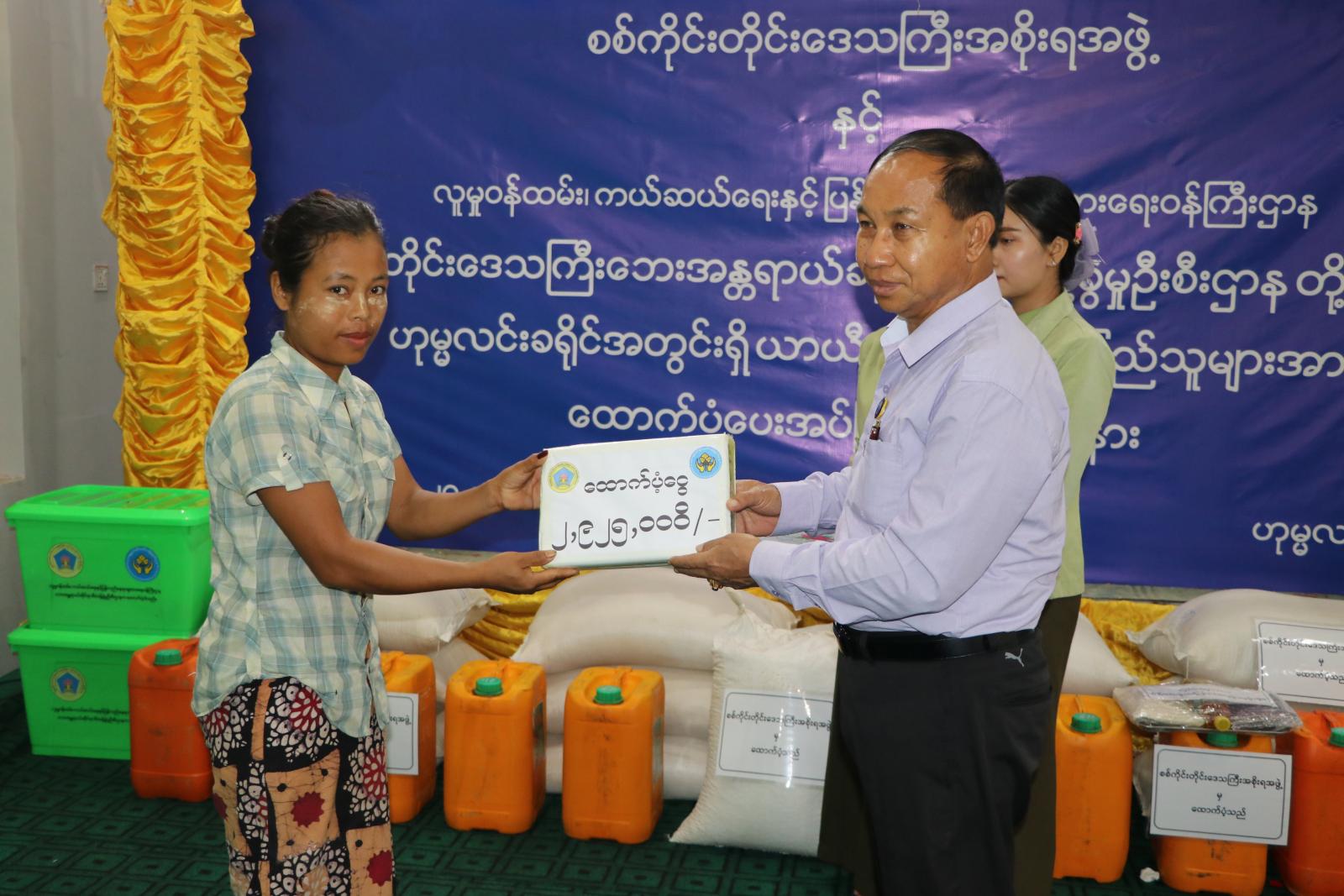 ထို့နောက် တိုင်းဒေသကြီးဝန်ကြီးချုပ်က ယာယီနေရပ်စွန့်ခွာပြည်သူ ၅၈၅ ဦးအတွက် တစ်လစာထောက်ပံ့ငွေ ကျပ် ၂၉၂၅၀၀၀ (နှစ်ဆယ့်ကိုးသိန်းနှစ်သောင်းငါးထောင်ကျပ်)နှင့် ဆန်၊ ဆီများအား ထောက်ပံ့ပေးအပ်ပြီး တိုင်းဒေသကြီး တိုင်းရင်းသားရေးရာဝန်ကြီး၊ ဟုမ္မလင်း တပ်နယ်မှူး၊ တိုင်းဒေသကြီး ဘေးအန္တရာယ်စီမံခန့်ခွဲရေးဦးစီးဌာနမှ ညွှန်ကြားရေးမှူးနှင့်ခရိုင်စီမံအုပ်ချုပ်ရေးအဖွဲ့ဥက္ကဌတို့မှ ယာယီနေရပ်စွန့်ခွာပြည်သူများထံ ဆန်၊ ဆီနှင့် ဘေးအန္တရာယ်စီမံခန့်ခွဲရေးဦးစီးဌာနမှ ထောက်ပံ့ပေးအပ်သည့် မိသားစုသုံးပစ္စည်းများအား အသီးသီးထောက်ပံ့ပေးအပ်ခဲ့ကြသည်။