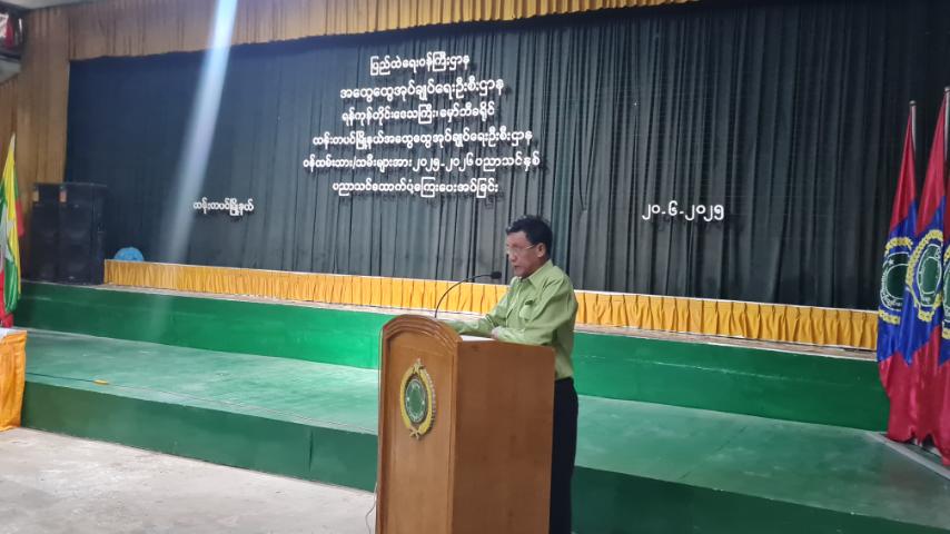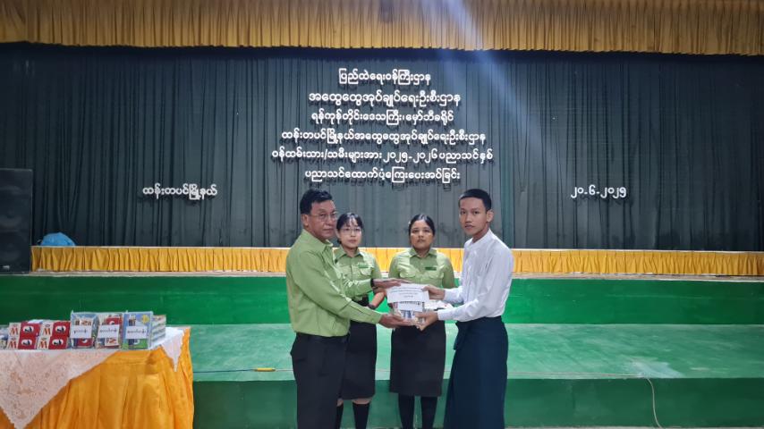 ပေးအပ်ပွဲတွင် မြို့နယ်စီမံအုပ်ချုပ်ရေးအဖွဲ့ဥက္ကဋ္ဌ ဦးနိုင်နိုင်ဦးက ပညာသင်ထောက်ကူပြပစ္စည်းများနှင့် ပညာသင်ထောက်ပံ့ငွေပေးအပ်ရခြင်းနှင့်ပတ်သက်၍ ရှင်းလင်းပြောကြားခဲ့သည်။