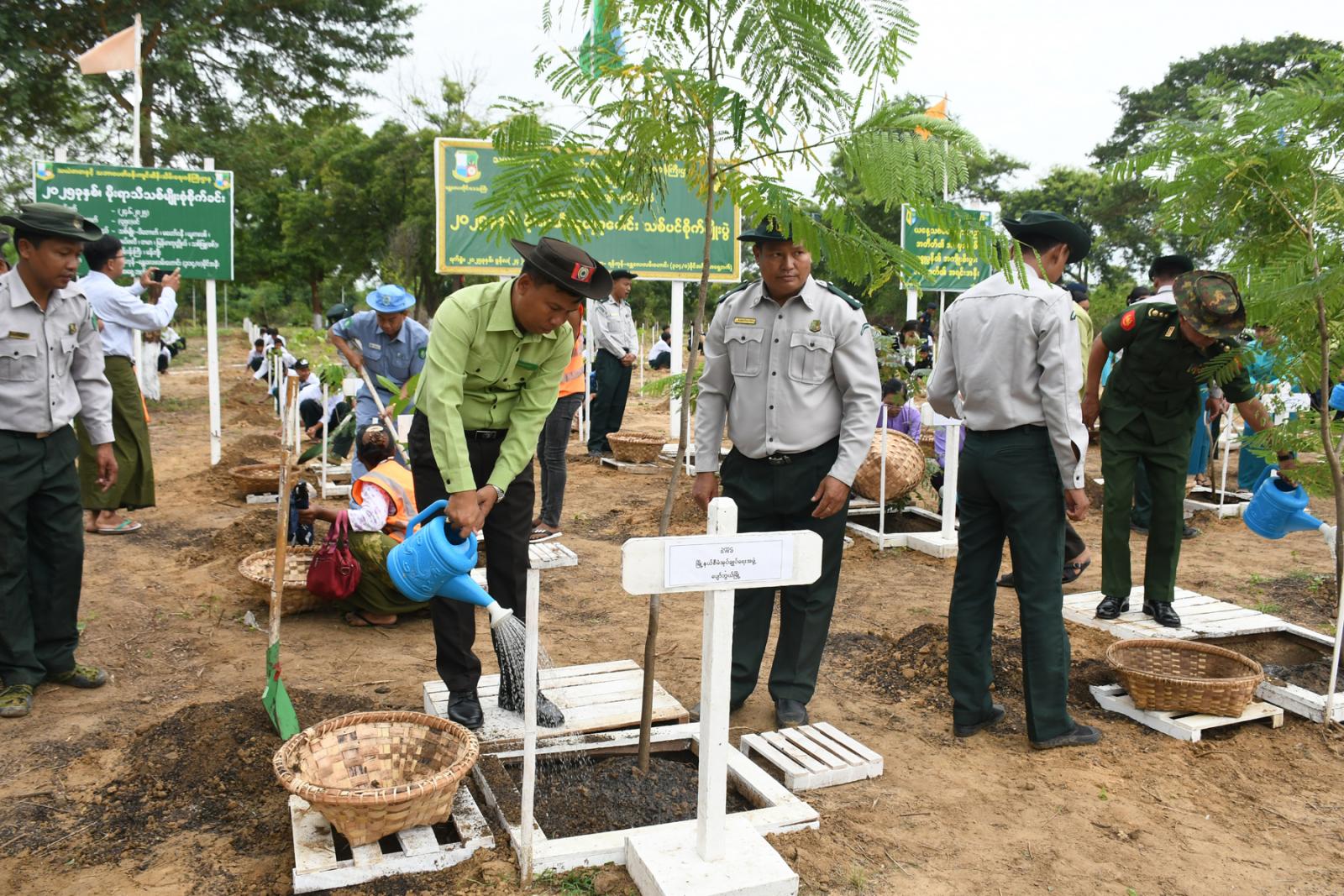 ဦးစွာ အမှတ်(၇၁)သံချပ်ကာစစ်ဆင်ရေးကွပ်ကဲမှုဌာနချုပ် တပ်မမှူး ဗိုလ်မှူးကြီးကျော်ဆွေလင်း၊ မြို့နယ် စီမံအုပ်ချုပ်ရေးအဖွဲ့ဥက္ကဋ္ဌ ဦးအာကာစိုးနှင့်အဖွဲ့ဝင်များ၊ မြို့နယ်သစ်တောဦးစီးမှူး ဦးအောင်ခင်ဦးနှင့်တာဝန်ရှိသူများက သစ်ပင်စိုက်ပျိုးပေးကြမည့် ဌာနဆိုင်ရာများ၊ လူမှုရေး အသင်းအဖွဲ့များ၊ ပြည်သူများနှင့် ကျောင်းသား၊ ကျောင်းသူများကို ပျိုးပင်များပေးအပ်ကြသည်။