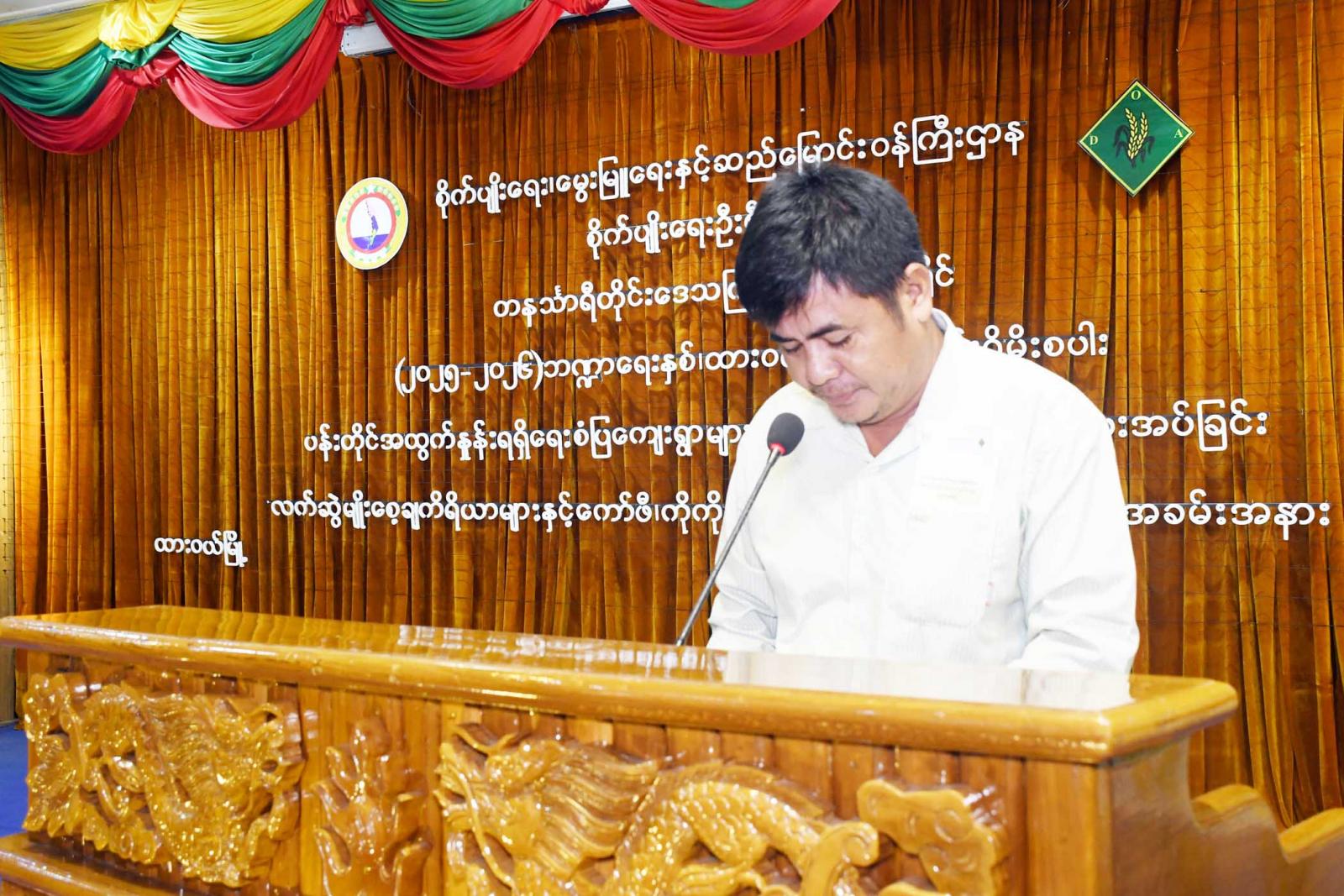 ထို့နောက် စိုက်ပျိုးရေးဦးစီးဌာန၊ တိုင်းဒေသကြီးဦးစီးမှူး ဦးသန်းထိုက်က ထားဝယ်ခရိုင်အတွင်း မိုးစပါးပန်းတိုင်အထွက်နှုန်းရရှိရေး စံပြကျေးရွာများအား သွင်းအားစုများ၊ကိုကိုး၊ကော်ဖီပျိုးပင်များ ပေးအပ်ခြင်း၊ လက်ဆွဲမျိုး စေ့ချကိရိယာများ ပေးအပ်ခြင်းနှင့်ပတ်သက်၍ ရှင်းလင်းတင်ပြသည်။