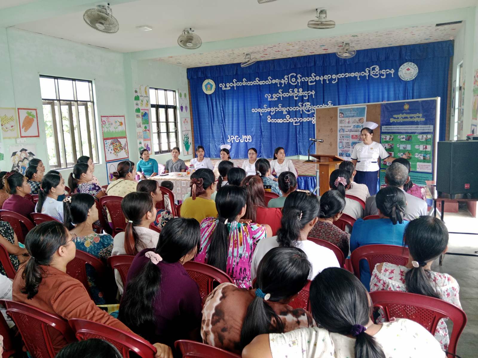 ဆက်လက်၍ သရက်ချောင်းမြို့နယ်၊ ပြည်သူ့ကျန်းမာရေးဦးစီးဌာနမှ ကျန်းမာရေးဆရာမ ဒေါ်သဉ္ဇာသိန်းဝင်းက သွေးလွန်တုပ်ကွေးရောဂါဆိုင်ရာ ဖြစ်ပွားရခြင်းနှင့်ပတ်သက်၍ ရှင်းလင်းပြောကြားခြင်း၊ သွေးလွန်တုပ်ကွေးရောဂါကာကွယ်ရေးနည်းလမ်းများအကြောင်း၊ ဖုံး၊ သွန်၊ လဲ၊ စစ်၊ ခတ်၊ လောင်း၊ ထောင်၊ ဖွင့်၊ စွန့်/မြှုပ် ရှင်း၊ မှုတ် စကားလုံးအရှည်ကောက် အဓိပ္ပါယ်များကို ရှင်းလင်းခြင်း၊ ရေကန်၊ ရေစည်၊ ရေပုံး၊ ရေအိုးစသည့်ပစ္စည်းများတွင် အဘိတ်ဆေးခတ်ရမည့် အတိုင်းအတာများအကြောင်း၊ မိဘများအနေဖြင့် မိမိအိမ်ရှိ မိသားစုဝင်များ၊ အိမ်နီးနားချင်းများ သွေးလွန်တုပ်ကွေးရောဂါဖြစ်ပွားသည်ဟု သံသယရှိပါက နီးစပ်ရာဆေးရုံး၊ ဆေးခန်းများသို့ အမြန်ဆုံးသွားရောက်ရန် စသည်ဖြင့် ရှင်းလင်းပြောကြားခဲ့ပြီးနောက် မြို့နယ်ပြည်သူ့ကျန်းမာရေးဦးစီးဌာနမှ ကျန်းမာရေးဆရာမက ကလေးသူငယ်များ၏ မိဘများအား အဘိတ်ခတ်ဆေးများ ဖြန့်ဝေပေးခဲ့ကြောင်း သိရသည်။