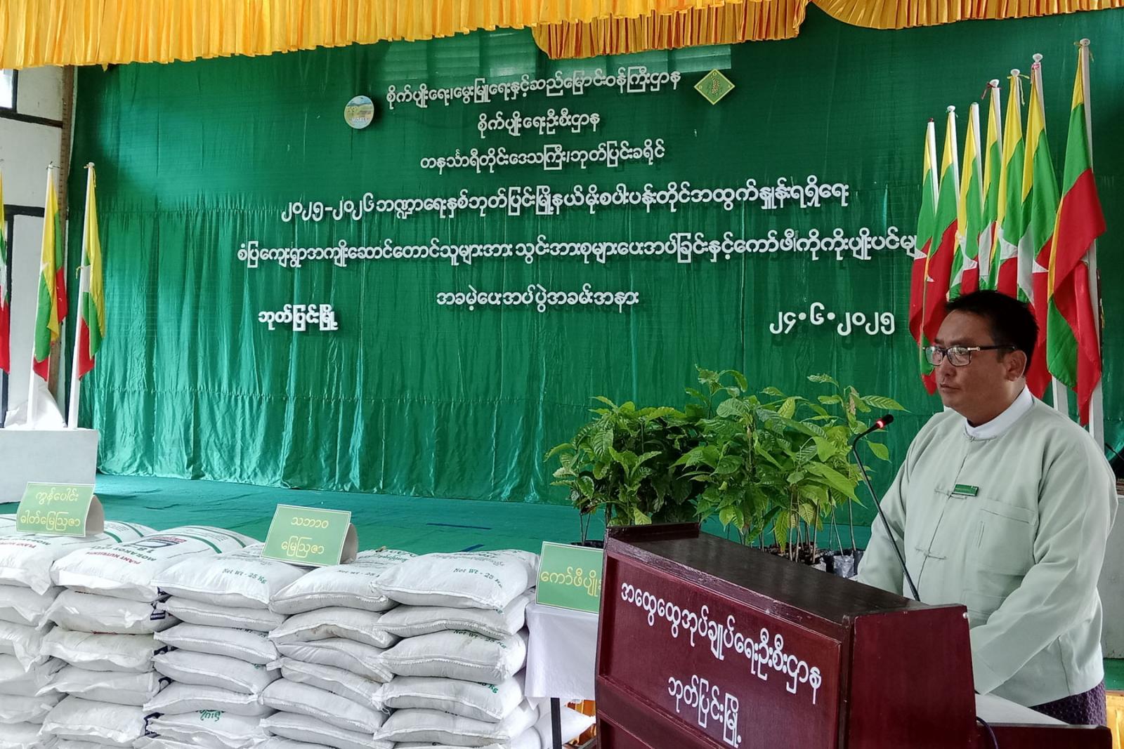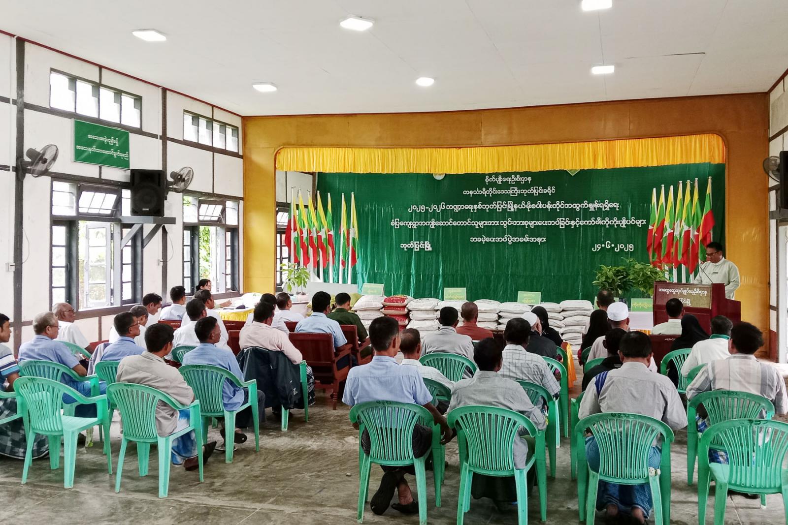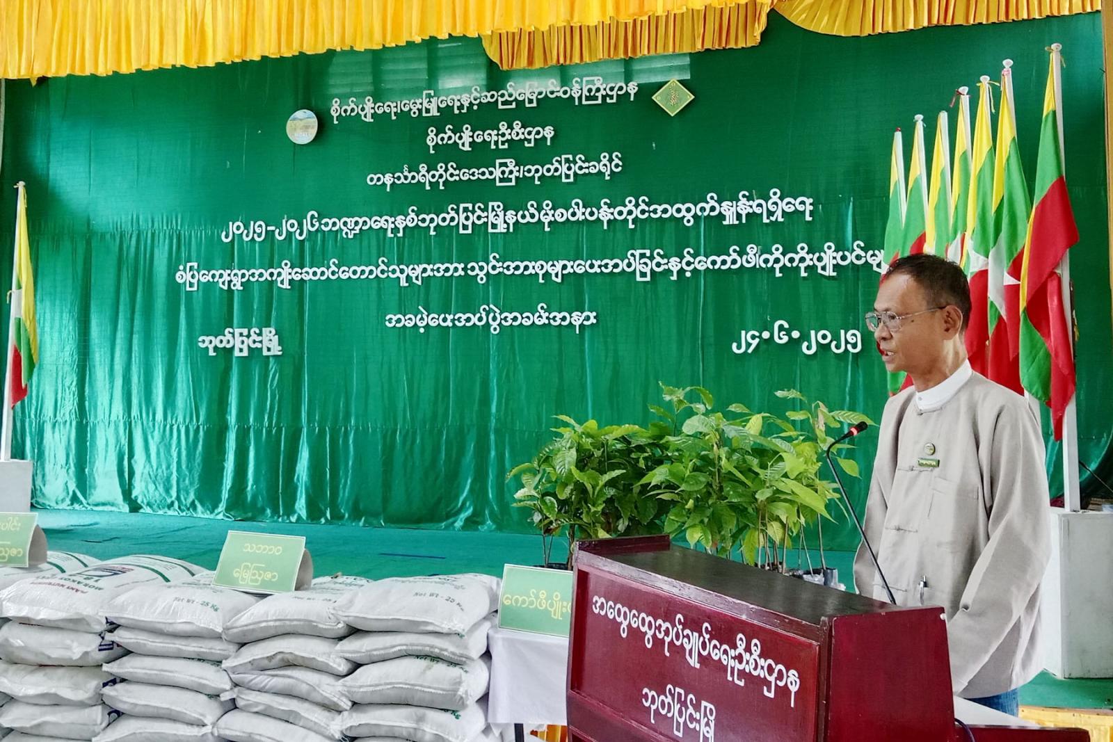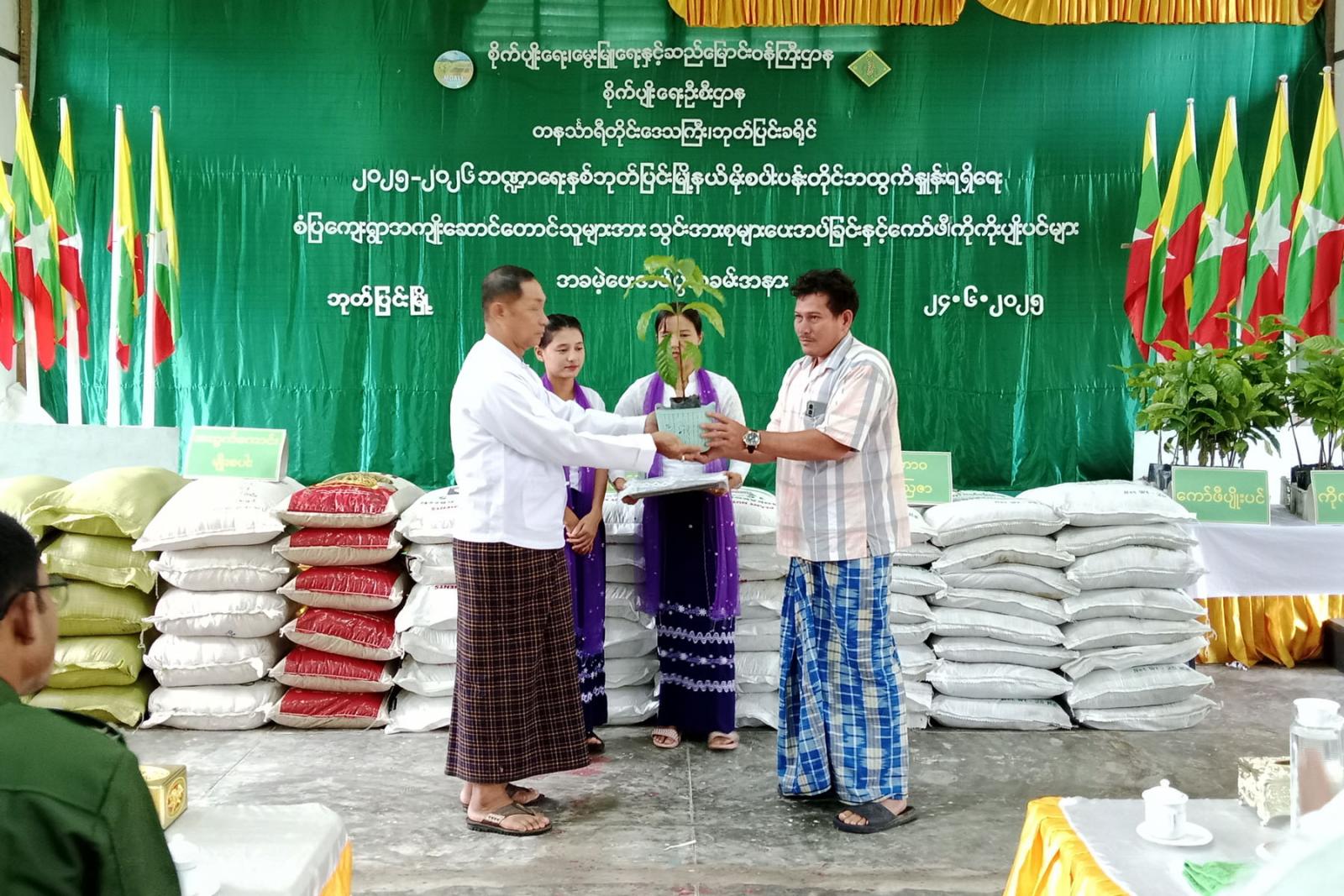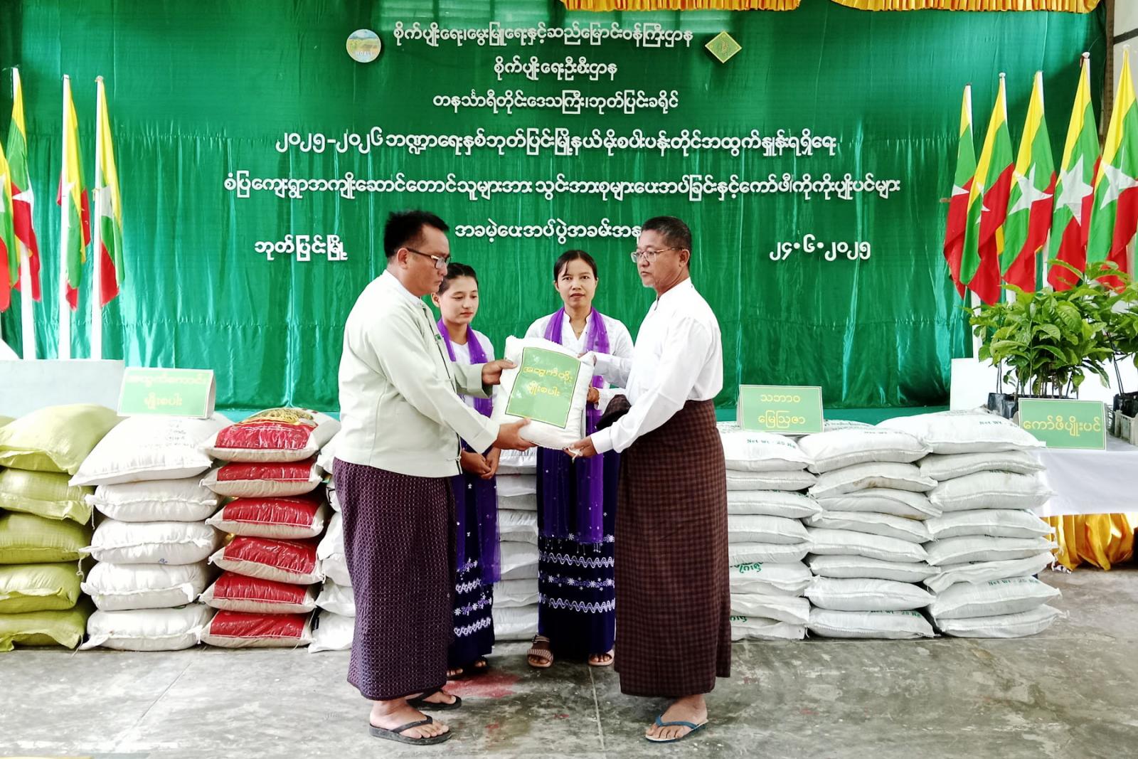 ထို့နောက် သွင်းအားစုများဖြစ်သော မျိုးစပါး၊ ကွန်ပေါင်းဓာတ်မြေဩဇာ၊ သဘာဝမြေဩဇာများကို မြို့နယ်စီမံအုပ်ချုပ်ရေးအဖွဲ့ဥက္ကဋ္ဌ ဦးညီညီနှင့်အဖွဲ့ဝင်များ၊ တာဝန်ရှိသူများက တောင်သူ(၄၅)ဦး တို့ကို စပါးစိုက်ပျိုးမြေ ၃၂၅ ဧက အတွက် မျိုးစပါး(၃၂၅)တင်း၊ ဘသာဝမြေဩဇာ ၆၅၀ အိတ်၊ ကွန်ပေါင်း ဓာတ်မြေ ဩဇာ (၁၆၂)အိတ်၊ ကိုကိုး စိုက်ဧက(၄၀)အတွက် ပျိုးပင်(၁၂၀၀၀)ပင်၊ ကော်ဖီစိုက်ဧက(၇၅)အတွက် ပျိုးပင်(၃၀၀၀၀)ပင် တို့ကို အသီးသီးပေးအပ်ခဲ့ကြောင်း သိရသည်။