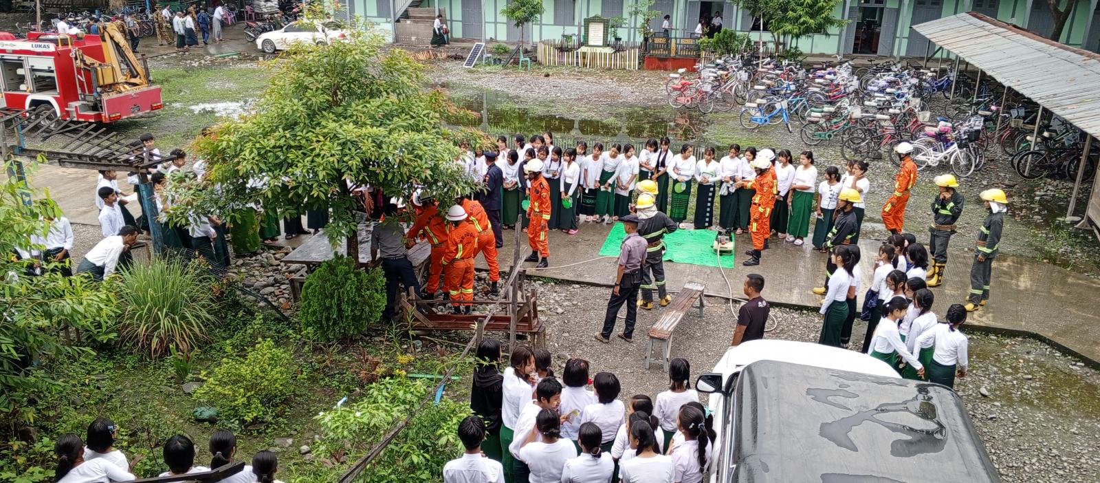 ထို့နောက် မီးသတ်တပ်ဖွဲ့ဝင်များမှ ကယ်ဆယ်ရေးဆိုင်ရာလုပ်ငန်းများတွင် အသုံးပြုသည့် စက်ပစ္စည်းများဖြင့် ကယ်ဆယ်ရေးလုပ်ငန်းဆောင်ရွက်မှုများကို လက်တွေ့သဏ္ဍန်တူ သရုပ်ပြသခဲ့ကြသည်။ အဆိုပါအခမ်းအနားသို့ ခရိုင်စီမံအုပ်ချုပ်ရေးအဖွဲ့ဥက္ကဋ္ဌနှင့် အဖွဲ့ဝင်များ၊ မြို့နယ်စီမံအုပ်ချုပ်ရေးအဖွဲ့ဥက္ကဋ္ဌနှင့် အဖွဲ့ဝင်များ၊ မြို့မိမြို့ဖများ၊ ဌာနဆိုင်ရာတာဝန်ရှိသူများ၊ အ.ထ.က(၆)ကျောင်းမှ ဆရာ၊ ဆရာမများ၊ ကျောင်းသား၊ ကျောင်းသူများ တက်ရောက်ခဲ့ကြောင်း သိရသည်။