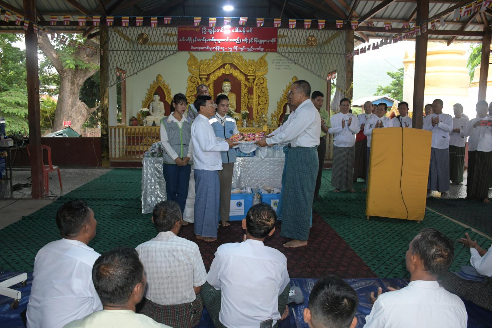 ထို့နောက် နေပြည်တော်သဘာဝဘေးအန္တရာယ်ဆိုင်ရာ စီမံခန့်ခွဲမှုအဖွဲ့ ဥက္ကဋ္ဌ၊ နေပြည်တော်ကောင်စီ ဥက္ကဋ္ဌ ဦးသန်းထွန်းဦးက ယာယီကယ်ဆယ်ရေးစခန်းတွင် ဇာတ်တိုက်လေ့ကျင့်ခြင်းသရုပ်ပြပွဲ၌ ပါဝင်ဆောင်ရွက်သူများအားတွေ့ဆုံ၍ အမှာစကားပြောကြားရာ မိုးရာသီကာလမှာ မိုးရွာသွန်းမှုများပြားပြီး ရေကြီးရေလျှံမှုများ ဖြစ်ပွားတတ်သဖြင့် ယခုလို ရေဘေးသဏ္ဍာန်တူ ဇာတ်တိုက်လေ့ကျင့်မှု ဆောင်ရွက်ရခြင်းဖြစ်ကြောင်း၊ ဖြစ်ပွားနိုင်သည့် သဘာဝဘေးအန္တရာယ်များကို ကြိုတင်မျှော်တွေးပြီး သဘာဝဘေးကာကွယ်ရေးအတွက် စုဖွဲ့ပြင်ဆင်ခြင်း၊ ဇာတ်တိုက်လေ့ကျင့်ခြင်းများ အမြဲမပြတ်ဆောင်ရွက်သွားရန်လိုကြောင်း၊ ယခင် ရာဂီမုန်တိုင်းကြောင့် ဖြစ်ပေါ်ခဲ့သည့် ရေကြီးမှုမှ ထိခိုက်ဆုံးရှုံးမှုတွေကို သင်ခန်းစာယူပြီး အကောင်းဆုံး ကြိုတင်ပြင်ဆင် ဆောင်ရွက်သွားရန်လိုကြောင်း၊ ဘဘာဝဘေးရှာဖွေ ကယ်ဆယ်ရေးတပ်ဖွဲ့များကို စွမ်းဆောင်ရည် မြင့်မားမှုရှိအောင် လေ့ကျင့်ဆောင်ရွက်ထားရန်လိုကြောင်း၊ လူ၊ ယာဉ်၊ စက်ပစ္စည်းများကို အမြဲအသင့်ရှိအောင် ဆောင်ရွက်ထားရန်နှင့် ရှာဖွေကယ်ဆယ်ရေးပစ္စည်းများကို ကျွမ်းကျင်ပိုင်နိုင်စွာ အသုံးချတတ်အောင် ဆောင်ရွက်ထားရန်လိုကြောင်း၊ ဖြစ်ပွားခဲ့သော သဘာဝဘေးများတွင် ဆောက်ရွက်ခဲ့သည့် အားသာချက်၊ အားနည်းချက်များကို ပြန်လည် သုံးသပ်ပြီး အကောင်းဆုံးဖြစ်အောင် ဆောင်ရွက်သွားရန်လိုကြောင်း ပြောကြားခဲ့ပြီး ဇာတ်တိုက်လေ့ကျင့်ခြင်းတွင် ပါဝင်ခဲ့သူများအား ရင်းရင်းနှီးနှီး လိုက်လံနှုတ်ဆက်၍ စားသောက်ဖွယ်ရာများ ပေးအပ်ခဲ့သည်။