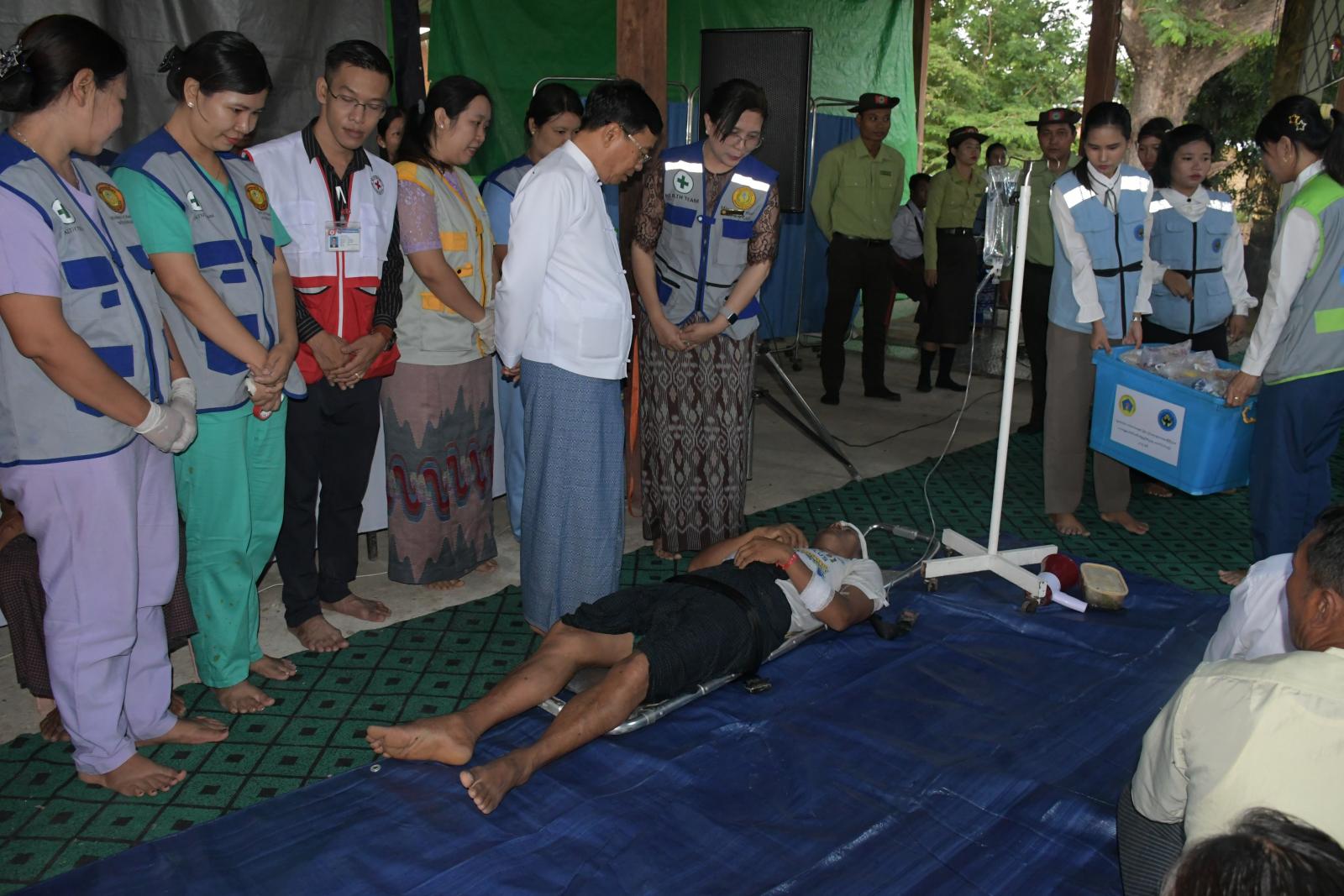ဦးစွာ ရေဘေးသဏ္ဍာန်တူ ဇတ်တိုက်လေ့ကျင့်ခြင်း အဖွဲ့ခေါင်းဆောင်က နေပြည်တော်ကောင်စီဥက္ကဋ္ဌ အား ဇာတ်တိုက်လေ့ကျင့်မှု စတင်ရန် သတင်းပို့တင်ပြပြီး ဇာတ်တိုက်လေ့ကျင့်ခြင်းကို ဆက်လက်ဆောင်ရွက်ရာ ဆော်သြရေးသရုပ်ပြအဖွဲ့မှ စက်လှေဖြင့် မိုးလေဝသ သတင်းများနှင့် ကြိုတင်ပြင်ဆင်ခြင်းများ ဆောင်ရွက်နိုင်ရန် အသံချဲ့စက်ဖြင့် လိုက်လံကြေငြာခြင်း၊ ရှာဖွေကယ်ဆယ်ရေး သရုပ်ပြအဖွဲ့မှ မြစ်တစ်ဖက်ကမ်းရှိ ရေဘေးသင့်ပြည်သူများအား စက်လှေများဖြင့် သွားရောက် ခေါ်ဆောင်ခြင်း၊ ရေနစ်သူကို ကယ်ဆယ်ပေးခြင်း၊ ကူညီကယ်ဆယ်ရေး သရုပ်ပြအဖွဲ့မှ တစ်ဖက်ကမ်းမှ ရေဘေးရှောင်ပြည်သူများနှင့် ကျေးရွာအတွင်းရှိ သက်ကြီးရွယ်အိုများ၊ မသန်စွမ်းများ၊ ကိုယ်ဝန်ဆောင်သည်များကို ကယ်ဆယ်ရေးစခန်းသို့ ပို့ဆောင်ပေးခြင်း၊ ကယ်ဆယ်ရေးစခန်း သရုပ်ပြအဖွဲ့နှင့် ကျန်းမာရေးစောင့်ရှောက်မှု ဆေးခန်းအဖွဲ့မှ ကယ်ဆယ်ရေးစခန်းသို့ ရောက်ရှိလာသည့် ပြည်သူများအား နေရာချထားခြင်း၊ စာရင်းကောက်ယူခြင်း၊ ကျန်းမာရေးစောင့်ရှောက်မှု ပေးခြင်းများကို သရုပ်ပြဇာတ်တိုက်လေ့ကျင့်ခြင်းများ ဆောင်ရွက်ရာ နေပြည်တော်ကောင်စီဥက္ကဋ္ဌနှင့် တက်ရောက်လာကြသူများမှ ကြည့်ရှုအားပေးကြသည်။