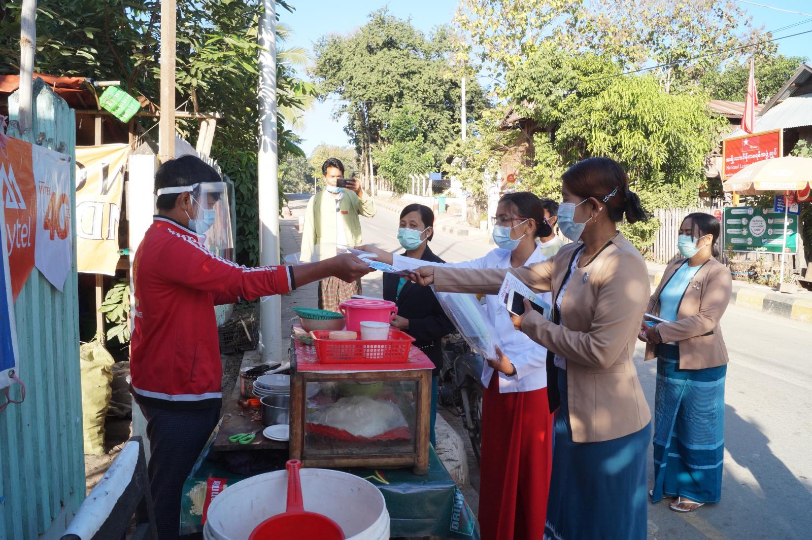 မြို့နယ်ကိုဗစ်-၁၉ ထိန်းချုပ်ရေးနှင့်အရေးပေါ်တုံ့ပြန်ရေးကော်မတီဥက္ကဋ္ဌ မြို့နယ်အုပ်ချုပ် ရေးမှူး ဦးလှမျိုးထွန်း၊ မြို့နယ်ကျန်းမာရေးဦးစီးဌာနမှူး ဒေါက်တာအောင်ဇော်ထွန်း၊ ဌာနဆိုင်ရာများ၊ ရဲတပ် ဖွဲ့ဝင်များ၊ မီးသတ်တပ်ဖွဲ့ဝင်များ၊ ရပ်ကွက်အုပ်ချုပ်ရေးမှူးများ၊ လူမှုရေးအဖွဲ့အစည်းများ ပူးပေါင်း၍ ကိုဗစ်-၁၉ ရောဂါ ကာကွယ်ခြင်းဆိုင်ရာ ကျန်းမာရေး အသိပညာမြှင့်တင်ရေးနှင့် မျက်နှာနှင့် နှာခေါင်းစည်း မဖြစ်မနေ တပ်ဆင်ရေးလှုပ်ရှားမှုကို အဖွဲ့ခွဲ၍ မြို့လယ်လမ်းဆုံ၊ ဗိုလ်ချုပ်လမ်းတစ် လျှောက်နှင့် လူစည်ကားရာနေရာများ၊ စားသောက်ဆိုင်နှင့် ကုန်စုံဆိုင်များတို့တွင် နှာခေါင်းစည်း (Mask) နှင့် မျက်နှာအကာ (Face shield) အခမဲ့ ဝေငှခြင်း၊ ကျန်းမာရေးဝန်ထမ်းများက လက်ကိုင် အသံချဲ့စက်ဖြင့် ပြည်သူများအနေဖြင့် မလိုအပ်ဘဲ အိမ်ပြင်မထွက်ရေး၊ အိမ်ပြင်ထွက်တိုင်း ပါးစပ်နှာခေါင်း စည်းတပ်ဆင်ရေး၊ လူစုလူဝေး နေရာများ ရှောင်ကြဉ်ရေး၊ မကြာခဏ လက်ကိုစနစ်ကျစွာ ဆေးကြောရေးတို့ကို ဆော်ဩခြင်းနှင့် ပြန်ကြားရေးနှင့်ပြည်သူ့ ဆက်ဆံရေးဦးစီးဌာနက ကျန်းမာရေးပညာပေး လက်ကမ်းစာစောင်များ ဖြန့်ဝေခြင်းတို့ကို ဆောင်ရွက်ခဲ့ကြောင်း သိရသည်။