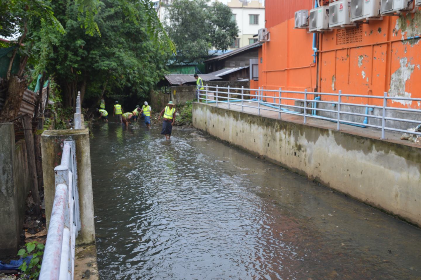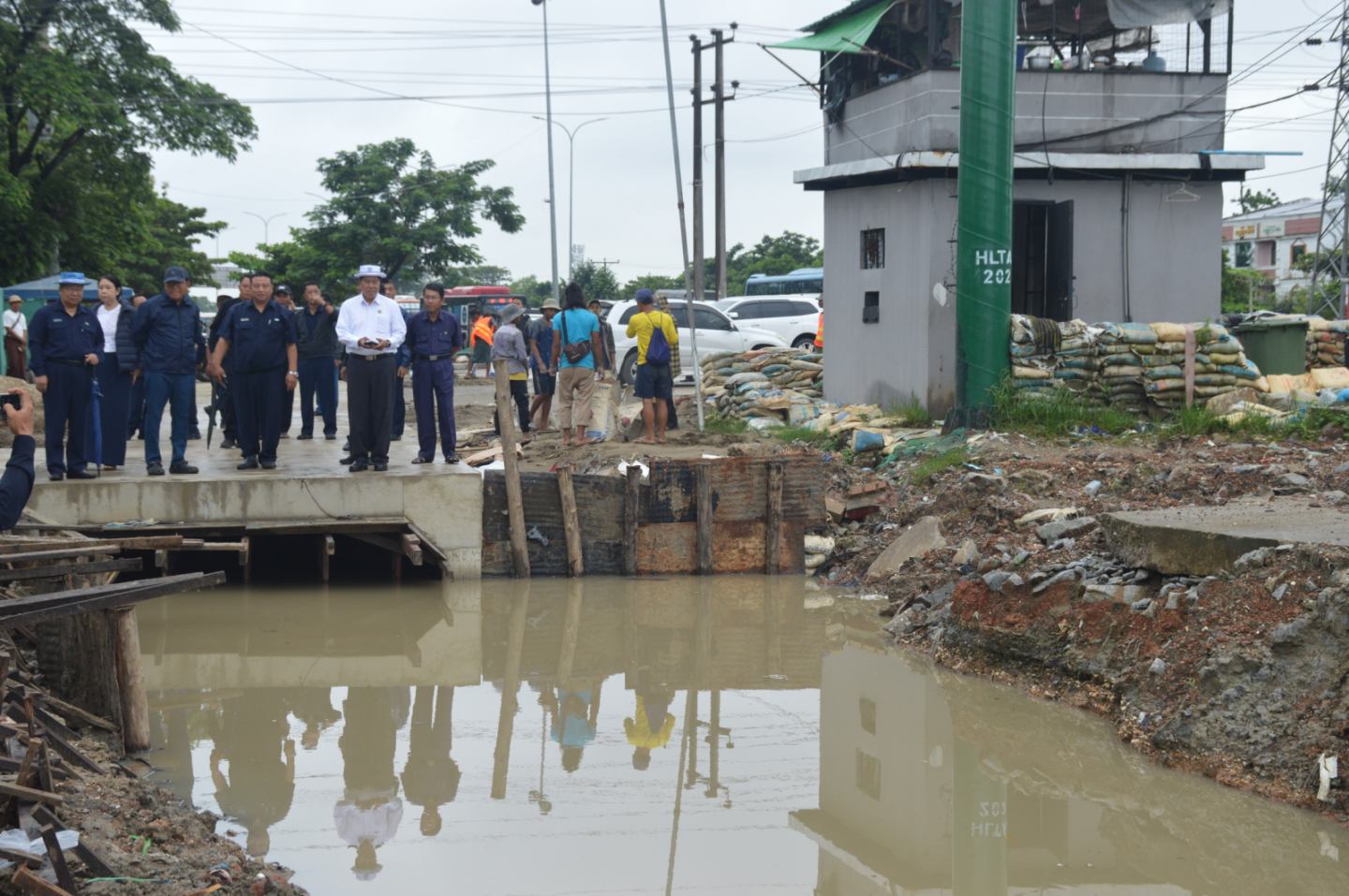 ထို့နောက် မြို့တော်ဝန်နှင့်အဖွဲ့သည် ရန်ကုန်-ညောင်တုန်းကားလမ်းနှင့် တပင်ရွှေထီးလမ်းဆုံတွင် အကျယ် ၁၂ ပေ၊ အနက် ၁၂ ပေ၊ အလျား ၁၆၀ ပေရှိ Box Culvert တည်ဆောက်နေမှု၊ ရန်ကုန်-ညောင်တုန်းလမ်းရေမြောင်း ရေစီးရေလာကောင်းမွန်ရေး ဆောင်ရွက်ထားရှိမှုနှင့် အောင်ဇေယျတံတားဘေး အရှည် ၆၇၇ ပေ၊ အောက်ခြေအကျယ် ၈ ပေ၊ မျက်နှာဝအကျယ် ၁၆ ပေ၊ အနက် ၆ ပေရှိ ဇလားပုံသဏ္ဌာန် အုတ်ရေမြောင်း တည်ဆောက်နေမှုတို့ကို လိုက်လံကြည့်ရှုစစ်ဆေးပြီး လိုအပ်သည်များ မှာကြားဖြည့်ဆည်း ဆောင်ရွက်ပေးသည်။