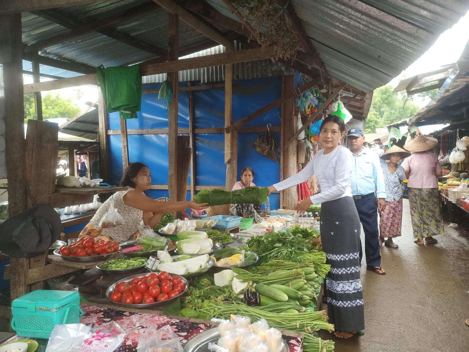 ဆက်လက်၍ ခရိုင်ပတ်ဝန်းကျင်ထိန်းသိမ်းရေးဦးစီးဌာနမှ တာဝန်ရှိသူများ၊ ခရိုင်စည်ပင်သာယာရေးကော်မတီမှ တာဝန်ရှိသူများက ပလတ်စတစ်အစားထိုး အင်ဖက်(၅၀၀)ရွက်၊ PAPEE BAGS (၂၀၀)အိတ်နှင့် “အမှိုက်တွေကိုဘယ်လိုစွန့်ပစ်သင့်သလဲ” အသိပညာပေးလက်ကမ်းစာစောင်များကို ဈေးရောင်း၊ ဈေးဝယ်သူများအား အခမဲ့ဖြန့်ဝေပေးခဲ့ကြောင်း သိရှိရသည်။