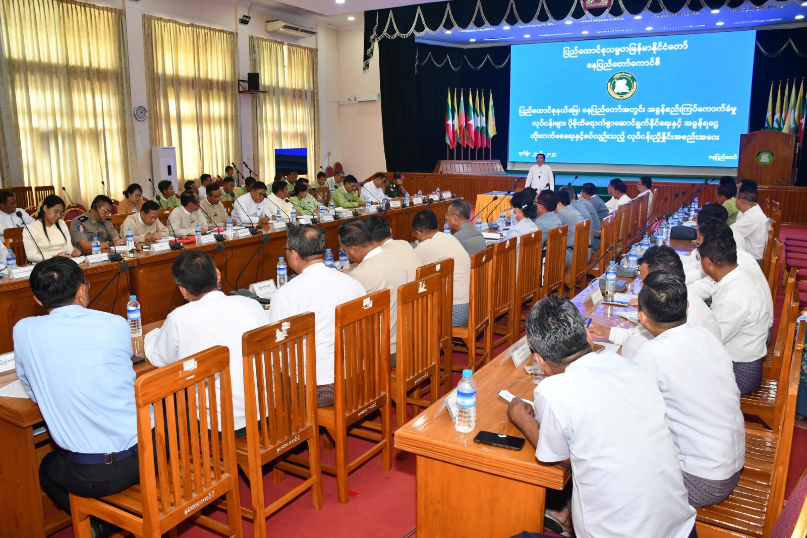 ပြည်ထောင်စုနယ်မြေ၊ နေပြည်တော်၊ ဇမ္ဗူသီရိခန်းမ၌ ယမန်နေ့မွန်းလွဲပိုင်းတွင် နေပြည်တော်အတွင်း အခွန်စည်းကြပ်ကောက်ခံမှုလုပ်ငန်းများ ပိုမိုထိရောက်စွာ ဆောင်ရွက်နိုင်ရေးနှင့် အခွန်ရငွေတိုးတက်စေရေး လုပ်ငန်းညှိနှိုင်းအစည်းအဝေးကိုကျင်းပရာ နေပြည်တော်ကောင်စီဥက္ကဋ္ဌ ဦးသန်းထွန်းဦး၊ နေပြည်တော်ကောင်စီဝင်များ၊ ဌာနဆိုင်ရာများ၊ ခရိုင်/မြို့နယ်စီမံအုပ်ချုပ်ရေးအဖွဲ့ ဥက္ကဋ္ဌများ၊ ဖိတ်ကြားထားသူများ တက်ရောက်ကြသည်။