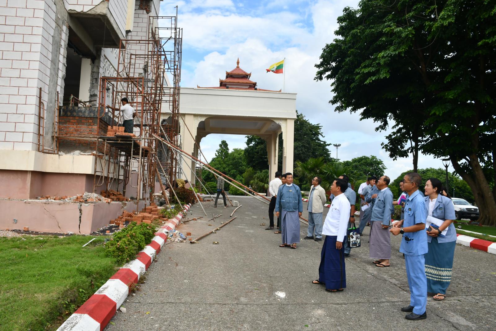ဆက်လက်၍ နေပြည်တော်ကောင်စီဥက္ကဋ္ဌ၊ ဦးသန်းထွန်းဦးသည် ငလျင်ဘေးကြောင့် ထိခိုက်ပျက်စီးခဲ့သော နေပြည်တော်စည်ပင်သာယာရေးကော်မတီ၊ မြို့တော်ခန်းမအား ပြန်လည်ပြုပြင်နေမှုအခြေအနေများကို လှည့်လည်ကြည့်ရှုစစ်ဆေးခဲ့သည်။