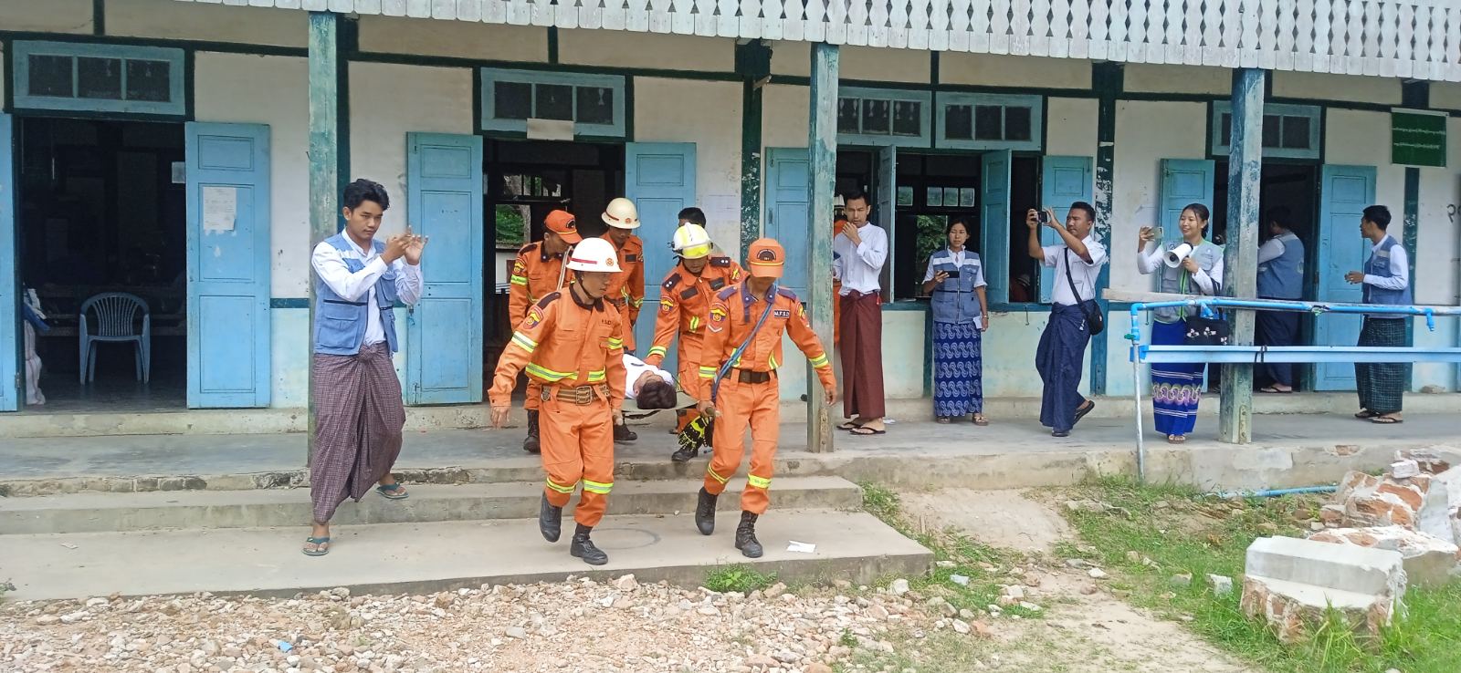 ထို့နောက် မီးသတ်ဦးစီးဌာနနှင့်ကျန်းမာရေးဦးစီးဌာနတို့မှ ဝန်ထမ်းများက ငလျင်လှုပ်နေစဥ် ဝပ်၊ ကာ၊ ကိုင် ပုံစံဖြင့် နေထိုင်မှုပုံစံများ၊ လူနာသယ်ဆောင်ခြင်း၊ အခန်းတွင်းမှအပြင်သို့ ပြေးထွက်ခြင်း၊ ကျန်းမာရေးစောင့်ရှောက်မှုပေးနေပုံများကို သရုပ်ပြသခဲ့ပြီး တက်ရောက်လာသော ကျောင်းသား၊ ကျောင်းသူများက လက်တွေ့သရုပ်ပြ လေ့ကျင့်ခဲ့ကြကြောင်းနှင့် သဘာဝဘေးအန္တရာယ်၊ မီးဘေး၊ ရေဘေး၊ ငလျင်ဘေး၊ မြေပြိုဘေး အသိပညာပေး နံရံကပ်စာစောင်များကို စိတ်ပါဝင်စားစွာ လေ့လာကြည့်ရှုခဲ့ကြကြောင်း သိရသည်။
