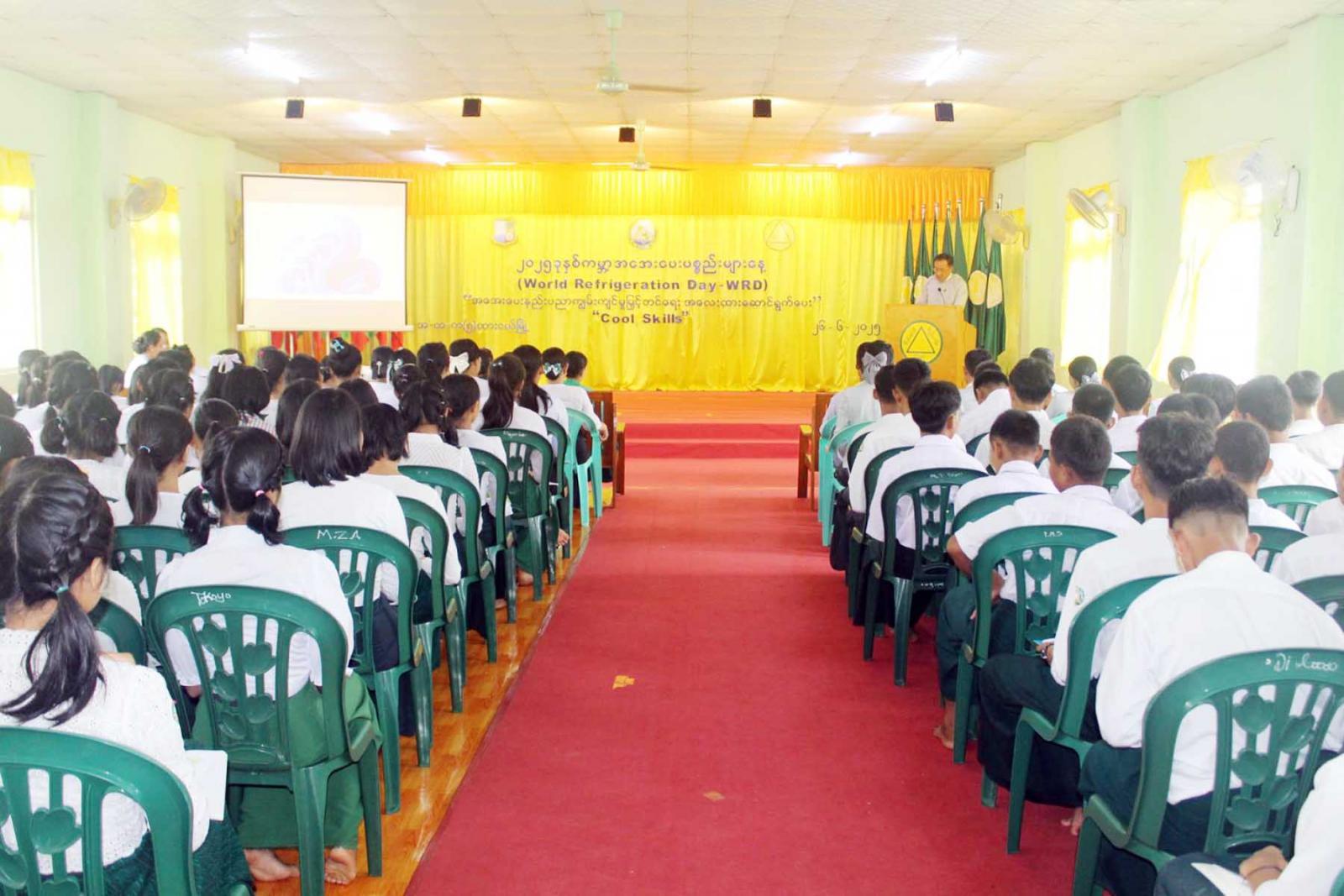 အခမ်းအနားတွင်တို င်းဒေသကြီး ပတ်ဝန်းကျင်ထိန်းသိမ်းရေးဦးစီးဌာန ညွှန်ကြားရေးမှူး ဦးဇော်မင်းအုန်း က ကမ္ဘာ့အအေးပေးပစ္စည်းများနေ့ အထိမ်းအမှတ်အခမ်းအနားများကို ၂၀၁၉ ခုနှစ်မှစ၍ နှစ်စဉ်ကျင်းပလျက်ရှိကြောင်း၊ ယခုနှစ် ဆောင်ပုဒ်မှာ "အအေးပေးနည်းပညာ ကျွမ်းကျင်မှုမြှင့်တင်ရေး အလေးထားဆောင်ရွက်ပေး Cool Skills" ဖြစ်ကြောင်း၊ ကမ္ဘာကြီးကို အေးမြမှု၊ နွေးထွေးမှု၊ သက်သောင့် သက်သာရှိမှုနှင့် ရေရှည်တည်တံ့စေမည့် နည်းပညာများကို ဖန်တီးပေးခဲ့သည့် ထူးခြားစွမ်းရည်ရှိသော လူသားများ၏ကျွမ်းကျင်မှု၊ လက်ဆင့်ကမ်း နည်းပညာရှင်များနှင့် အင်ဂျင်နီယာများ၊ သင်တန်းဆရာများ၊ သုတေသီများ ဆန်းသစ်တီထွင်သူများအားလုံးကို ဂုဏ်ပြုပြီး စဉ်ဆက်မပြတ်ဖွံ့ဖြိုးတိုးတက်ရေးအတွက် အအေးပေးနည်းပညာကျွမ်းကျင်မှု မြှင့်တင်ရေးသည်အရေးပါသည်ကို မီးမောင်းထိုးပြသည့် ရည်ရွယ်ချက်ဖြင့် ကျင်းပလျက်ရှိကြောင်း၊ အအေးပေးစနစ်များသည်လူသားများ၏ ကျန်းမာရေး ကောင်းမွန်စေရန်၊ သက်သောင့်သက်သာ ရှိစေရန်၊ ကုန်ထုတ်လုပ်မှု တိုးတက်အောင် လုပ်ဆောင်နိုင်ရန်နှင့် မရှိမဖြစ်လိုအပ်သော အစားအစာ၊ ဆေးဝါးနှင့်ဒစ်ဂျစ်တယ်ဒေတာအချက်အလက်များဖန်တီးပေးနိုင်သည့်အလျောက် နည်းပညာများတစ်ဆင့်ပြီးတစ်ဆင့် ဖွံ့ဖြိုးတိုးတက်အောင်ဆောင်ရွက်နိုင်ခြင်းအားဖြင့် နောင်လာနောက်သားများအတွက် ပတ်ဝန်းကျင်နှင့်သဟဇာတဖြစ်ပြီး ရာသီဥတုပြောင်းလဲမှု တားဆီးလျှော့ချနိုင်ရေးကို အထောက်အကူဖြစ်စေမည်ဖြစ်ကြောင်း ပြောကြားသည်။