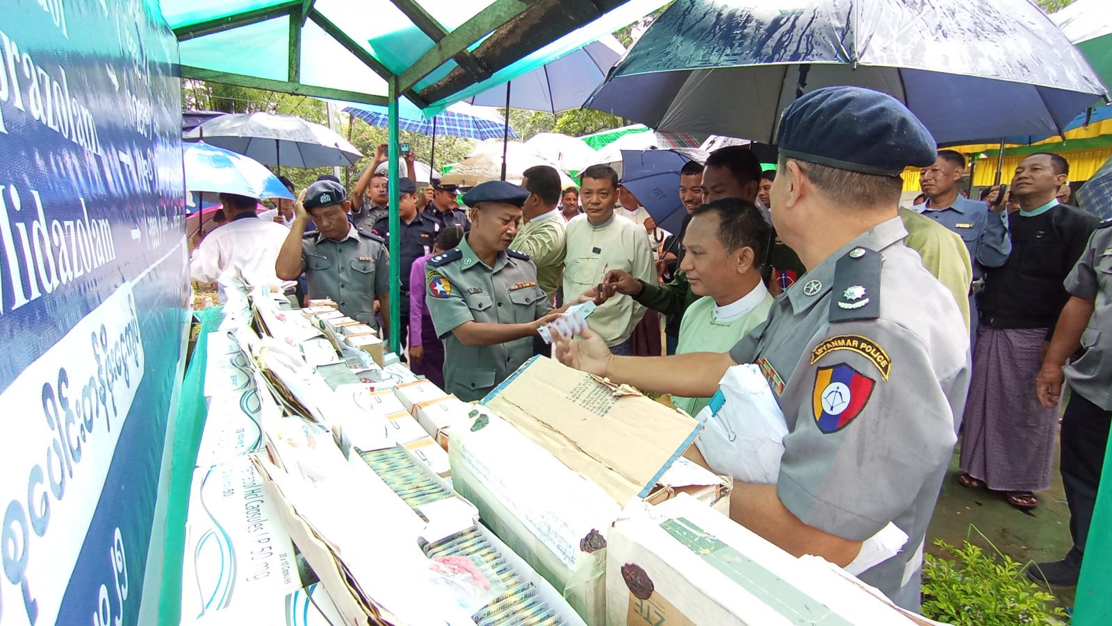 ထို့နောက်တက်ရောက်လာကြသည့် ဌာနဆိုင်ရာများ၊ ဧည့်သည်တော်များမှ မီးရှို့ဖျက်ဆီးမည့် မူးယစ်ဆေးဝါးများအား ကြည့်ရှုလေ့လာခဲ့ကြရာ တမူးခရိုင် ဒုတိယခရိုင်ရဲတပ်ဖွဲ့မှူး ရဲမှူးအောင်ဇော်ထွန်းနှင့်အဖွဲ့မှ ရှင်းလင်းပြောကြားခဲ့ပြီး ဘိန်းဖြူ (၀.၀၂၄) ကီလို၊ စိတ်ကြွရူးသွပ် ဆေးပြား (၆၉၉) ပြား၊ Tramadol (၄၇၉၉၈) တောင့်၊ Alprazolam (၉၈၉၆) ပြား၊Midazolam (၁၉၉၅) ပုလင်း စုစုပေါင်း (၅၀၁.၅၀၇) သိန်းတန်ဖိုးရှိ မူးယစ်ဆေးဝါးများအား မီးရှို့ ဖျက်ဆီးခဲ့သည်။