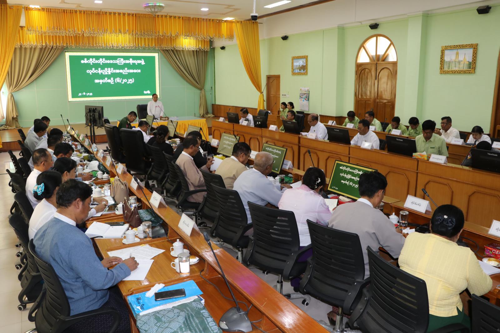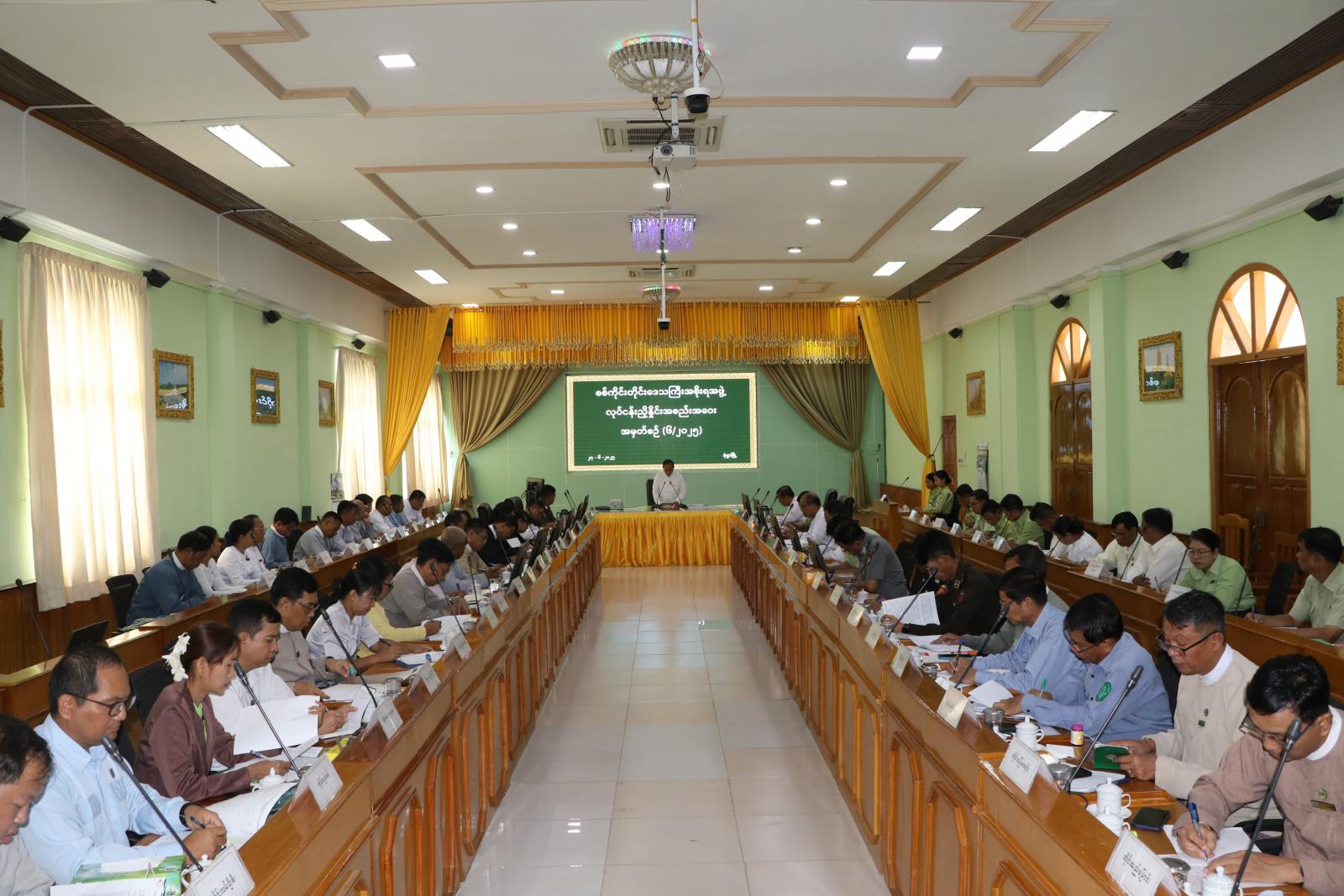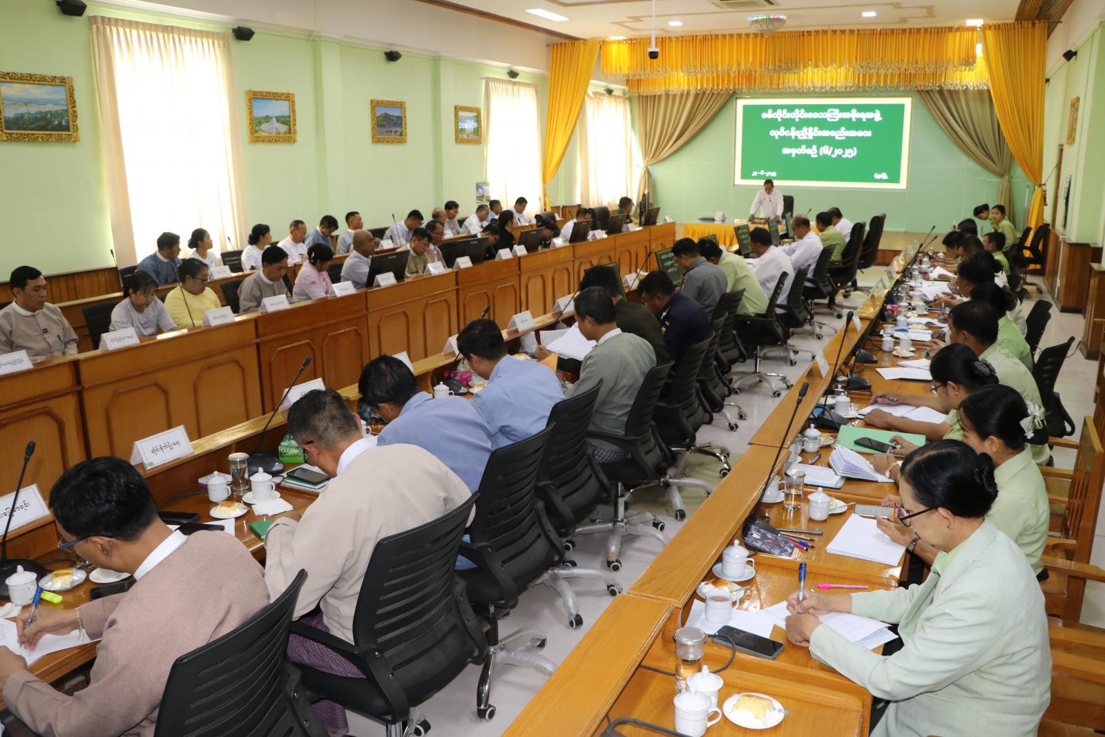 ယင်းနောက် တိုင်းဒေသကြီးအဆင့် ဌာနဆိုင်ရာများက တိုင်းဒေသကြီးအတွင်းရှိ မြို့နယ်များ၌ မိမိတို့ဌာနများအလိုက် ဒေသတည်ငြိမ်အေးချမ်းရေး၊ တရားဥပဒေစိုးမိုးရေး၊ ပညာရေး၊ ကျန်းမာရေး၊ စိုက်ပျိုးရေး၊ မွေးမြူရေး၊ လမ်းပန်းဆက်သွယ်ရေး၊ ဒေသဖွံ့ ဖြိုးတိုးတက်ရေး လုပ်ငန်းများနှင့် MSMEs လုပ်ငန်းများဆောင်ရွက်နေမှု အခြေအနေများ အား Power Point ဖြင့် ရှင်းလင်းတင်ပြသည်။
