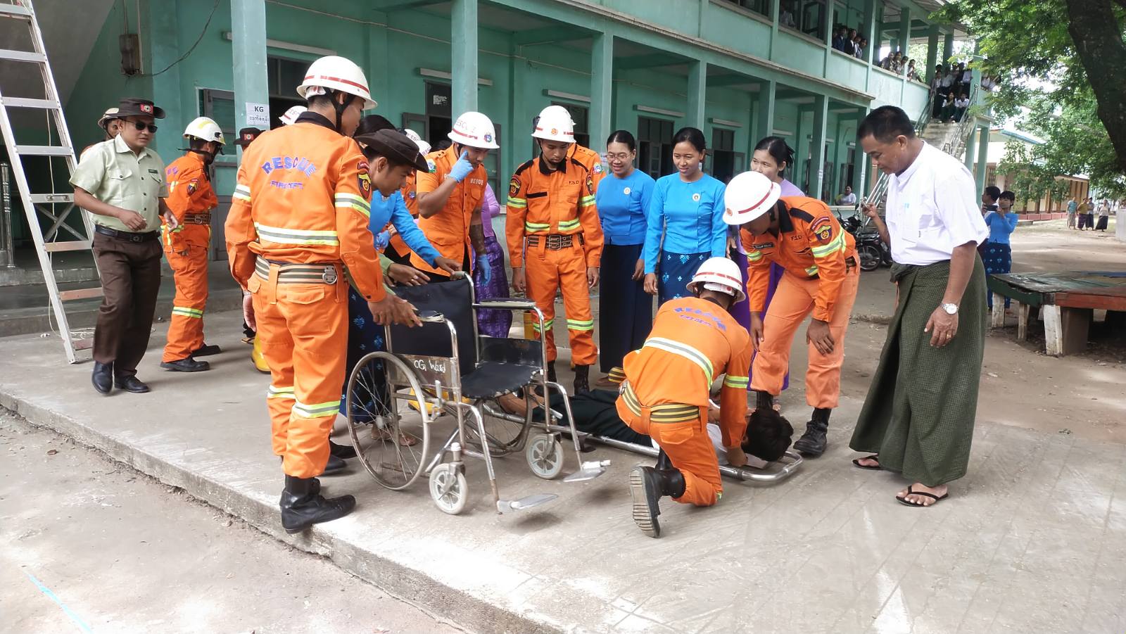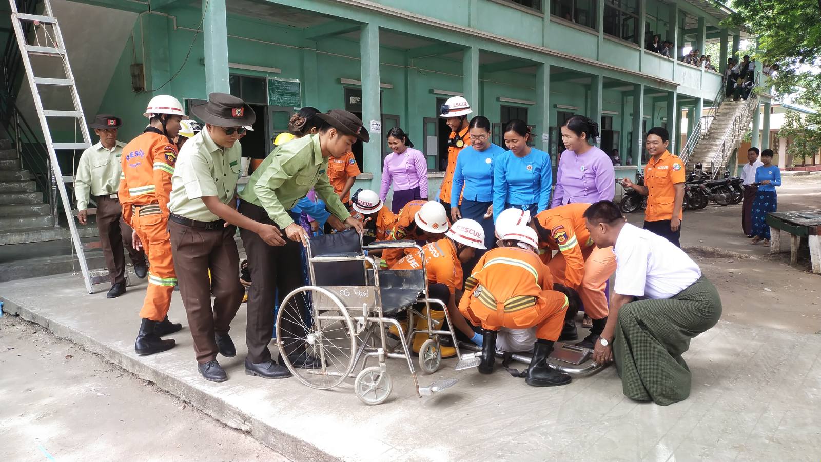 ထို့နောက် သဏ္ဌာန်တူဇာတ်တိုက်လေ့ကျင့်ခြင်းကို ဆောင်ရွက်ခဲ့ရာတွင် မီးသတ်ဦစီးဌာန၊ ကျန်းမာရေးနှင့်ကုသရေးဦးစီးဌာန၊ လူမှုကူညီရေးအသင်းနှင့် NGO အဖွဲ့များ၊ ကျောင်းသား၊ ကျောင်းသူများ ပူးပေါင်း၍ ငလျင်လှုပ်ခတ်ချိန် ကျောင်းသားကျောင်းသူများ ဘေးလွတ်ရာသို့ ထွက်ခွာခြင်း၊ ဒဏ်ရာရရှိသူများအား မီးသတ်တပ်ဖွဲ့၊ ကျန်းမာရေး၀န်ထမ်းများ၊ လူမှုရေးအသင်းအဖွဲ့တို့မှ ယာယီဆေးခန်းသို့ ပို့ဆောင်ခြင်း၊ သူနာပြုများက ကုသပေးခြင်း၊ ဆေးရုံဆေးခန်းသို့ ပို့ဆောင်ပေးခြင်း၊ မီးလောင်မှုအား မီးသတ်ဆေးဘူး၊ ရေစိုအဝတ်တို့ဖြင့် မီးငြှိမ်းသတ်ခြင်းနှင့် Rescue Tool အသုံးပြုမှု သရုပ်ပြသခြင်း၊ မီးငြှိမ်းသတ်ယာဥ်ဖြင့် မီးငြှိမ်းသတ်နိုင်မှု စွမ်းရည်ပြသခြင်းအား မီးသတ်တပ်ဖွဲ့ဝင်များနှင့် ပူးပေါင်းပါဝင် ဇာတ်တိုက်လေ့ကျင့်မှုများ ပြုလုပ်ခဲ့ကြကြောင်း သိရသည်။