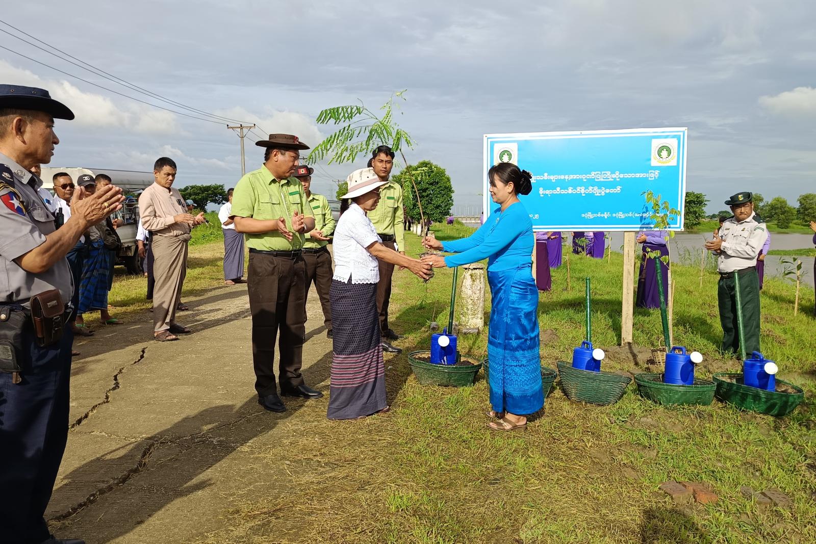 အခမ်းအနားတွင် မြို့နယ်စီမံအုပ်ချုပ်ရေးအဖွဲ့ဥက္ကဋ္ဌ ဦးသန့်ဇော်နှင့် အဖွဲ့ဝင်များ၊ မြို့နယ်အမျိုးသမီးရေးရာအဖွဲ့ဥက္ကဋ္ဌ ဒေါ်ငြိမ်းကြည်ရွှေက စိုက်ပျိုးမည့်သစ်ပင်များပေးအပ်ရာ မြို့နယ်အဆင့်ဌာနဆိုင်ရာအကြီးအကဲများက လက်ခံရယူသည်။