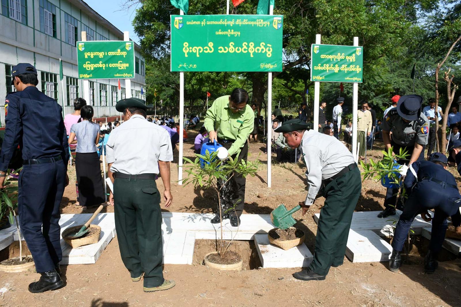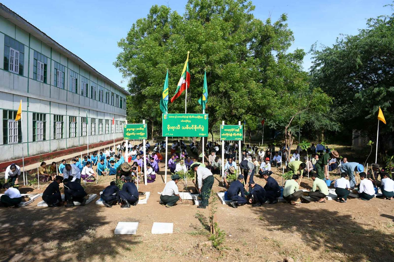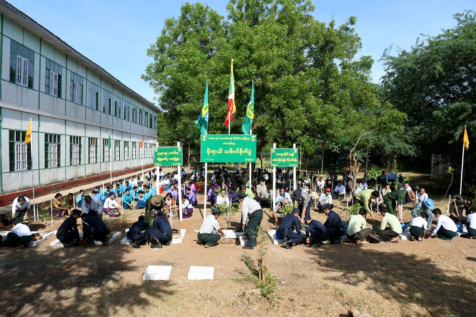 မိုးရာသီ သစ်ပင်စိုက်ပျိုးပွဲ မစတင်မီ ခရိုင်စီမံအုပ်ချုပ်ရေးအဖွဲ့ဥက္ကဋ္ဌ ဦးမင်းမင်းထွန်းနှင့် ခရိုင်စီမံအဖွဲ့ဝင်များ၊ မြို့နယ်စီမံအုပ်ချုပ်ရေးအဖွဲ့ဥက္ကဋ္ဌ ဦးစိုးထွဋ်နှင့် မြို့နယ်စီမံအဖွဲ့ဝင်များ၊ မြို့နယ်သစ်တောဦးစီးမှူး ဦးဇာနည်ဝင်းတို့မှ တာဝန်ရှိသူများအား ပျိုးပင်များ ဖြန့်ဝေပေးခဲ့ကြသည်။ ထို့နောက် ခရိုင်စီမံအုပ်ချုပ်ရေးအဖွဲ့ဥက္ကဋ္ဌ ဦးမင်းမင်းထွန်းနှင့် ခရိုင်စီမံဝင်များ၊ မြို့နယ်စီမံအုပ်ချုပ်ရေးအဖွဲ့ဥက္ကဋ္ဌ ဦးစိုးထွဋ်နှင့် မြို့နယ်စီမံအဖွဲ့ဝင်များ၊ အမျိုးသမီးရေးရာအဖွဲ့ဝင်များ၊ မိခင်နှင့်ကလေးစောင့်ရှောက်မှု ကြီးကြပ်ရေးအဖွဲ့ဝင်များ၊ ခရိုင်/မြို့နယ်အဆင့်ဌာနဆိုင်ရာများ၊ ဆရာ၊ ဆရာမများနှင့် ကျောင်းသား၊ ကျောင်းသူများက သတ်မှတ်နေရာများတွင် ပျိုးပင်များကို စနစ်တကျ စိုက်ပျိုးခဲ့ကြပြီး စိုက်ပျိုးထားသည့် သစ်ပင်များအား မြို့နယ်မီးသတ်တပ်ဖွဲ့ဝင်များက ရေလောင်းခြင်းများ ပြုလုပ်ခဲ့သည်။