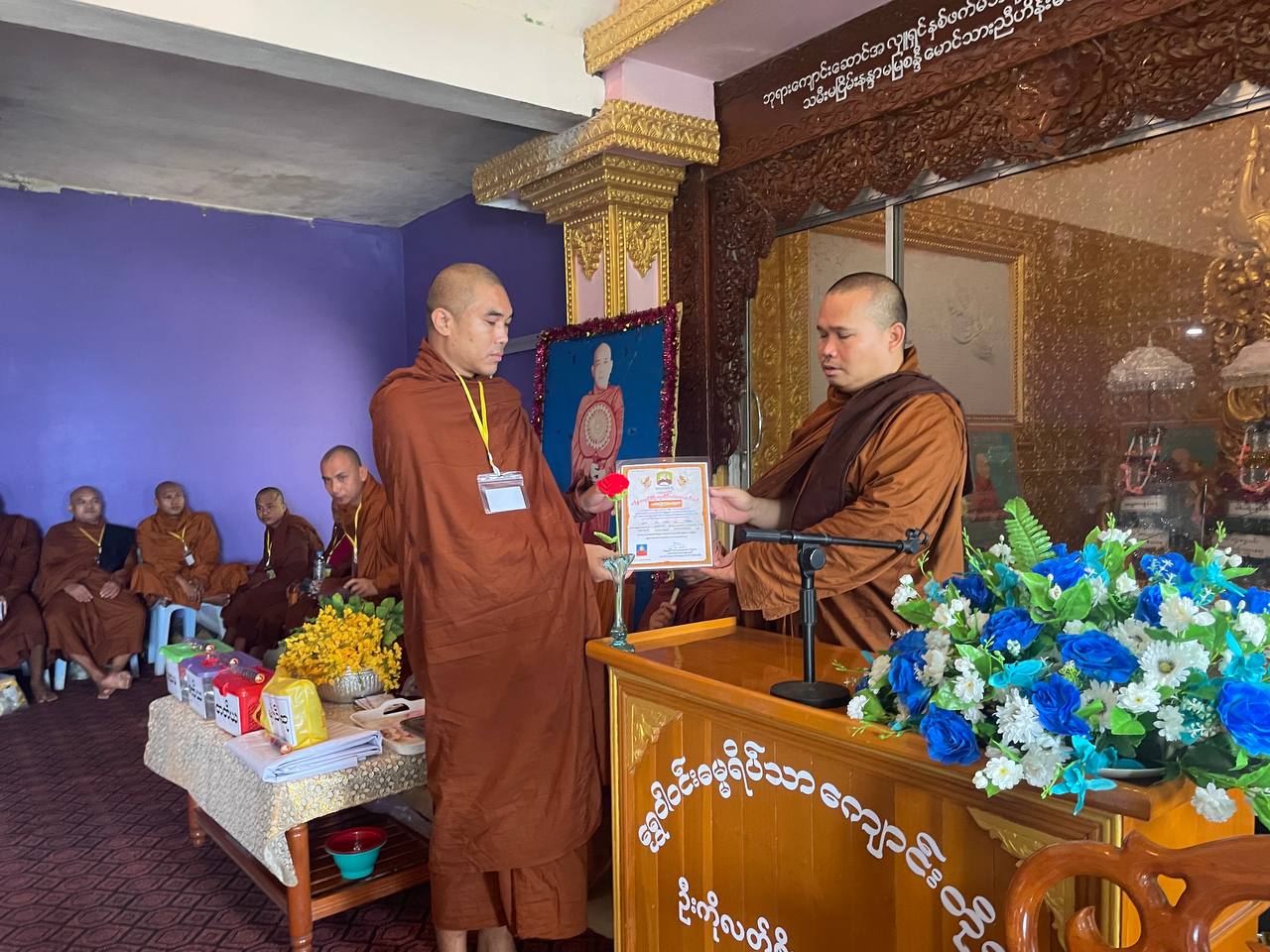 အခမ်းအနားတွင် ရွှေဝါဝင်းကျောင်းတိုက်ဆရာတော်ထံမှ ငါးပါးသီလခံယူဆောက် တည်ခဲ့ကြသည်။ ယင်းနောက် ဆရာတော်သံဃာတော်ရှင်သူမြတ်များအား လှူဖွယ်ဝတ္ထုများ ဆက်ကပ်လှူဒါန်းခဲ့ကြပြီး ပဋိစ္စသမုပ္ပါဒ်ဟောနည်းပြောနည်းပြိုင်ပွဲတွင် ဆုရရှိကြသော သံဃာတော်များအား ဂုဏ်ပြုဆုများချီးမြှင့်သည်။ ဆက်လက်၍ အမြို့မြို့အနယ်နယ်မှ ဆရာတော်၊ သံဃာတော်များ၊ သီလရှင်များနှင့် ကော့သောင်းမြို့ မိုးကုတ်ဝိပဿနာအဖွဲ့ခွဲမှ ယောဂီများအပါအဝင် စုစုပေါင်း သင်တန်းသား ၂၀ ကို သင်တန်းပြီးဆုံးကြောင်းလက်မှတ်များပေးအပ်သည်။