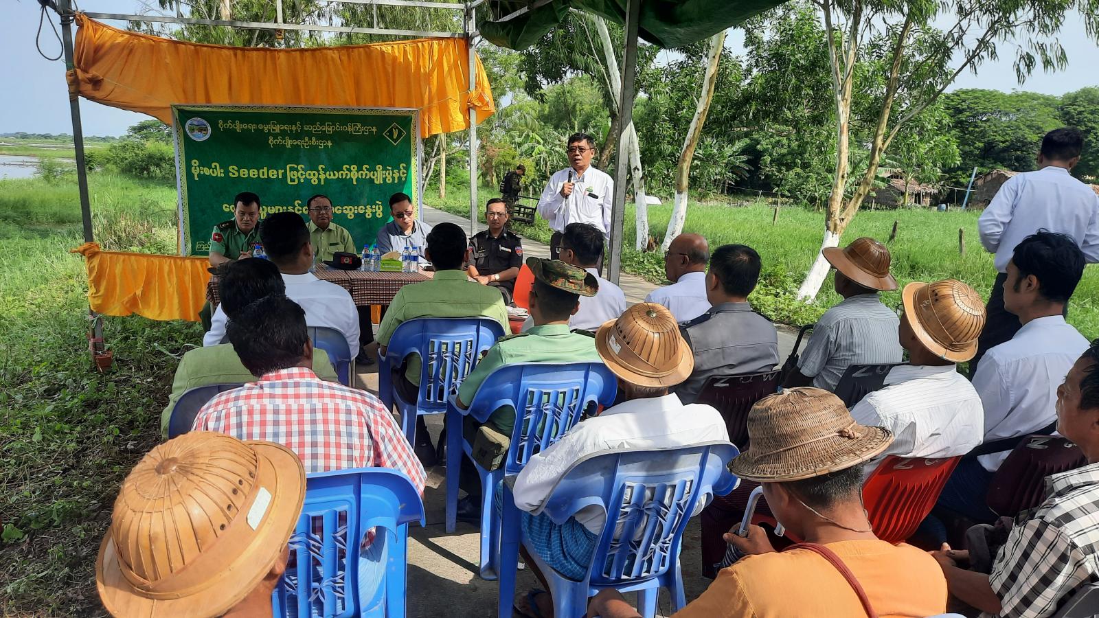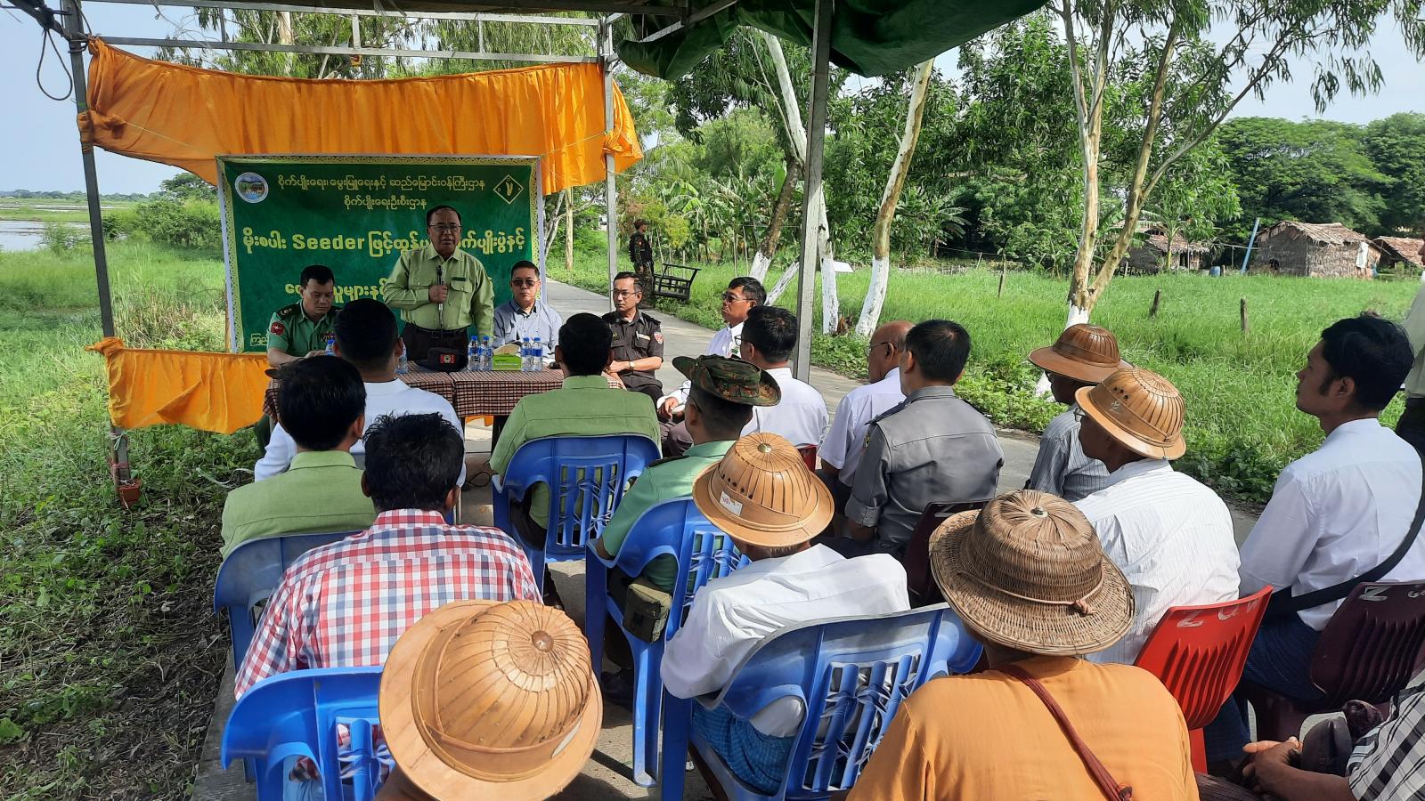 သရုပ်ပြပွဲတွင် ခရိုင်စိုက်ပျိုးရေးဦးစီးဌာန၊ ခရိုင်ဦးစီးမှူး ဦးထိန်လင်းဟန်က တိုက်ရိုက်မျိုးစေ့ချကိရိယာ (Seeder) ဖြင့် စိုက်ပျိုးရာတွင် ကုန်ကျမှုစရိတ်သက်သာစေမည်ဖြစ်ကြောင်း၊ စပါးကောက်ကွက်ပြည့်မီခြင်း၊ အတန်းလိုက်ညီညာစွာ စိုက်ပျိုးသည့်အတွက် ပင်ပွားကောင်းမွန်ခြင်းနှင့် စပါးအထွက်နှုန်းများ ကောင်းမွန်ခြင်း၊ လုပ်အားကုန်ကျမှုစရိတ်များ သက်သာမည်ဖြစ်ကြောင်း၊ အထွက်နှုန်းတိုးလာမည်ဖြစ်ကြောင်း စသည့် ရရှိလာမည့် အကျိုးကျေးဇူးများအား ရှင်းလင်းခြင်း၊ မြို့နယ်စိုက်ပျိုးရေးဦးစီးဌာန၊ မြို့နယ်ဦးစီးမှူး ဦးလှဌေးက မျိုးစေ့ချကိရိယာ၏ နည်းပညာများအကြောင်းကို ရှင်းလင်းပြောကြားခဲ့သည်။ ထို့နောက် တက်ရောက်လာသူများက သိရှိလိုသည်များကို မေးမြန်းခဲ့ရာ သက်ဆိုင်ရာတာဝန်ရှိသူများက ပြန်လည်ဖြေကြားပေးခဲ့ကြောင်း သိရသည်။