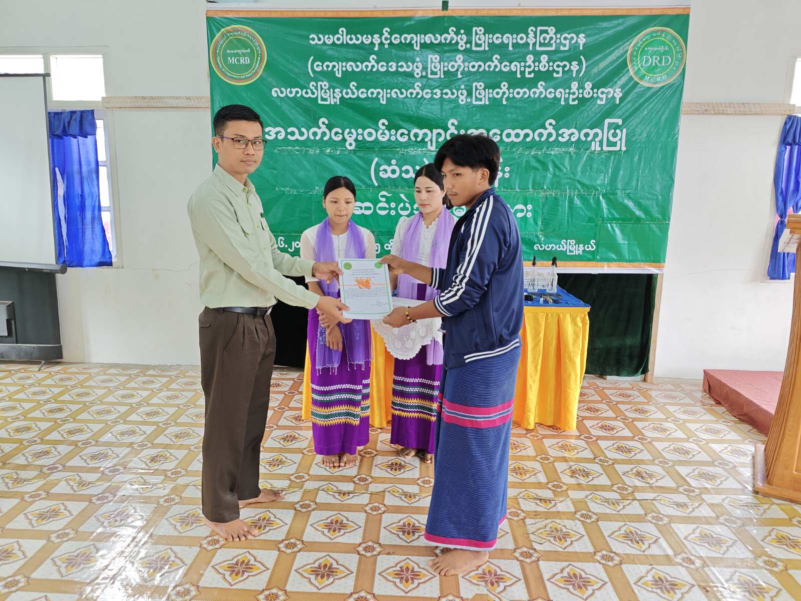 နာဂဒေသစီမံအုပ်ချုပ်ရေးအဖွဲ့ဉက္ကဋ္ဌ ဦးထွန်းထွန်း၀င်းက သင်တန်းသားထူးချွန်ဆုကိုလည်းကောင်း၊ ဒေသသ/မြို့နယ်စီမံအဖွဲ့၀င်များက မြေပြင်ပြန်လည်အသုံးချမည့် လုပ်ငန်းသုံးပစ္စည်းများကိုလည်းကောင်း သင်တန်းသားများထံထောက်ပံ့ပေးအပ်ခဲ့ကြောင်း သိရသည်။