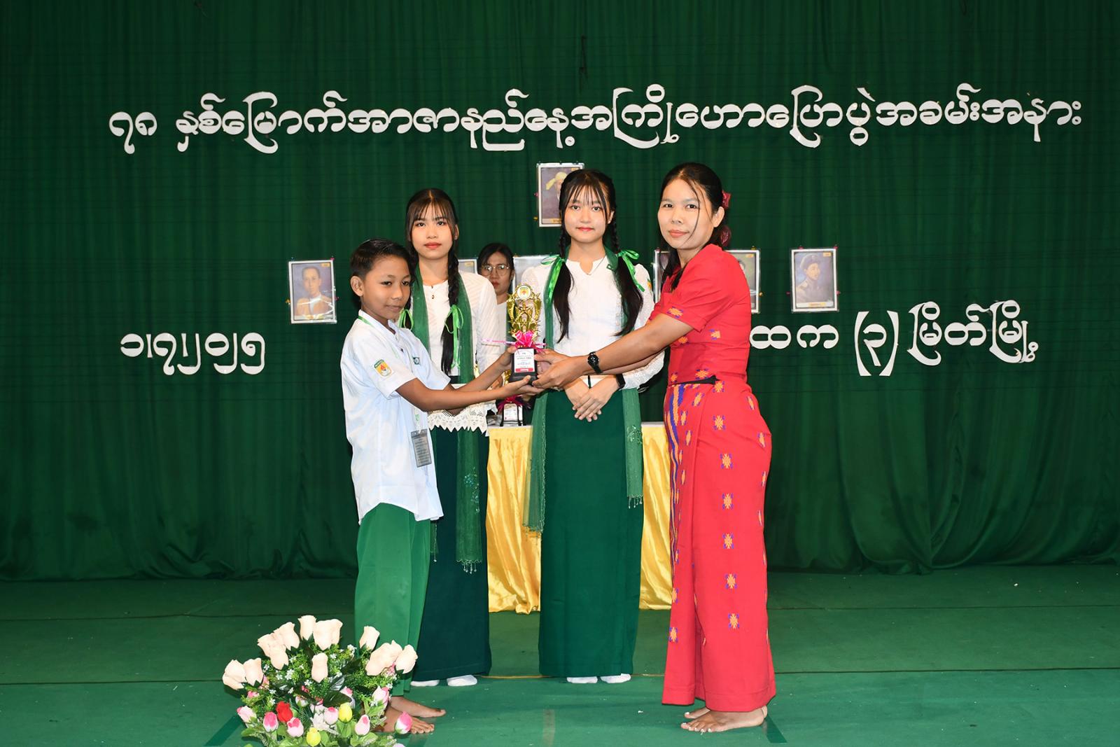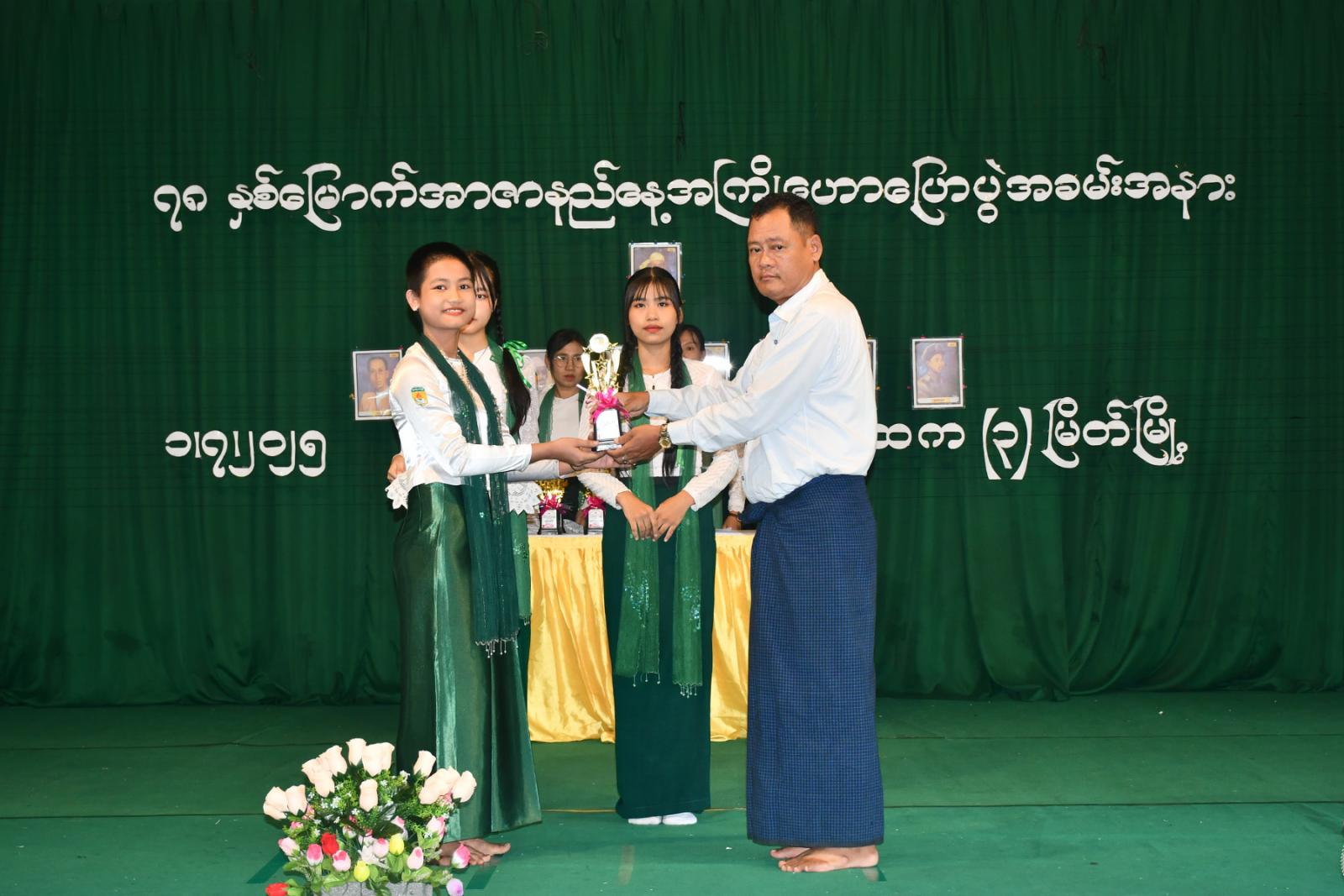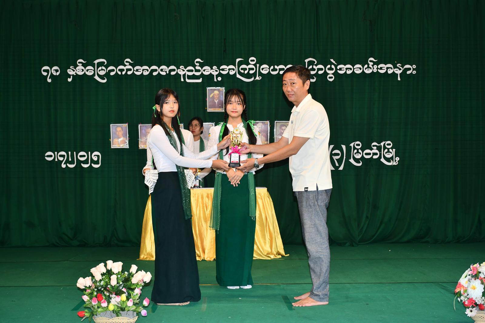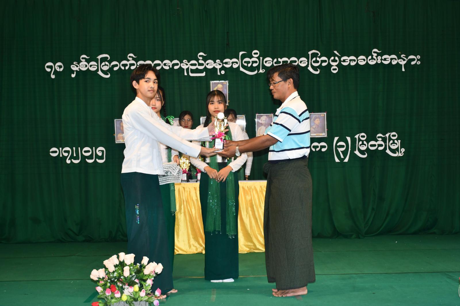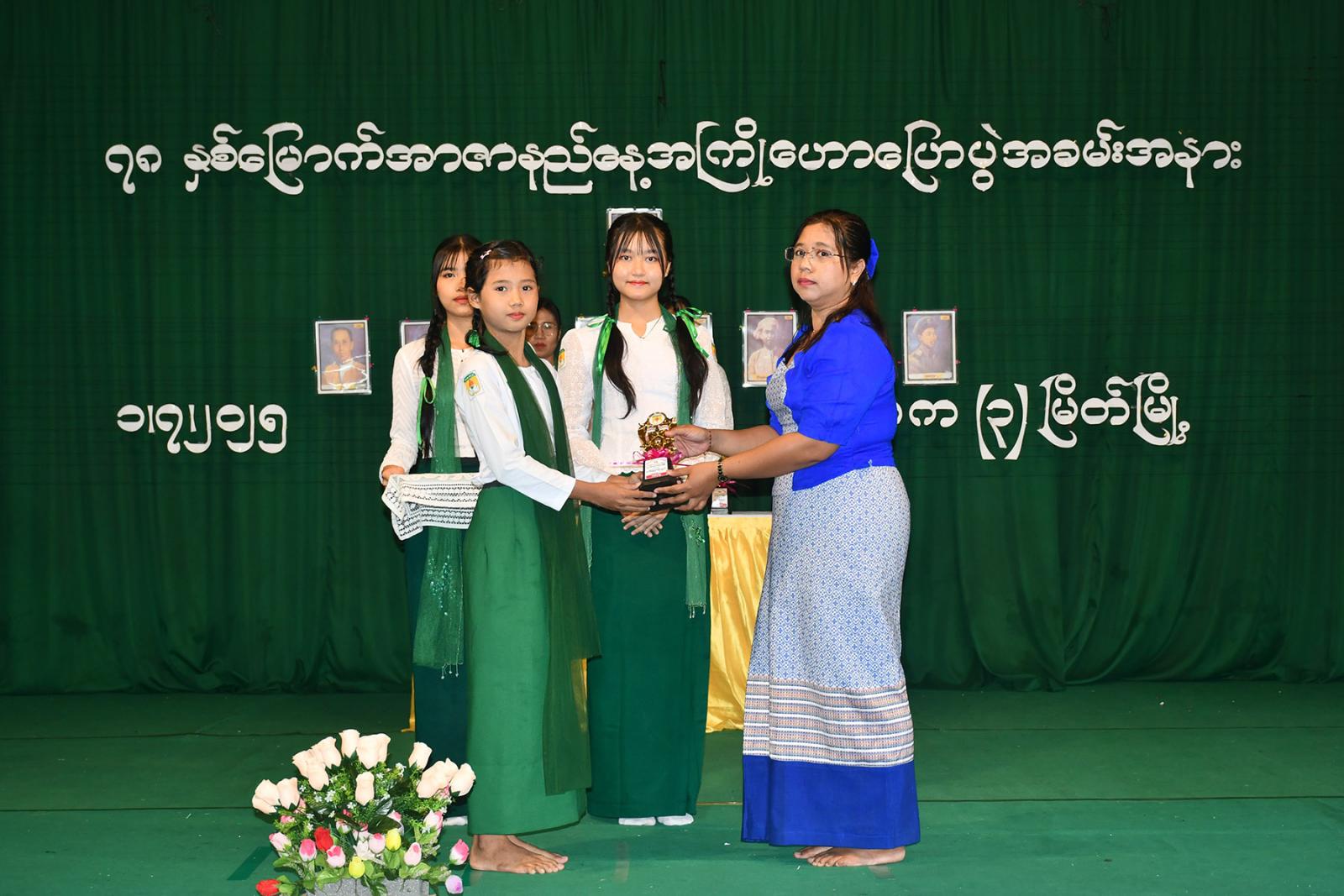 အာဇာနည်နေ့ အထိမ်းအမှတ် အထက်တန်း၊ အလယ်တန်းနှင့် မူလတန်းအဆင့် စာစီစာကုံး ပြိုင်ပွဲ၊ ကဗျာနှင့် ပန်းချီပြိုင်ပွဲတို့တွင် ဆုရရှိကြသော ကျောင်းသား၊ ကျောင်းသူများနှင့် ကျပန်းစကားပြောပြိုင်ပွဲတွင် ဆုရရှိသော ကျောင်းသား၊သူများအား ကျောင်းအုပ်ဆရာမကြီးနှင့် တာဝန်ရှိသူများက ဆုများအသီးသီး ပေးအပ်ချီးမြှင့်ခဲ့ကြပြီး Grade-11 ကျောင်းသား၊ ကျောင်းသူများက “ဇာတိမာန်” သီချင်းဖြင့် ဂုဏ်ပြုသီဆို၍ အခမ်းအနား ရုပ်သိမ်းခဲ့ကြောင်း သိရသည်။