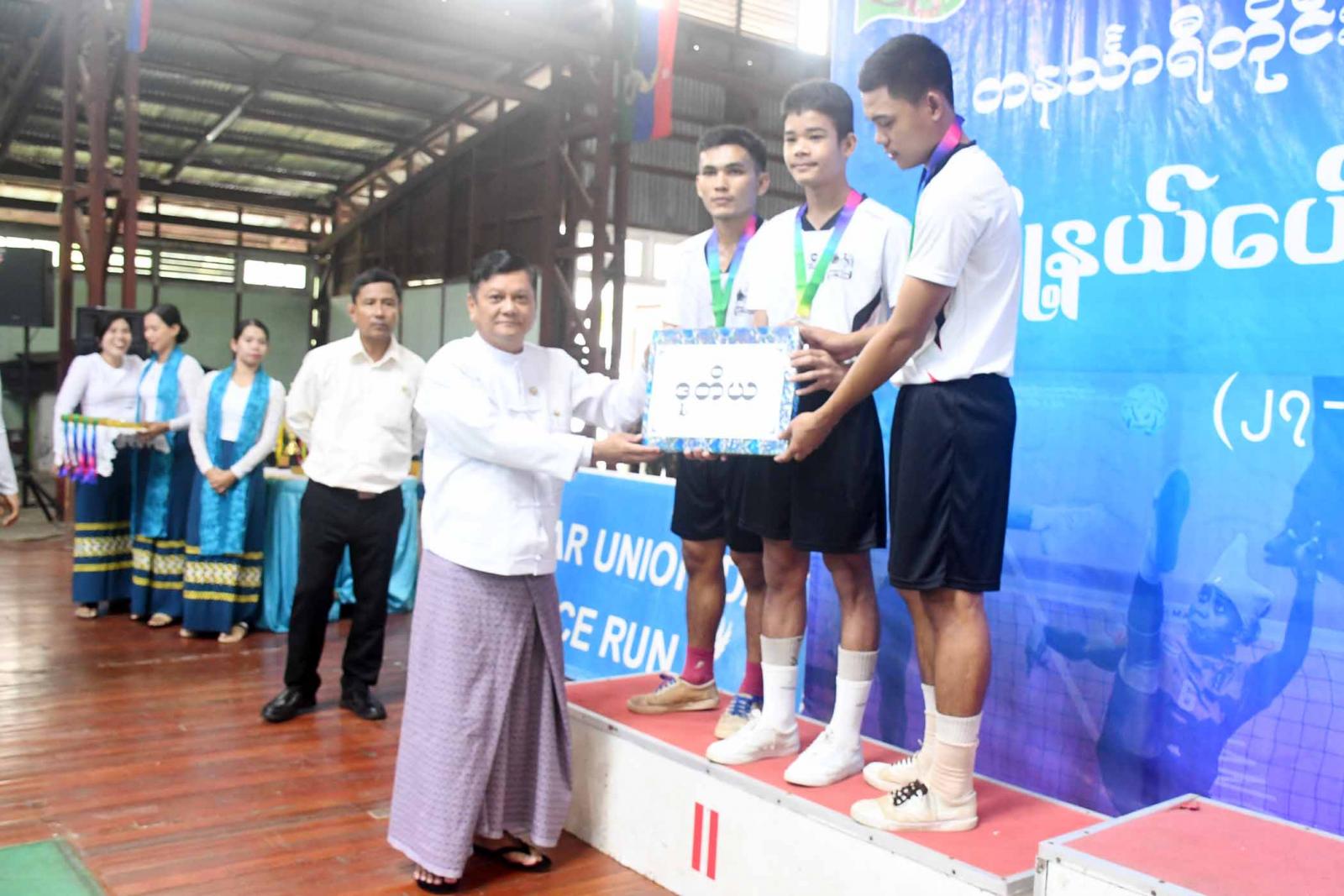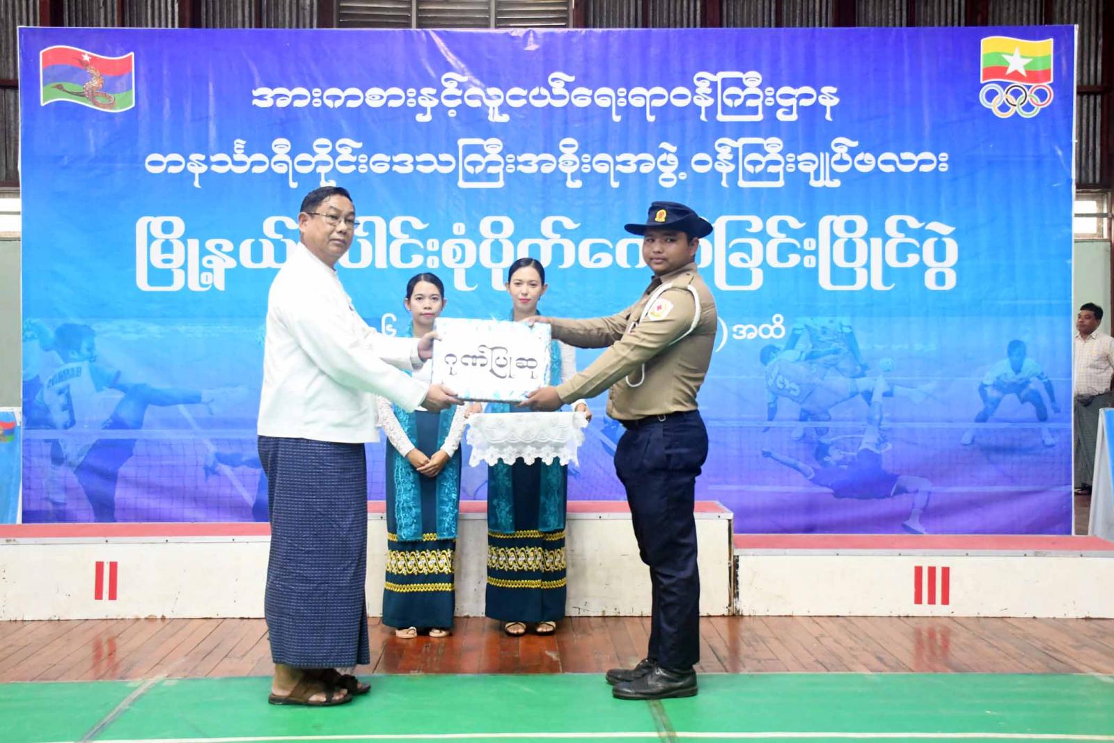ထို့နောက်ဆုချီးမြှင့်ပွဲအခမ်းအနားကို ဆက်လက်ကျင်းပရာ တိုင်းဒေသကြီးလွှတ်တော်ရုံး၊ ဒုတိယညွှန်ကြားရေးမှူးချုပ်က ပွဲစဉ်တစ်လျှောက်ကူညီဆောင်ရွက်ပေးသောကြက်ခြေနီတပ်ဖွဲ့အား ဂုဏ်ပြုဆုချီးမြှင့်ပြီး တိုင်းဒေသကြီးတိုင်းရင်းသားရေးရာဝန်ကြီး ဦးစောမာတင်လူသာက အမျိုးသား (၂) ယောက်တွဲပြိုင်ပွဲတွင် ဒုတိယဆုရရှိသည့် မြိတ်မြို့နယ်အသင်းနှင့် အမျိုးသမီး (၂) ယောက်တွဲ ပြိုင်ပွဲတွင် ဒုတိယဆုရရှိသည့် လောင်းလုံးမြို့နယ်အသင်းအားလည်းကောင်း၊ တိုင်းဒေသကြီးလမ်းပန်းဆက်သွယ်ရေးဝန်ကြီး ဦးအောင်ဇော်လှိုင်က အမျိုးသား (၃) ယောက်တွဲ ပြိုင်ပွဲတွင် ဒုတိယဆုရရှိသည့် မြိတ်မြို့နယ်အသင်းနှင့်အမျိုးသမီး (၃) ယောက်တွဲပြိုင်ပွဲတွင် ဒုတိယဆုရရှိသည့် လောင်းလုံးမြို့နယ်အသင်းအားလည်းကောင်း တစ်ဦးချင်းဆုနှင့် ငွေသားဆုများ အသီးသီး ပေးအပ်ချီးမြှင့်ကြသည်။