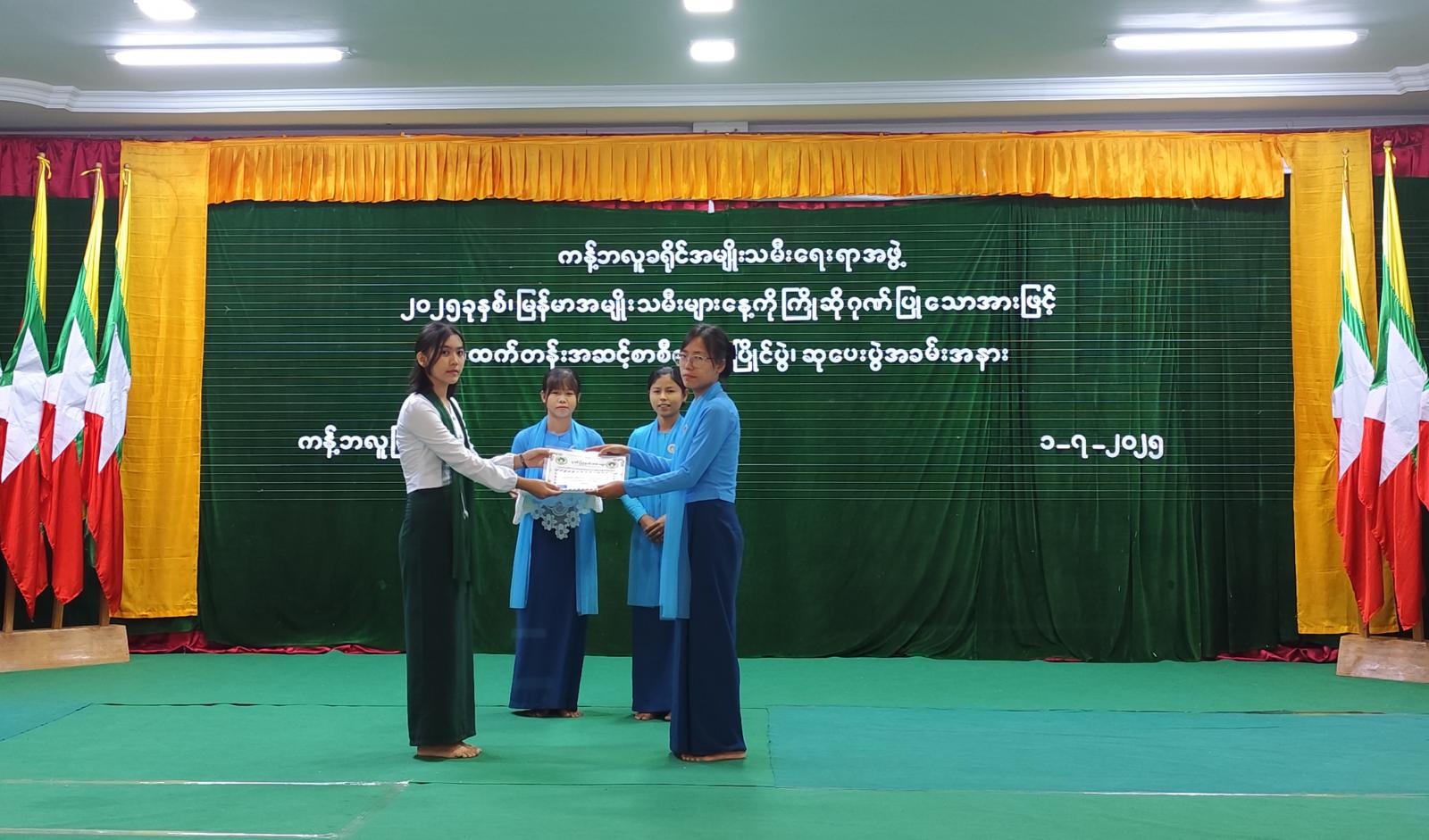 အဆိုပါစာစီစာကုံးပြိုင်ပွဲ ဆုချီးမြှင့်ပွဲတွင် ခရိုင်အမျိုးသမီးရေးရာအဖွဲ့ဝင် ဒေါ်အေးအေးအောင်က ပထမဆုရရှိသူ အ.ထ.က(ခွဲ)ညောင်အိုင်မှ မရှင်းသီရိထွန်းအားလည်းကောင်း၊ ခရိုင်အမျိုးသမီးရေးရာအဖွဲ့ဝင် ဒေါ်အေးနွဲ့ဝင်းက ဒုတိယဆုရရှိသူ အ.ထ.က(ခွဲ)ညောင်အိုင်မှ မနှင်းယဥ်သူကိုလည်းကောင်း၊ ခရိုင်ပညာရေးမှူးရုံးမှ လက်ထောက်ညွှန်ကြားရေးမှူး ဒေါ်နွယ်နီဝင်းနိုင်က တတိယဆုရရှိသူ အ.ထ.က(၁)ကန့်ဘလူမှ မောင်တည်ခန့်အောင်အားလည်းကောင်း၊ မြို့နယ်ပညာရေးမှူး ဒေါ်အေးအေးစိုးက နှစ်သိမ့်ဆုရရှိသူ အ.ထ.က(၁)ကန့်ဘလူမှ မချေစုယဥ်အားလည်းကောင်း၊ ခရိုင်မိခင် နှင့်ကလေးစောင့်ရှောက်မှုကြီးကြပ်အဖွဲ့ဝင် ဒေါ်သီရိစံက နှစ်သိမ့်ဆုရရှိသူ အ.ထ.က(၂)ကန့်ဘလူမှ မမိုးပြည့်ပြည့်ဖြိုးအားလည်းကောင်း၊ မြို့နယ်အမျိုးသမီးရေးရာအဖွဲ့ဝင် ဒေါ်နန္ဒာအောင်က နှစ်သိမ့်ဆုရရှိသူ အ.ထ.က(၁)ကန့်ဘလူမှ မအိမ့်ကြည်ဖြူမောင်တို့အားလည်းကောင်း ဆုများအသီးသီး ချီးမြှင့်ပေးအပ်ကြသည်။