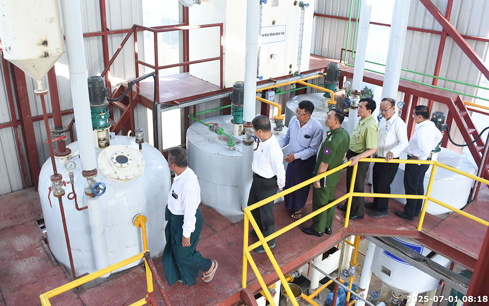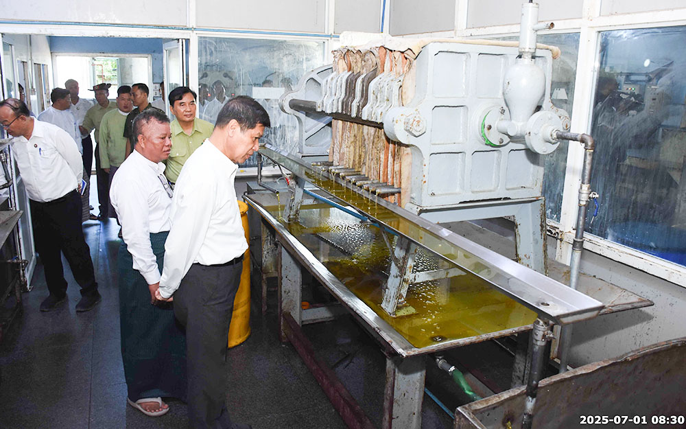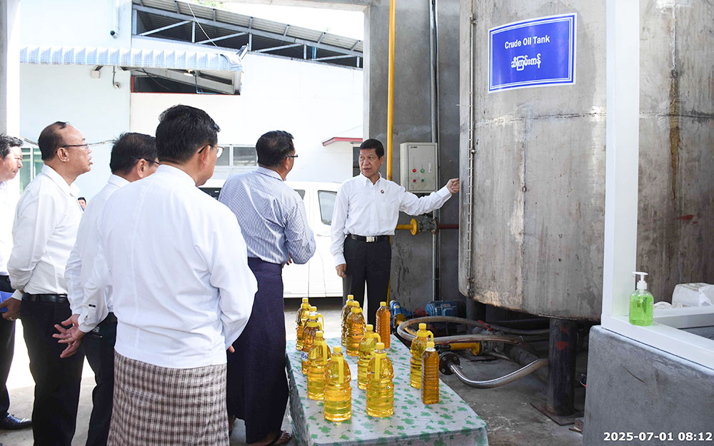 ထိုသို့ ကွင်းဆင်းကြည့်ရှုရာတွင် ကျောက်ဆည်မြို့ အာရှသားဆီစက်လုပ်ငန်းသို့ ရောက်ရှိပြီး မန္တလေးတိုင်းဒေသကြီး ဆီစက်ပိုင်ရှင်များအသင်းဥက္ကဋ္ဌနှင့် အာရှသားဆီစက် လုပ်ငန်းရှင်တို့က ဆီသန့်စင်စက် (Refine Machine) အား ဝယ်ယူတပ်ဆင်ပြီးစီးမှုနှင့် ဆီသန့်စင်ထုတ်လုပ်နေမှု၊ မြန်မာနိုင်ငံမှ စိုက်ပျိုးထွက်ရှိသည့် ဆီထွက်သီးနှံများမှ ထွက်ရှိသည့် ပဲပုပ်ဆီ၊ ပန်းနှမ်းဆီ၊ နှမ်းဆီ၊ မြေပဲဆီ၊ နေကြာဆီ၊ ဝါစေ့ဆီ၊ မုန်ညင်းဆီ ကုန်ကြမ်းများကို နိုင်ငံတကာအဆင့်မီ သန့်စင်ပြီး ဆီထုတ်လုပ်နိုင်မှုနှင့် တစ်နေ့လျှင် ၃၀၀၀ ပိဿာအထိ သန့်စင်ထုတ်လုပ်ပေးနိုင်မည့် အခြေအနေများ၊ မြေပဲဆီထုတ်လုပ်နေမှု အဆင့်ဆင့်နည်းစဉ်များကိုလည်းကောင်း၊ လုပ်ငန်းများ ဆက်လက်တိုးချဲ့နိုင်ရန် စီစဉ်ဆောင်ရွက်နေမှု အခြေအနေများကို လည်းကောင်း ရှင်းလင်းတင်ပြရာ တိုင်းဒေသကြီးဝန်ကြီးချုပ်က ပြည်တွင်းစားသုံးဆီ ဖူလုံမှုရှိစေရေး၊ ဆီထွက်သီးနှံပန်းတိုင် ရည်မှန်းချက်များ ပြည့်မီရေး၊ ပြည်ပသွင်းကုန်လျှော့ချပြီး ပြည်ပပို့ကုန်များ တင်ပို့နိုင်ရေး ပြည်တွင်းထုတ်လုပ်နိုင်မှု ပိုမိုတိုးတက်လာအောင် ဝိုင်းဝန်း ကြိုးပမ်းဆောင်ရွက်ကြရမည်ဖြစ်ပါကြောင်း ပြောကြားပြီး ရှင်းလင်းတင်ပြမှုများအပေါ် လိုအပ်သည်များကို ပေါင်းစပ်ညှိနှိုင်းဖြည့်ဆည်းဆောင်ရွက်ပေး၍ လုပ်ငန်းလည်ပတ် နေမှုများကို လှည့်လည်ကြည့်ရှုခဲ့သည်။