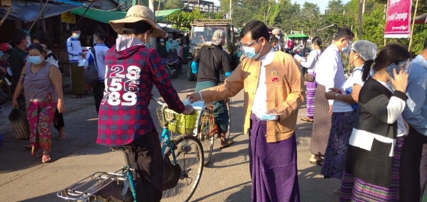 ရန်ကုန်တိုင်းဒေသကြီး၊ မြောက်ပိုင်းခရိုင်၊ လှိုင်သာယာ(အရှေ့ပိုင်း)မြို့နယ်အတွင်း ကိုဗစ်−၁၉ ရောဂါ ကာကွယ် ထိန်းချုပ်ရေး နှာခေါင်းစည်းနှင့် မျက်နှာကာ စနစ်တကျ မဖြစ်မနေတပ်ဆင်ရေး လူထုလှုပ်ရှား မှု စီမံချက်အဖြစ် ယမန်နေ့ နံနက်(၇)နာရီအချိန်က လူစည်ကားရာ ညောင်ရွာစျေးတွင် တာဝန်ရှိသူများ က ဆောင်ရွက်ခဲ့သည်။